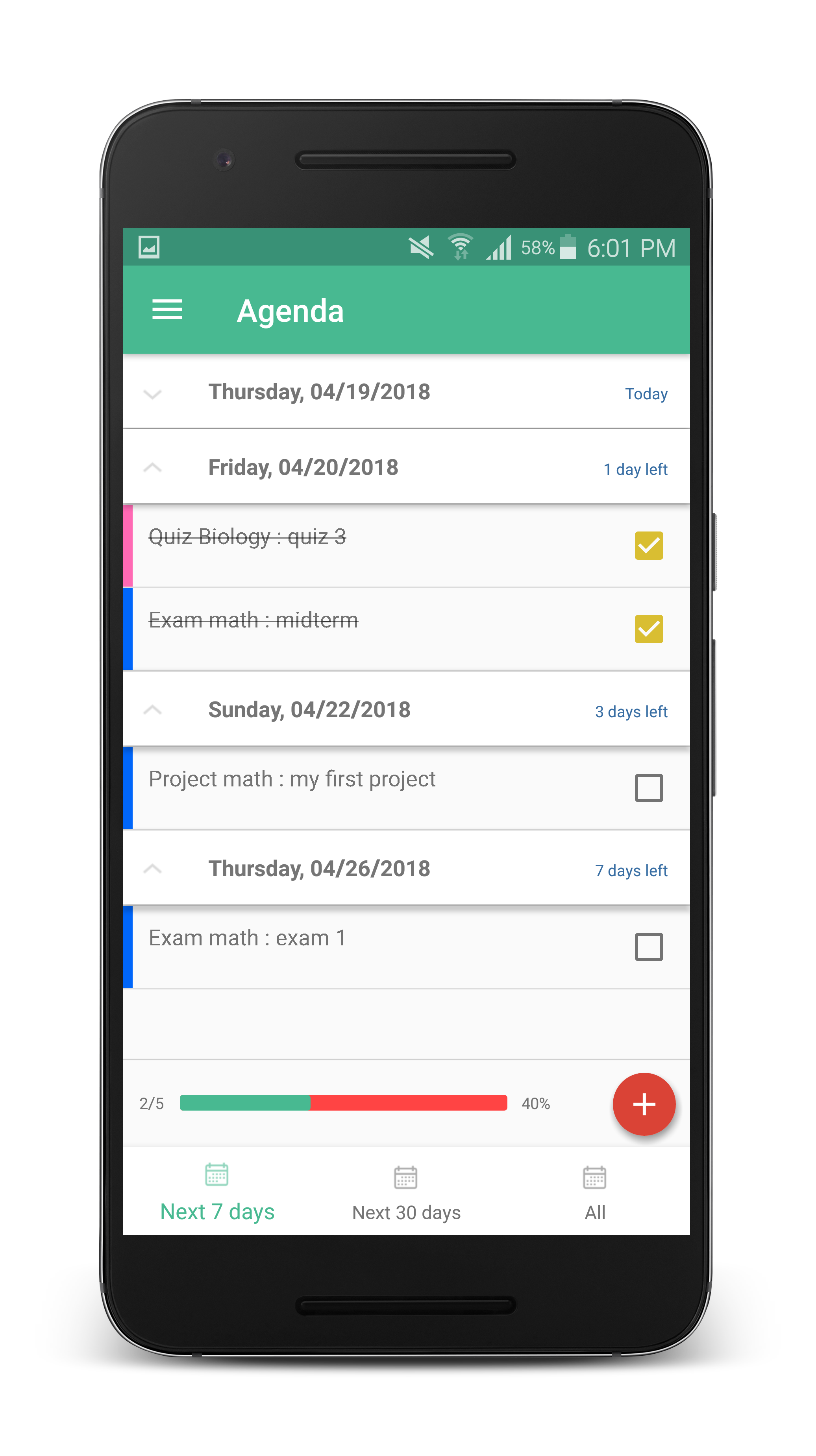 The app helps organize student's studying requirements . Both students of schools and universities can benefit from this organizing agenda. 1-It allows them to save the dates of their examinations as a reminder for them so that they would not fall short of studying ahead of time. 2-They can save their to-do tasks too like homework and projects and when successfully getting them done, they simply tap the checkbox. 3-They can then witness what was achieved and feel some sort of relief and motivation to keep going with achieving the next tasks and what wasn't so and stay on track with time, deadlines and what need to be done.