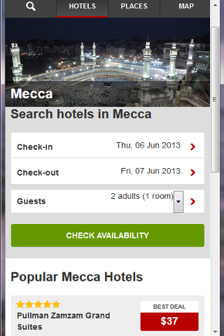 Going for a business trip or vacation or pilgrimage to the Holy Land of Mecca? Looking for comfortable hotel accommodation - budget hotels or luxury 5 star hotels in Mecca or Saudi Arabia? Look no further! Hotels Mecca app gives you hotel deals that save you up to 80% even for some last minute hotel room bookings. There is no fee, no mark-up and this app is FREE to use. To get the best hotel rates every time, simply search by location, date and number of guests and Hotels Mecca quickly finds you the best hotel discounts in Mecca. Features include: • Simple search by location, dates and guests • “Around Me” search to find what is available around you at that exact moment and location • Search results can be viewed two ways - on a map or in a list format • Interactive map with zoom in, zoom out, and swipe to reveal more surrounding hotels • View all hotel details, guest ratings, images and features the hotel offers • Comparison table for all hotels and the best hotel rates available for all our partner hotel booking sites • Refine your search by price, star ratings, areas, hotel features and more • Book online with our partner websites by simply clicking “book” on your hotel of choice • Big image gallery • Apps in 41 languages • The only hotel accommodation app that allows you to search for the best hotel deals in Mecca throughout: www.Agoda.com, www.Expedia.com, www.booking.com lastminute.com priceline.com hotels4u.com hostelbookers.com laterooms.com easytobook.com venere.com Hotelclub.com holidayinn.com Marriott Skoosh Getaroom Crowne Plaza One search and our app will search all the listed hotels and give you the best hotel prices in one screen for all the deals. Besides hotels in Mecca, you can also search for other popular hotels in countries worldwide. Hostel and motel listing is also in our app. Book your room now! Or download this free handy traveler's accommodation app into your android smartphones or devices for future use. Online hotel bookings have never been this easy before!