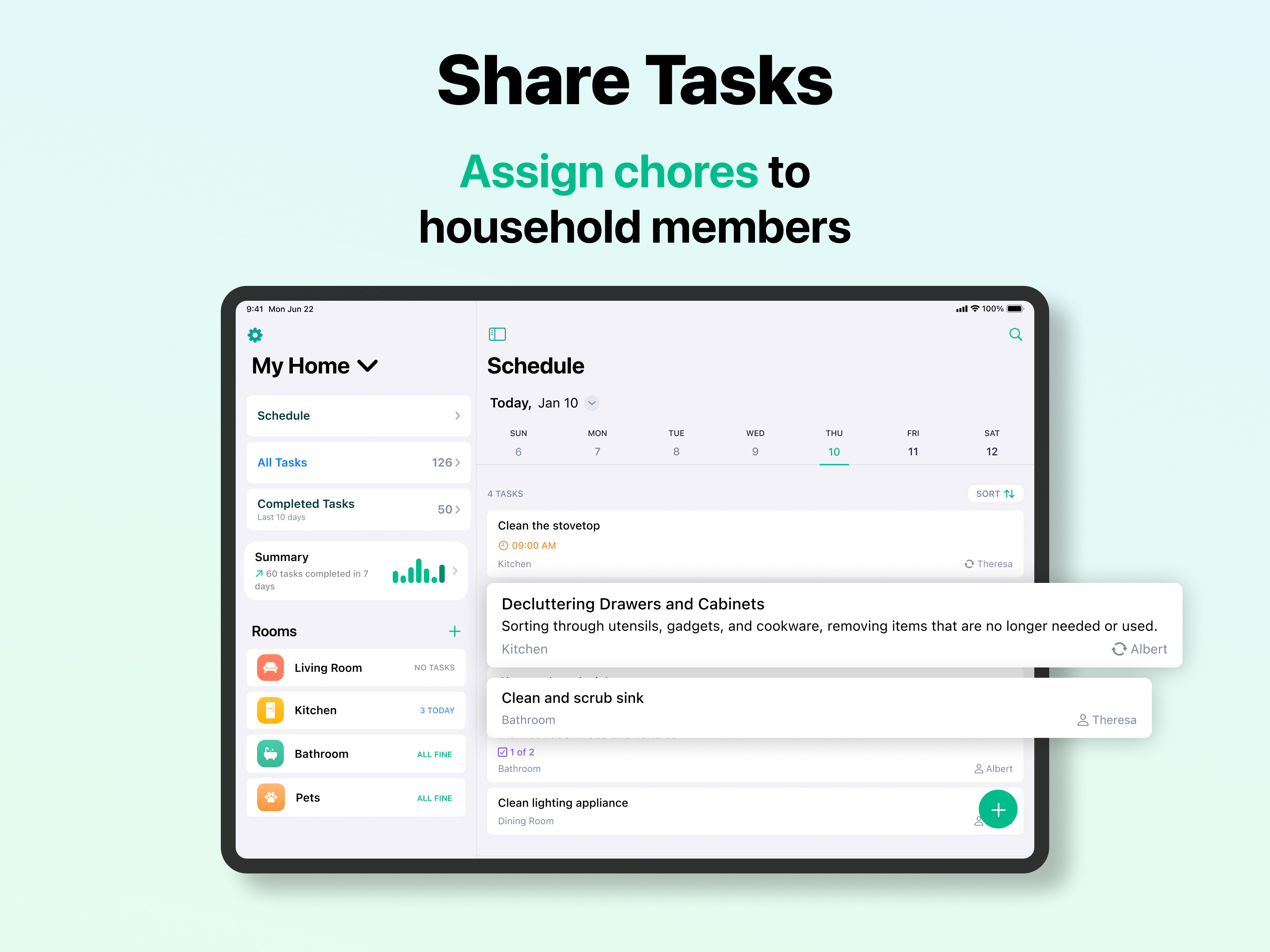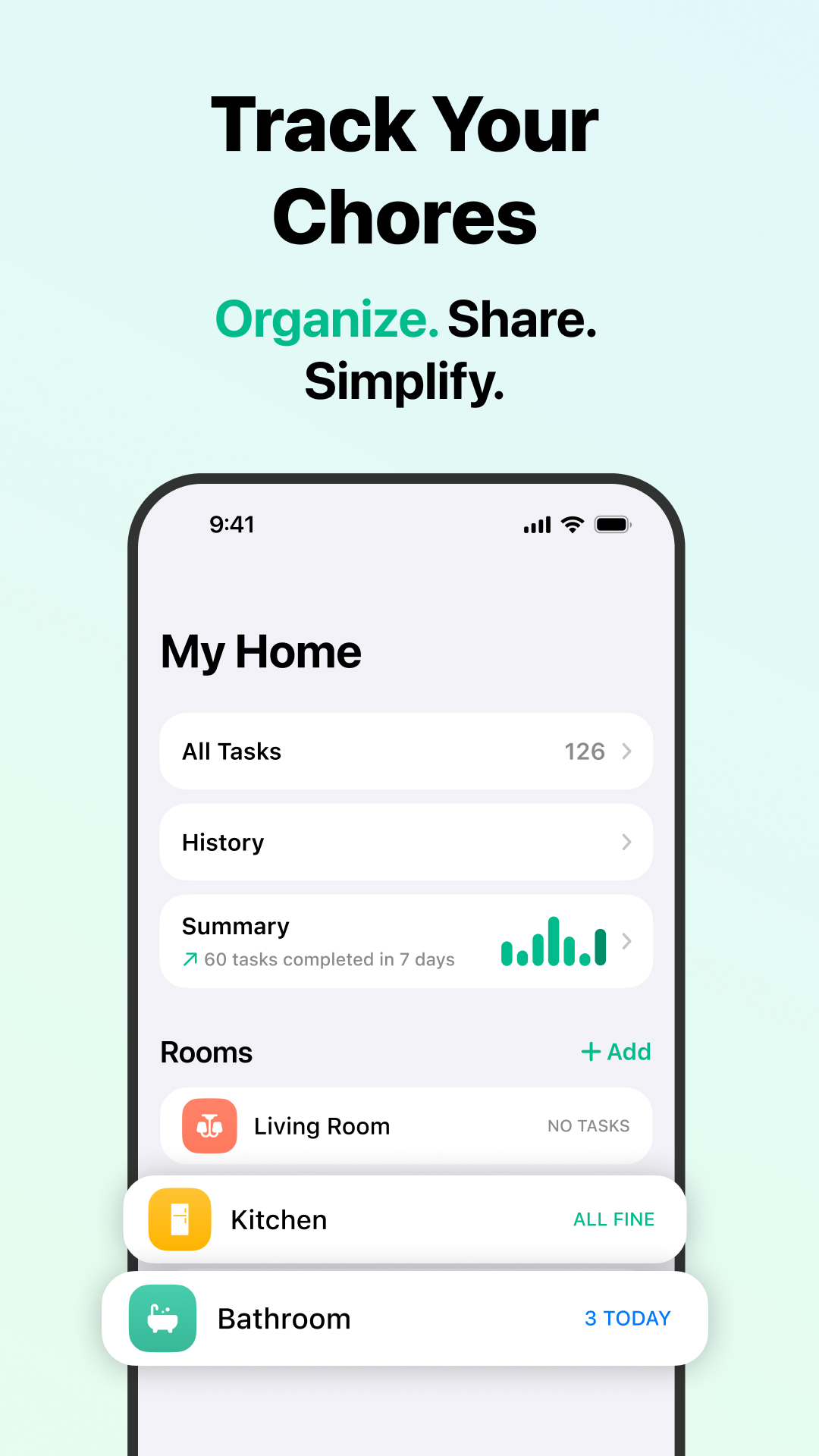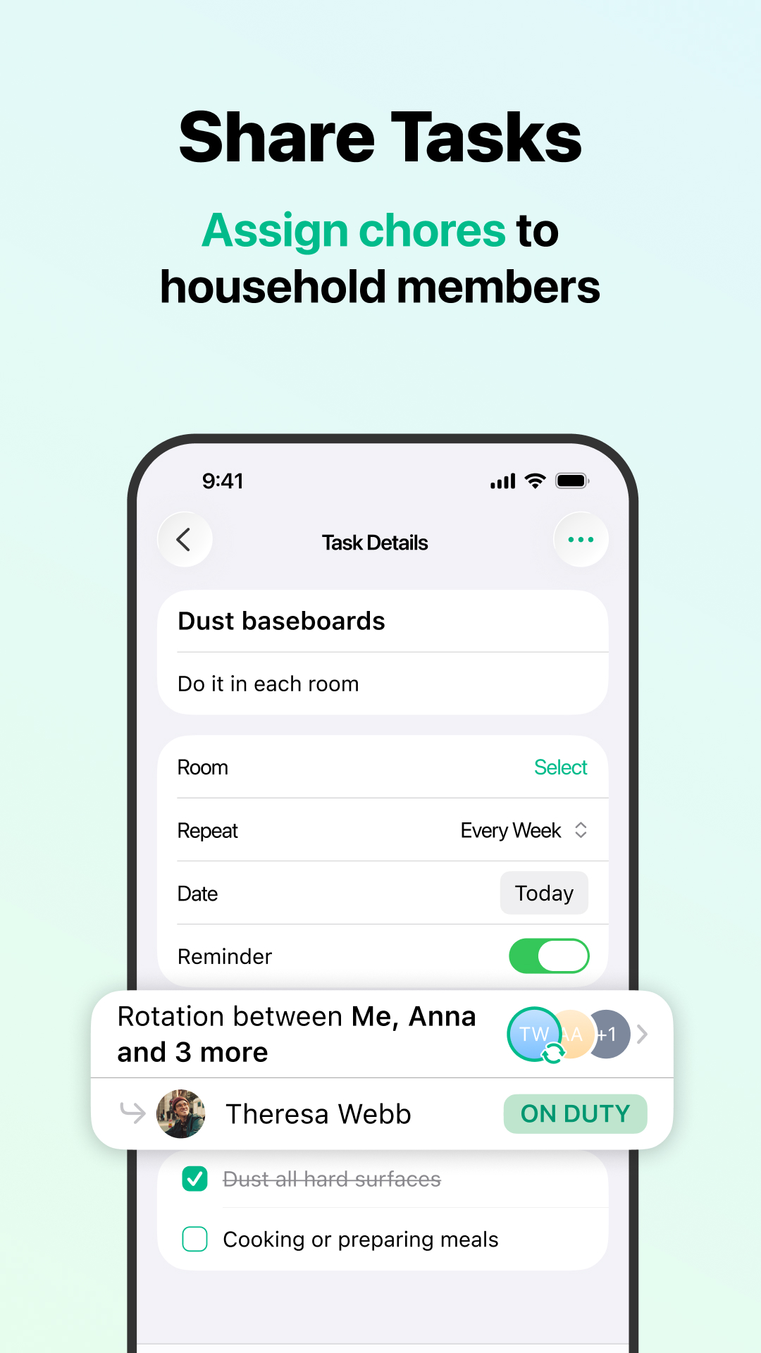 Home Tasker is your smart companion for organizing, scheduling, and staying on top of all your home chores. With powerful automation, intelligent task management, and a clean interface, Home Tasker turns cleaning into a simple, motivating, and stress-free part of your routine. A Smarter Way to Manage Your Home Plan, schedule, and track all your chores in real time. Use flexible templates or let Home Tasker automatically generate a cleaning routine tailored to your home, lifestyle, and preferences. Preset Tasks & Room-Based Organization Get started instantly with preset cleaning tasks for kitchens, bathrooms, bedrooms, and more. Create custom rooms with personalized checklists for complete control over your home routine. AI Room Scan Scan any room with AI to receive intelligent suggestions for tasks and checklists based on the room’s condition — no manual setup needed. Recurring Rotation System Rotate chores between family members or cleaning staff automatically. Choose daily, weekly, monthly, or custom rotation cycles to keep responsibilities fair and consistent. Cleaning History & Activity Tracking View your cleaning history, analyze which rooms need more attention, keep streaks alive, and stay motivated by seeing your progress over time. Achievements for Better Habits Build long-lasting cleaning habits with fun achievements. Earn badges for consistency, streaks, completing big tasks, finishing weekly goals, and keeping rooms tidy. Achievements help you stay motivated and turn cleaning into a rewarding routine. Team Chore Assignments Assign tasks to household members or staff quickly and easily. Home Tasker automatically updates schedules, sends notifications, and keeps everyone organized. Dynamic Checklists Check off tasks as you clean and enjoy real-time progress updates that keep you engaged from start to finish. Vacation Mode Activate Vacation Mode for any member who is away. Their tasks will pause or reassign automatically, keeping your schedule balanced without extra work. Daily Reminders Stay on track with customizable reminders for recurring or one-time tasks. Never forget an important chore again. Works Across All Your Devices Use Home Tasker anywhere with seamless syncing on: iPhone iPad Apple Watch Manage and complete tasks from the device that’s most convenient for you — even from your wrist. Designed for a Better Life • Better productivity • Less stress • A cleaner home with less effort • More structure and consistency • Positive habit-building through achievements and progress tracking Download Home Tasker today and enjoy a smarter, more motivating, and more enjoyable cleaning experience.