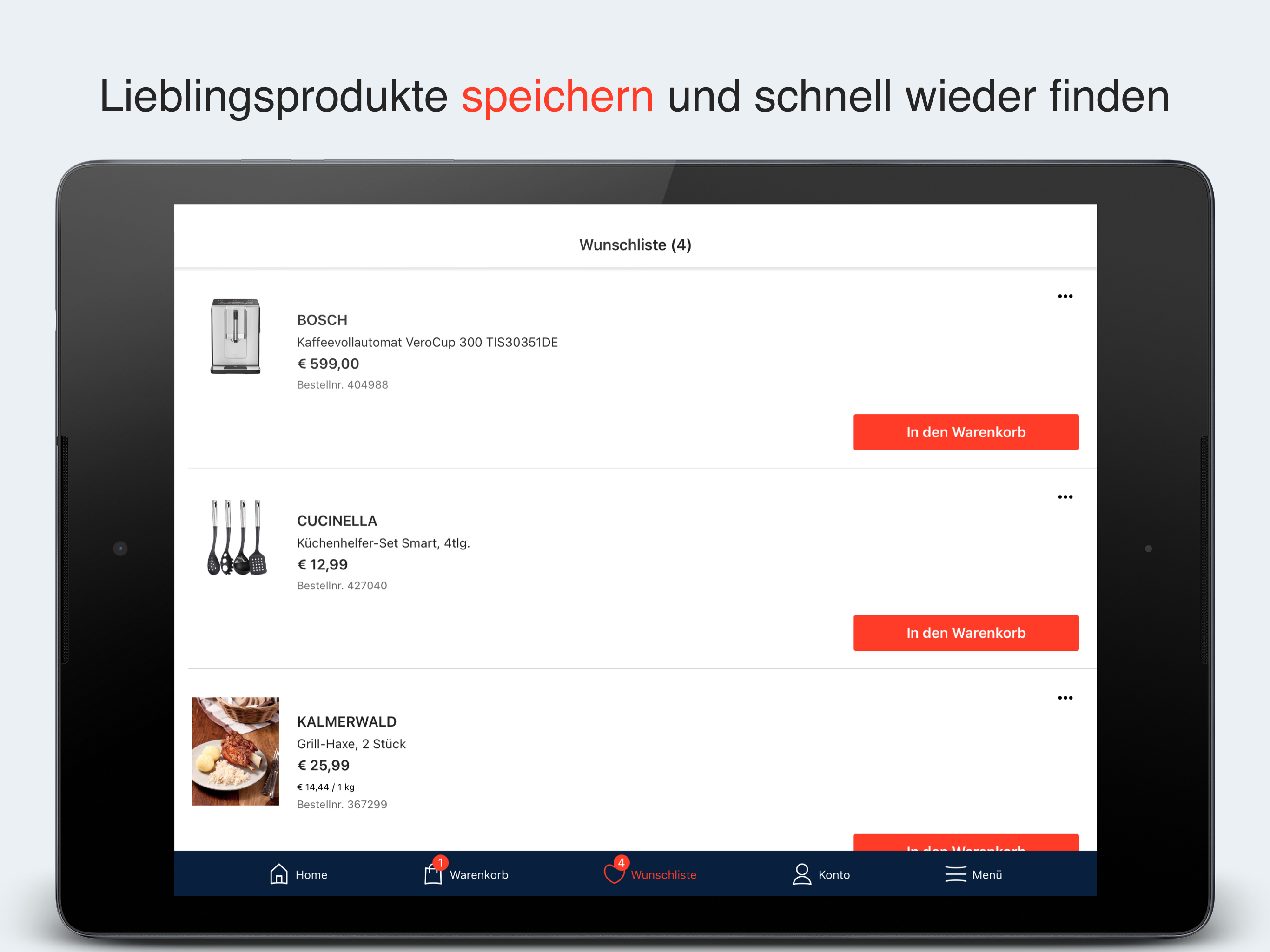Easily NOTE your favorite products It's so easy to remember your favorite product: Enter the order number or simply browse the shop. The offers are clearly arranged in categories. Discover everything you are looking for in the app, from fashion to food supplements to small furniture in the HSE world. The areas in the app include clothing, cosmetics, jewelry & watches and coins. But also articles from the categories Home & Garden, Healthy & Vital, Living & Ambience, Cooking & Enjoyment are waiting for you! When you have found your favorite product, you can easily save it to your watch list and call it up again and again, quickly and easily.