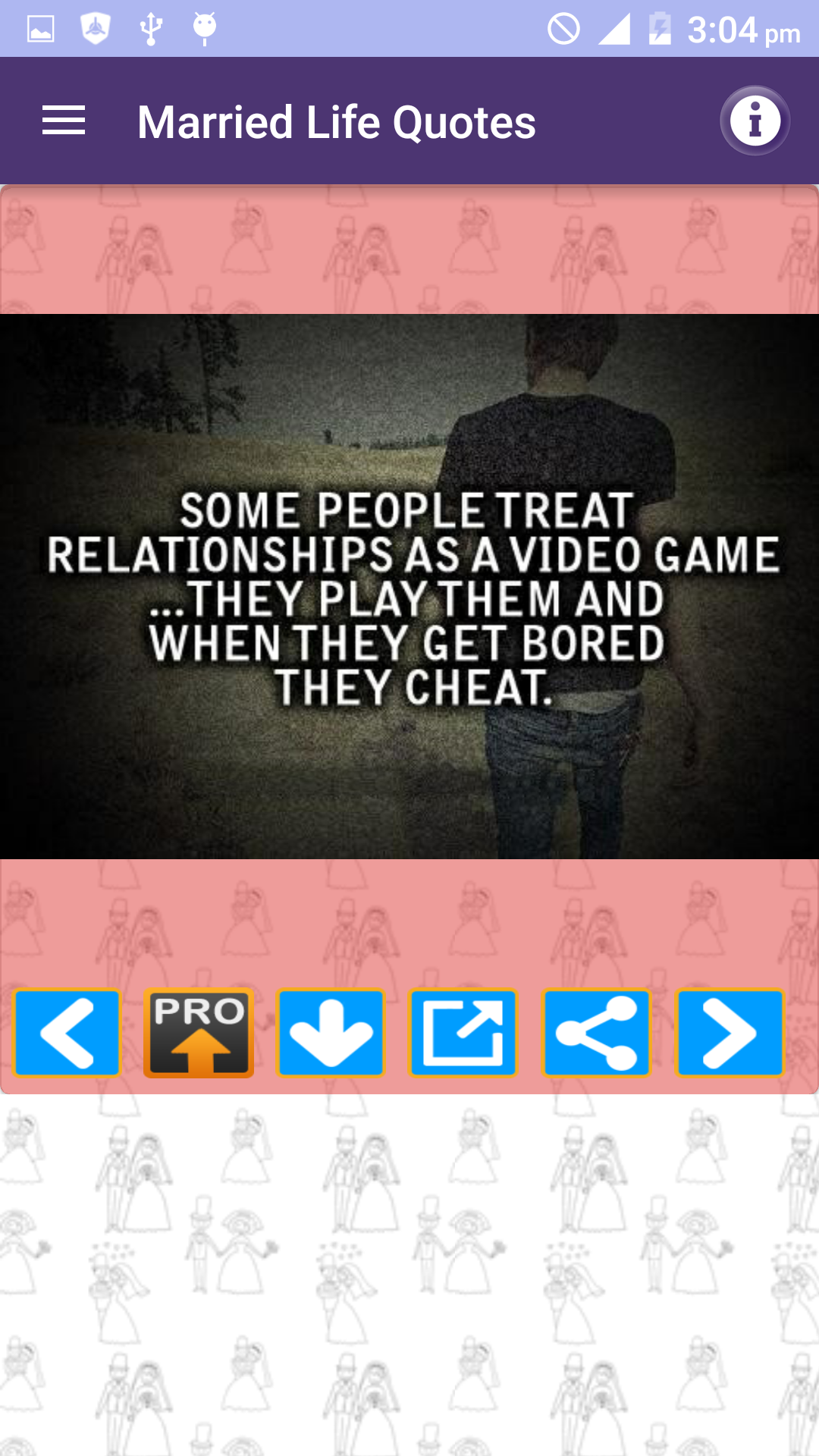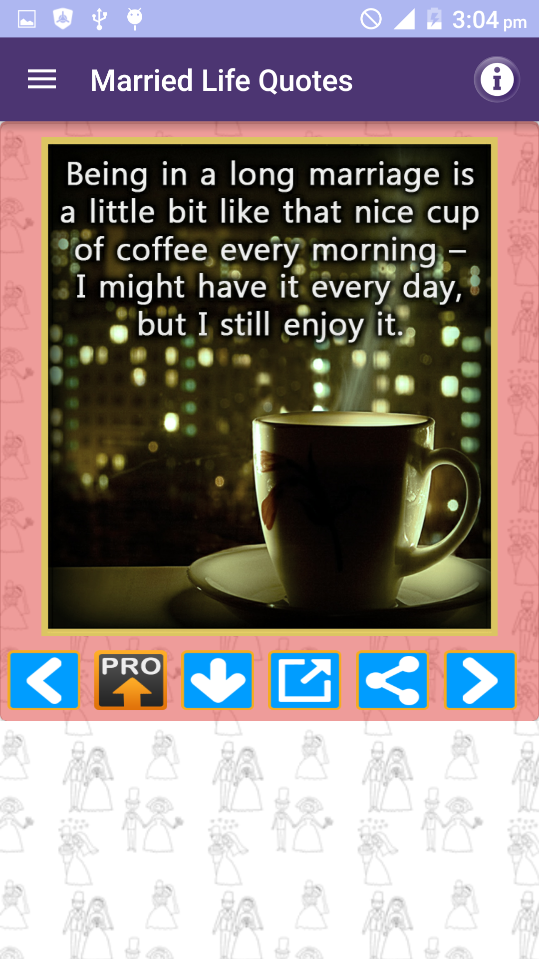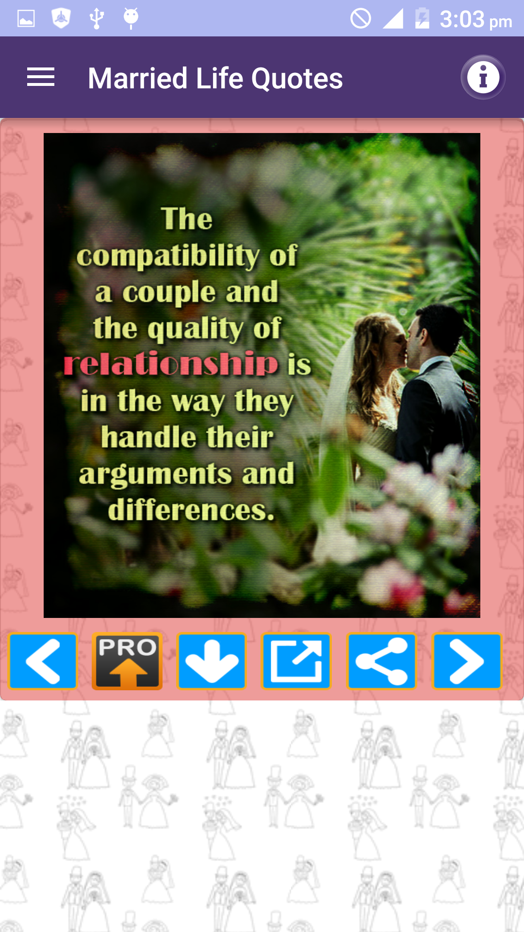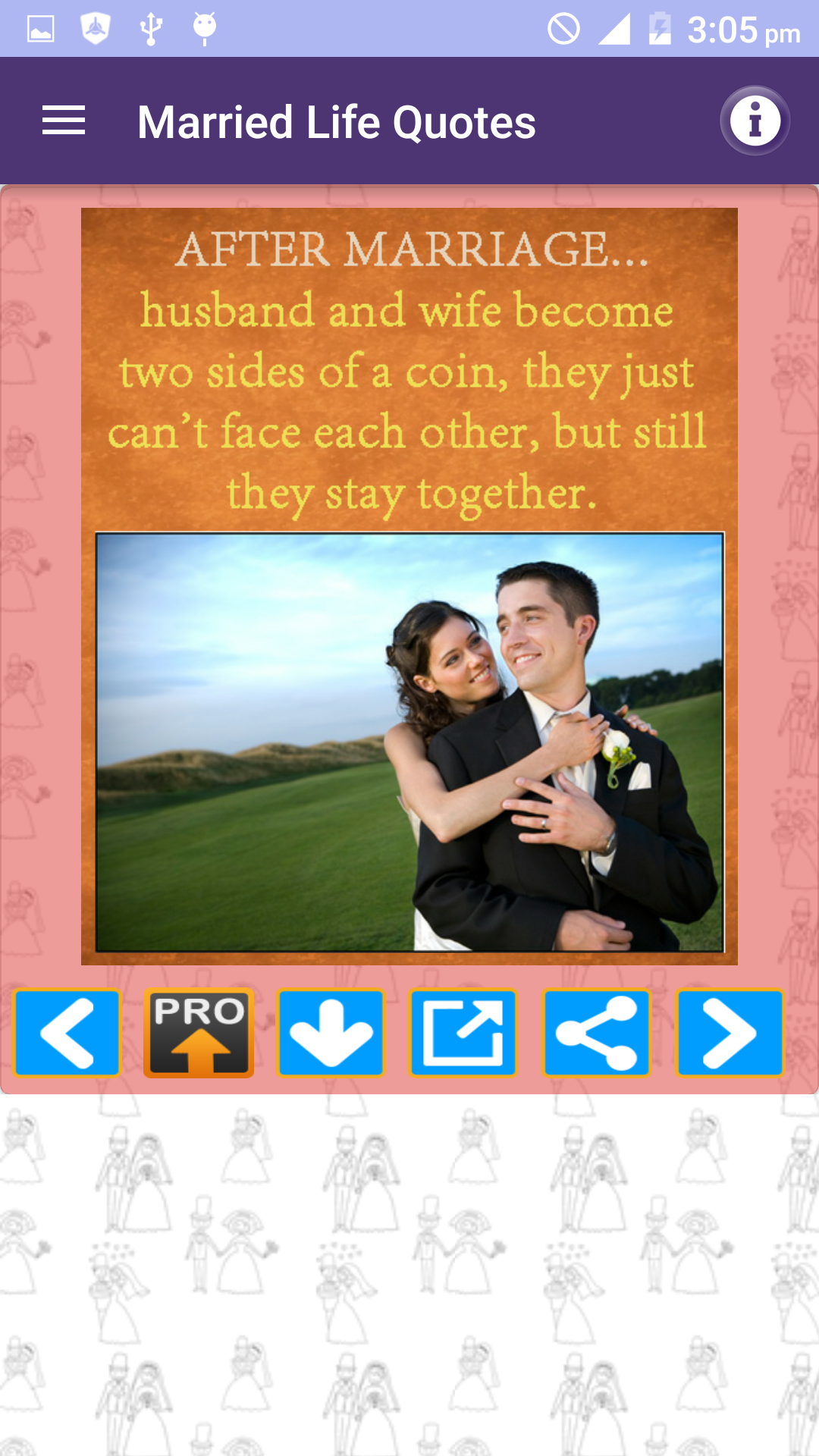 Husband Wife Love Quotes FULL pack is a Free App and amazing collection of Best picture Quotations images about marriage husband wife and married life with beautiful messages in photos. We have tried compiling Husband wife and marriage quotes in all major categories of married couples experiences and their life such as: * Married life * Wife or Husband relationship thoughts and lessons * Husbands and Wives Funny & sad experiences and sayings * Children and responsibilities of Husband and wife towards kids * Cheating and lies * Married couples experiences etc * Separated or divorced * Being single and married * I miss you and missing you quotes * Distant relationships * Coffee and Tea Time thoughts * Daughter son mother and father * Beautiful life after Marriage * Love and care for him and her * Hurt feelings * Pleasure and smile * Cheating in relationships * Wedding promises * Pretty cute hot cool and sexy of real life * Couples as best friends * Respect and disrespect for each other * Man woman and men women * Independent and strong People * Beautiful cute girls vs adorable wife and family * Loyal and faithful husband wife and couple * Too busy to love spouse * Good morning and Good night messages You can share these quotes images as photo in just single Tap to your Facebook WhatsApp twitter tumblr or any other social media website or App. You can also email these pics as attachment to your friends or can download to your cell phone memory or memory card gallery of your mobile.