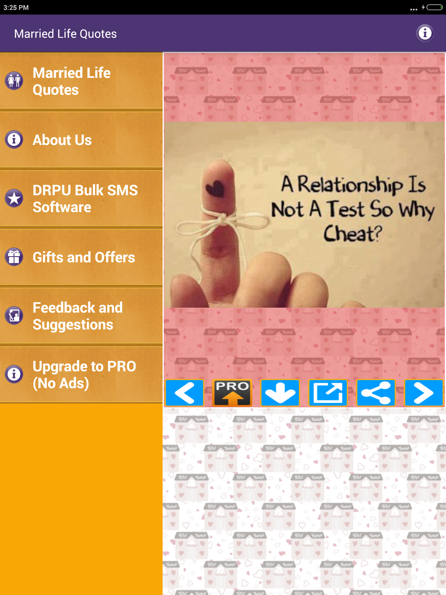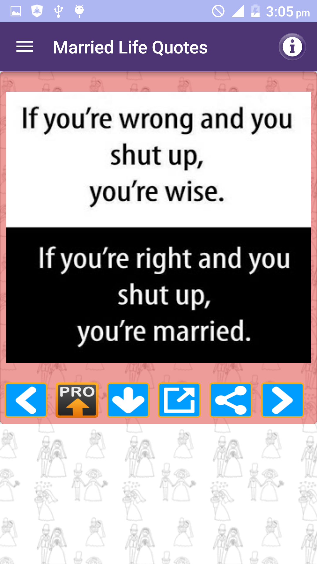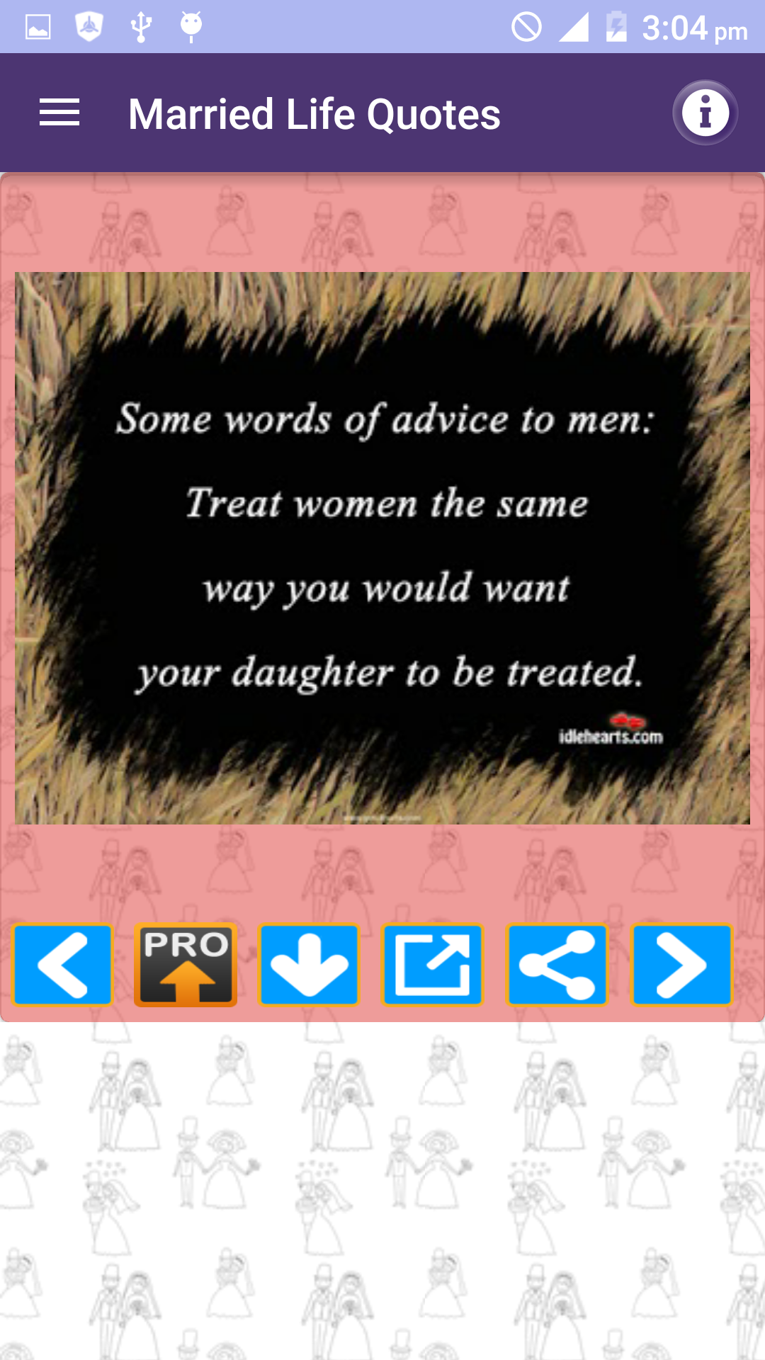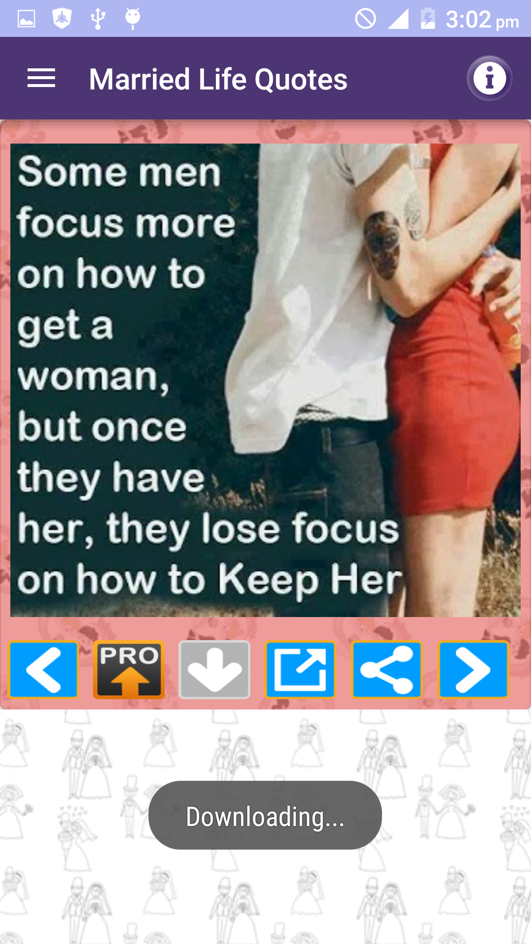 Husband Wife Love Quotes FULL pack is a Free App and amazing collection of Best picture Quotations images about marriage husband wife and married life with beautiful messages in photos. We have tried compiling Husband wife and marriage quotes in all major categories of married couples experiences and their life such as: * Married life * Wife or Husband relationship thoughts and lessons * Husbands and Wives Funny & sad experiences and sayings * Children and responsibilities of Husband and wife towards kids * Cheating and lies * Married couples experiences etc * Separated or divorced * Being single and married * I miss you and missing you quotes * Distant relationships * Coffee and Tea Time thoughts * Daughter son mother and father * Beautiful life after Marriage * Love and care for him and her * Hurt feelings * Pleasure and smile * Cheating in relationships * Wedding promises * Pretty cute hot cool and sexy of real life * Couples as best friends * Respect and disrespect for each other * Man woman and men women * Independent and strong People * Beautiful cute girls vs adorable wife and family * Loyal and faithful husband wife and couple * Too busy to love spouse * Good morning and Good night messages You can share these quotes images as photo in just single Tap to your Facebook WhatsApp twitter tumblr or any other social media website or App. You can also email these pics as attachment to your friends or can download to your cell phone memory or memory card gallery of your mobile.