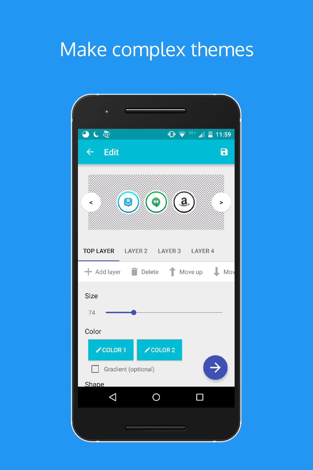 Make your own icons! Export individual icons or generate icon packs to be automatically applied to your launcher of choice. Control the color, shape, shadows, icon pack and more of the icons! Add multiple layers to make more complex styles or add an outline for a simple, minimal icon pack.