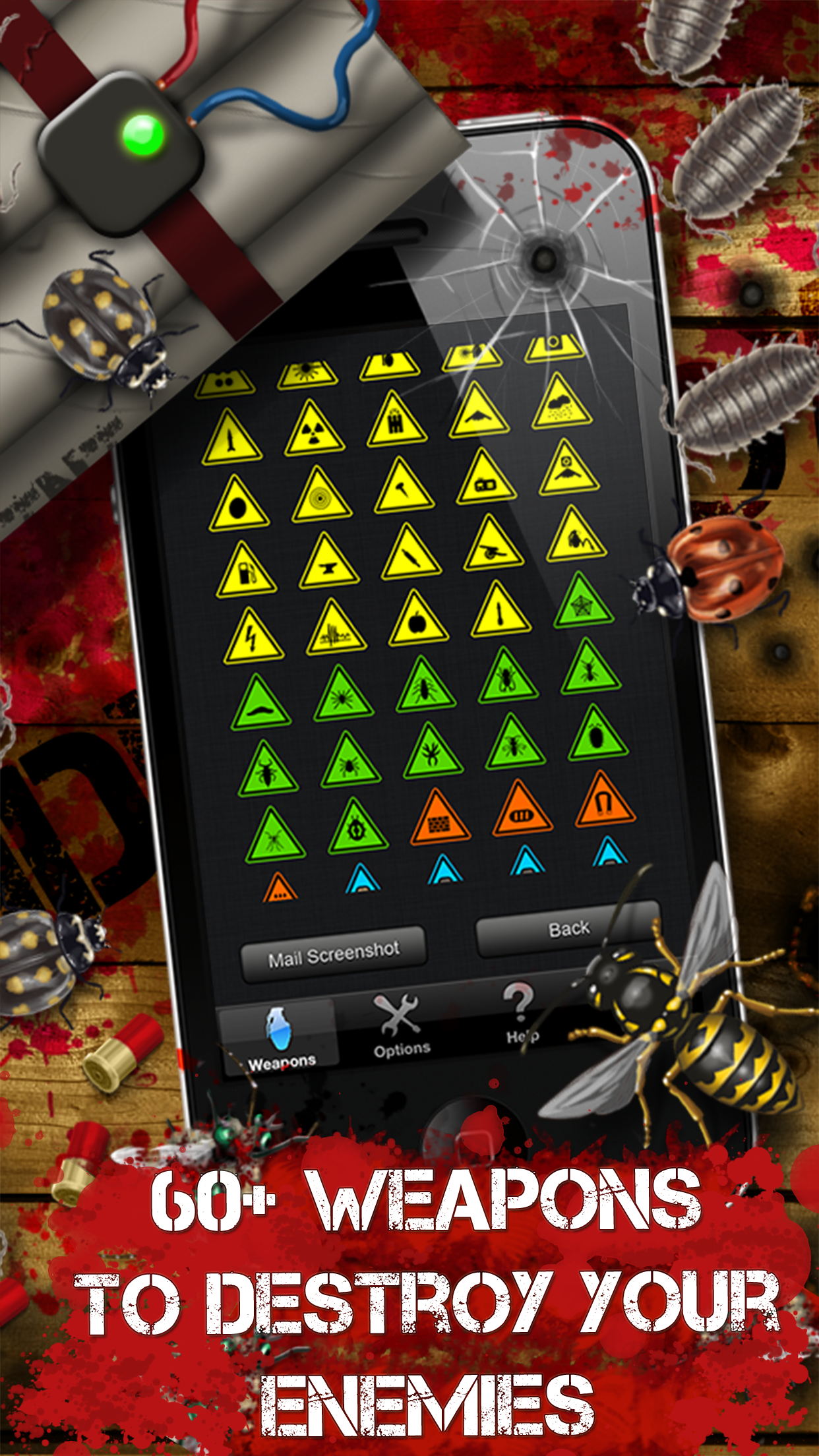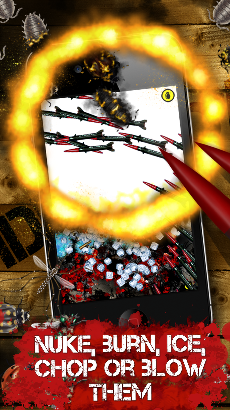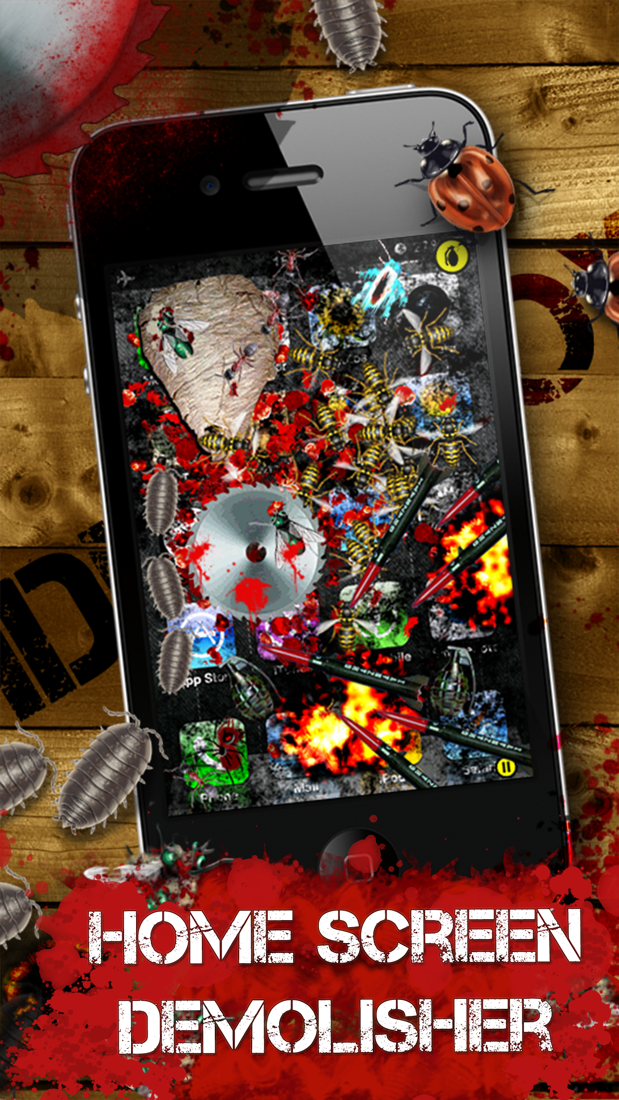 iDestroy is a simulation game where you destroy bugs endlessly! In iDestroy you are the ultimate bug killer: Tapping, Smashing, Burning, Freezing and shooting the bloody bugs. Demolish insects in your pocket with crazy and insane weapons of destruction! 100+ Bugs to demolish! 40+ Weapons to destroy enemies! Be the ultimate bug exterminator! Blast, Shoot, Burn, Bomb, DESTROY! * Bloody warfare, Guns and bugs! * Insane amount of blood! * Lay high explosive mine traps, call in Airstrikes and declare Victory over the bugs! * Shoot holes in your phone and fool others to think it’s broken! * Blast Zombies with bombs and torture bugs with awesome war machines! * Epic ant smashing game that relieves stress in no time with its endless gameplay. * Be creative! Demolish bugs with Missiles, Gasoline, Mine bombs, Gun Towers, Poison baits & Laser Fences. Get rid of your stress now, you deserve it! ★★★ DOWNLOAD iDestroy NOW FOR FREE ★★★ Weapon And Attack Categories A)Nuclear Weapons: Battle your way into the heart of the Ant Hill territory! Kill Insects on the battlefield with High-Explosive Mines and Nuclear Bombs!The weapons in this Nuclear Weapons Category include: # Nuclear Bombs # Mine bombs # Grenades # Plastic Explosive # Minefield Drop # Homing Missile # Dynamite # Missiles # Omega blast # TNT B)Bombs & Rockets Weapons : Sky rocket your way through bug chaos!The weapons included in this category are: # Cannonballs # Jumping Bomb # laser bombs # Air striker # Air bomber # Hailstorm of rockets C)Guns:Shoot the hell out of all the ants and bugs in the game.Various types of guns that you can use in Idestroy include: # Minigun # Airgun # Machine Gun # Shotgun # Paintball Gun D)Saws: Shake your device to push the bugs into gigantic Saws.Various saws available in Idestroy are: # Rotary Saw # Double Rotary Saw # Double Buzzsaws # Quad-Buzzsaws E)Demolition Weapons : Freeze enemies! Explode, bomb, burn & hammer them into ice cubes!Various demolition weapons that you can use in IDestroy include: # Freeze Ray # Mighty Freeze storm # Shrink Ray your prey F)Element Attacks:Epic defense, use the power of the elements! # Lightning Storm # Shock Wave G)Storm Weapons: Use various natural disasters to kill your enemies # Nailgun # Rocket Hailstorm # Snowstorm # Anvil Rain H)Fire Attacks:Use various kinds of fire to kill your enemies # Gasoline # Fire Grenade # Flamethrower I) Foods Weapons : Deceive bugs and kill them with the delicious: # Explosion Bait # Poisoned Apple and Bread J) Tower Defense: Use Various towers to defend you from those ants and bugs: # Flamethrower Tower # Minigun Tower ★★★ Various Bug VICTIMS In IDestroy ★★★ # Mosquitos # Flies # Bees + their nests! # Cockroaches # Sowbugs # Ticks # Worms # Spiders # Ants + ant hills! # Black Widows # Waterbugs # Ladybugs # Black Bugs # Zombies # Earwigs Our promise to you: iDestroy, contains no references to sex, pornography, naked people, porn, adult images or videos, gambling, poker, casino and bullying. ★TRY IT NOW FOR FREE ★ The game is totally free, free of cost, gratis! If you like guns, tanks, ammo, war, warfare or destruction with blood and gore, this is the game for you! So download & get rid of your stress, NOW! ★★★ PLAY IDESTROY NOW ★★★
