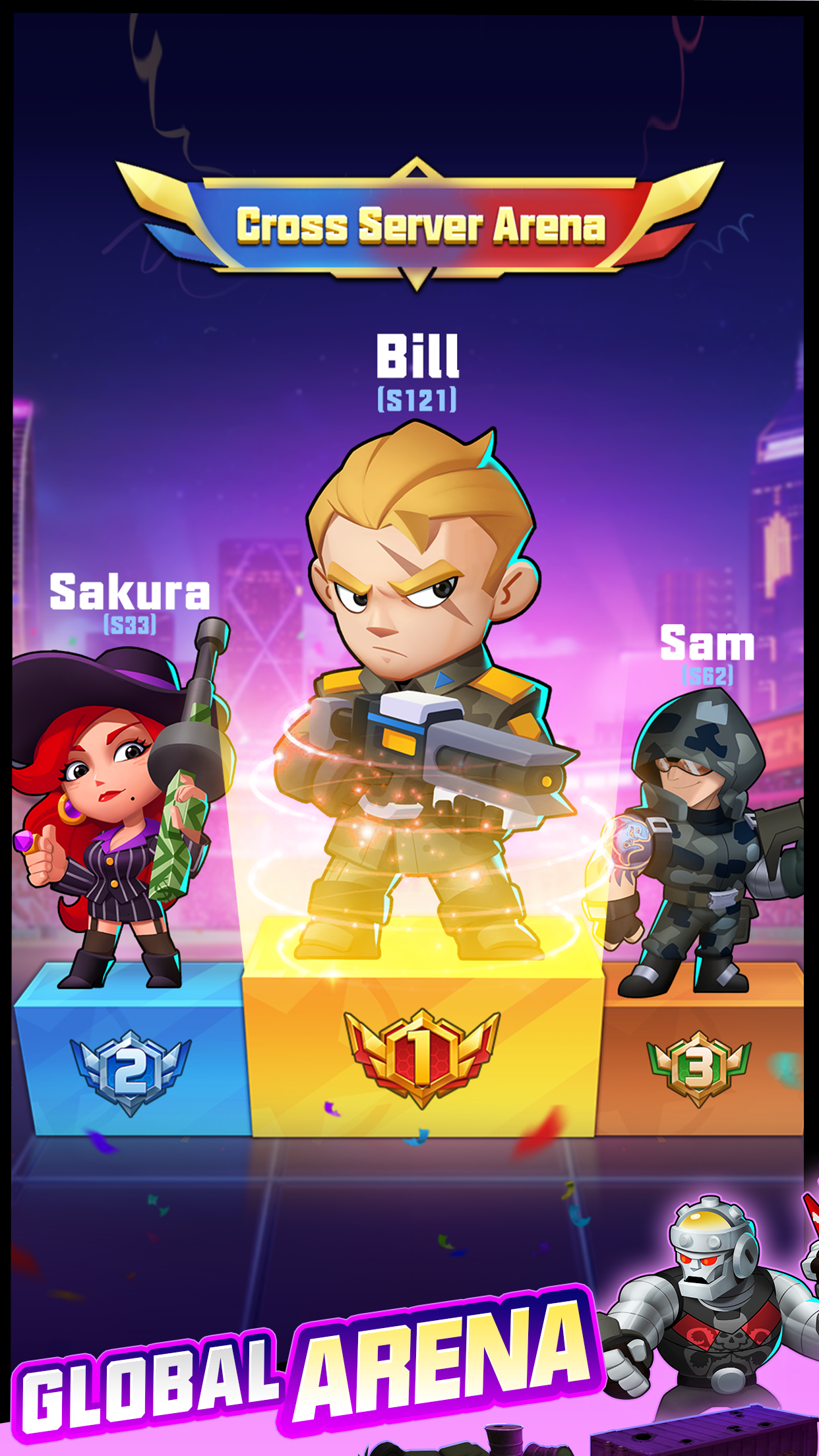 >GLOBAL ARENAWin thrilling 1V1 PVP battles and 3V3 Star Arena with global players with your strategic hero deployment.