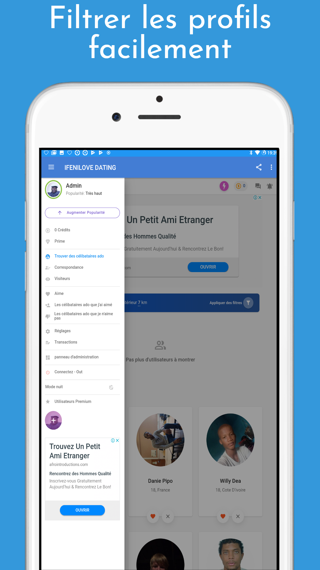 Ifenilove.com is a new free online dating application for the favorite singles and divorced people from all over the world. On Ifenilove.com , we accept singles from all races and religions of the world whether you are Christian, animist, Jewish or Muslim you are the Ifenilove.com welcomes you then that questions of love do not take into account the religion or your race. On Ifenilove.com we believe that everyone has the right to make a serious encounter on our free dating app: whether you are black, white, Asian or Latin ... Our dating app is totally free and open to everyone, you can meet a black, an Arab or an Asian, whether you are rich or poor you can find true love here, although we don't guarantee 100% you can. - Are you a single man or a single woman? - Are you a divorced woman or a divorced man? - Are you a widowed woman or a widowed man? You deserve great love and with our dating app you can make a beautiful and serious lasting encounter. Ifenilove.com dating app will encourage you to date by connecting you with singles near you or internationally, our easy chat with detailed profiles will help you find the woman or man of your dreams easily, the chat is accessible to all members, chat without limits, the chat is totally free like the whole app, the app is free and will always remain a free dating app. Our dating application is one of the best for meeting serious singles, it makes it easy for you to meet new singles, you can find love, meet and flirt with French singles near you. Ifenilove.com Senior dating : You are a senior citizen? you are over 40 or over 50 years old? you also have the right to love after you have singles of your own age. If you need a senior dating, singles browse the profiles of our app, use the online chat and find your love. Ifenilove.com Dating between disabled people: Are you disabled? Our app has thought about the disabled, you can easily meet disabled or able-bodied people who need your love and who will give you the love you deserve by using your search filter. Ifenilove.com Meetings between Muslims : Are you a Muslim? Here you can easily meet Muslims who are looking for a serious meeting for marriage and for a life together. Ifenilove.com Christian dating : If you are looking for single Christians, are you Catholic, Orthodox or Evangelical Protestant? You will make a Christian dating easily on our dating application, Are you looking for a serious meeting? Or you just want to go out with a man or a woman near you? Then this free dating application is for you.