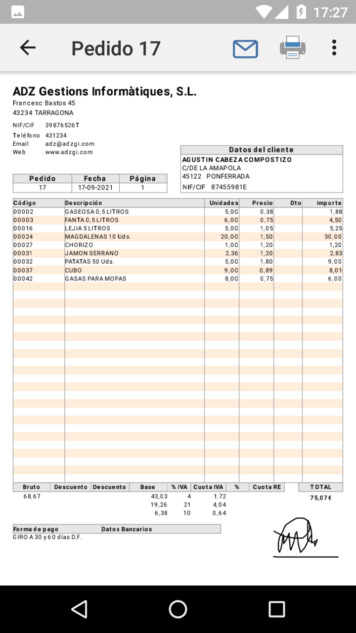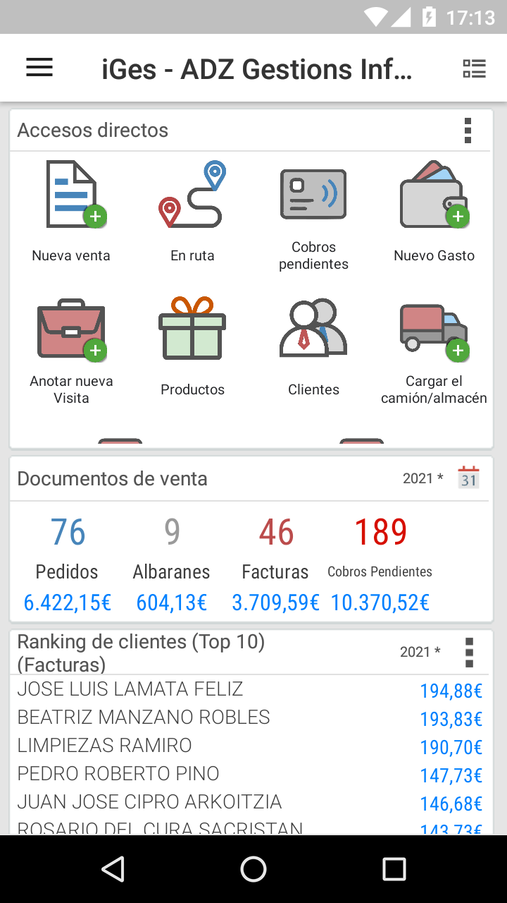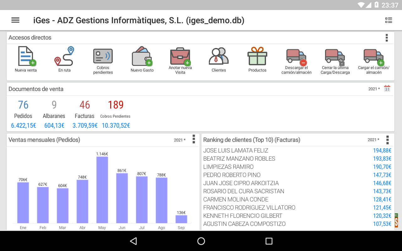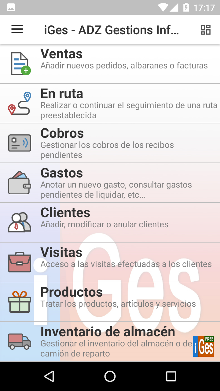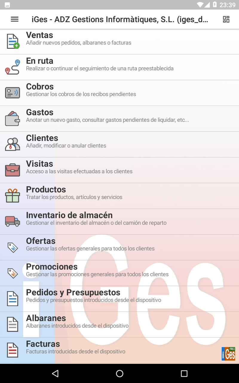iGes is an SFA application of Presales and Invoicing designed for mobile Android devices (phones, tablets, ...), designed for taking orders, Delivery notes, Product catalogs, Invoices, visits, managing routes, receipts, expenses, etc .... IGes does not need internet connection to work, (it works in off-line mode), so you will not be bound to the existence of coverage or have Wifi, working faster and more fluidly as a native android application. iGes can work independently or connected with any program of Business Management / Invoicing / ERP via ODBC data sources or through CSV files. The connection is always made when the user decides to synchronize data (sending or receiving) and can be made either through the Internet or Wifi. iGes is distributed in 5 versions for every need and every budget: * FREE, BASIC and PLUS are standalone versions that do not need any software business management / billing / ERP desktop to run. They are distributed exclusively through Google Play. * PROFESSIONAL and ENTERPRISE: Are versions that synchronize data with some business management program / billing / ERP, and can not function without it (it is not autonomous). They are distributed through its own sales network of ADZ. Features of standalone versions: * FREE: It's completely free, to prepare and issue invoices only. For those who do not have much data of customers / products and can enter them manually from the device without having to import data of any kind. * BASIC: The most simple: work independently and without complications. Allows budgeting, orders and invoices, and issue them with the standard format of invoice provided with iGes. Allows importing of customer and product data through CSV files and backing up data. * PLUS: The most complete with all the functionality needed to bring business and sales management from the mobile device. All features of the BASIC version more templates customizing invoices and orders, preparation and monitoring of routes, expenses, export orders, delivery notes and invoices to CSV files, use of professional bluetooth text printers to issue invoices and orders, collection management pending receipt, customer visits, documents, manuals and catalogs, database on SD card, Offers and promotions, introduction of products by voice ... Check the differences between versions in detail in "Tarifas" on our website: http://www.adzgi.com
