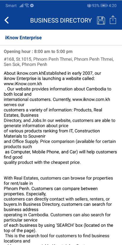 In Business Directory, customers can search for business address operating in Cambodia. Customers can also search for particular service of each business by using 'SEARCH' box (located on the top of the page). This is the search tool for customers to find business locations and addresses more quickly.