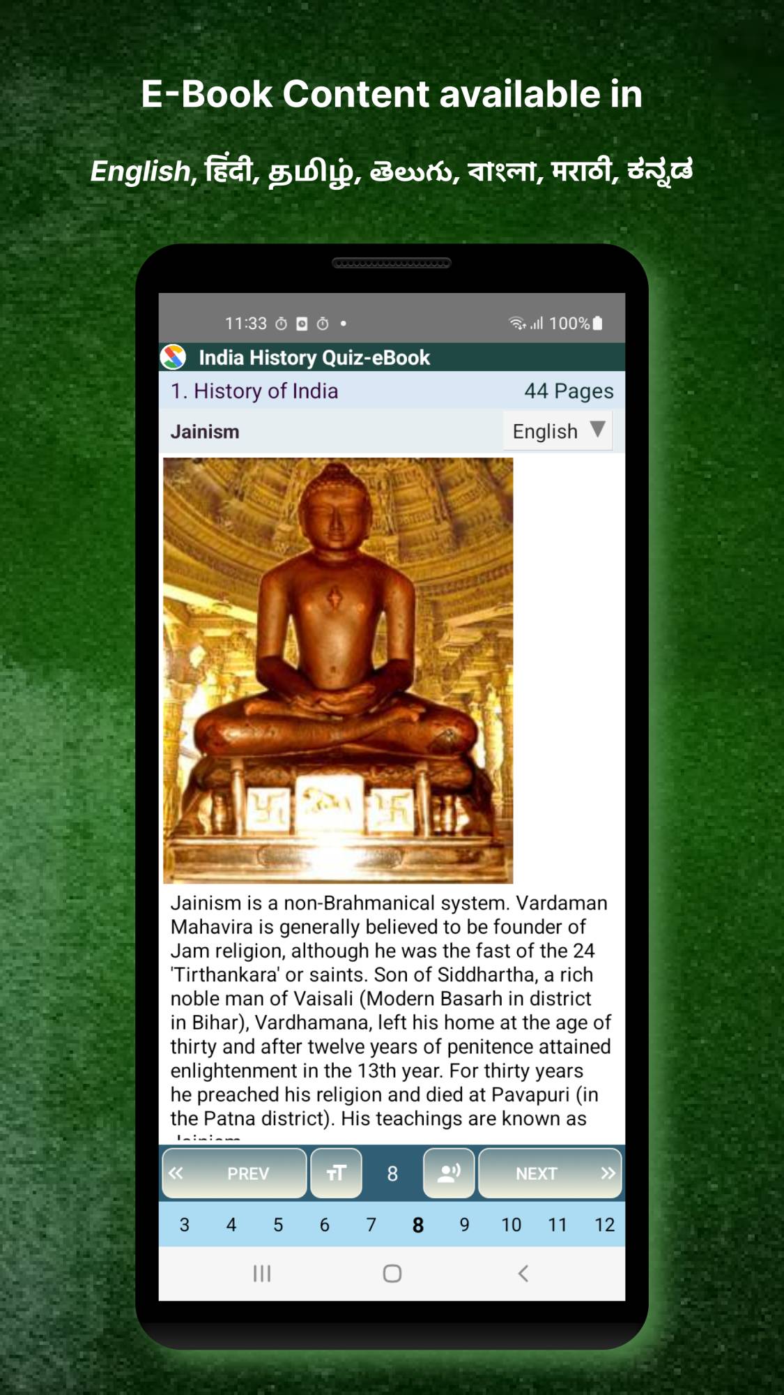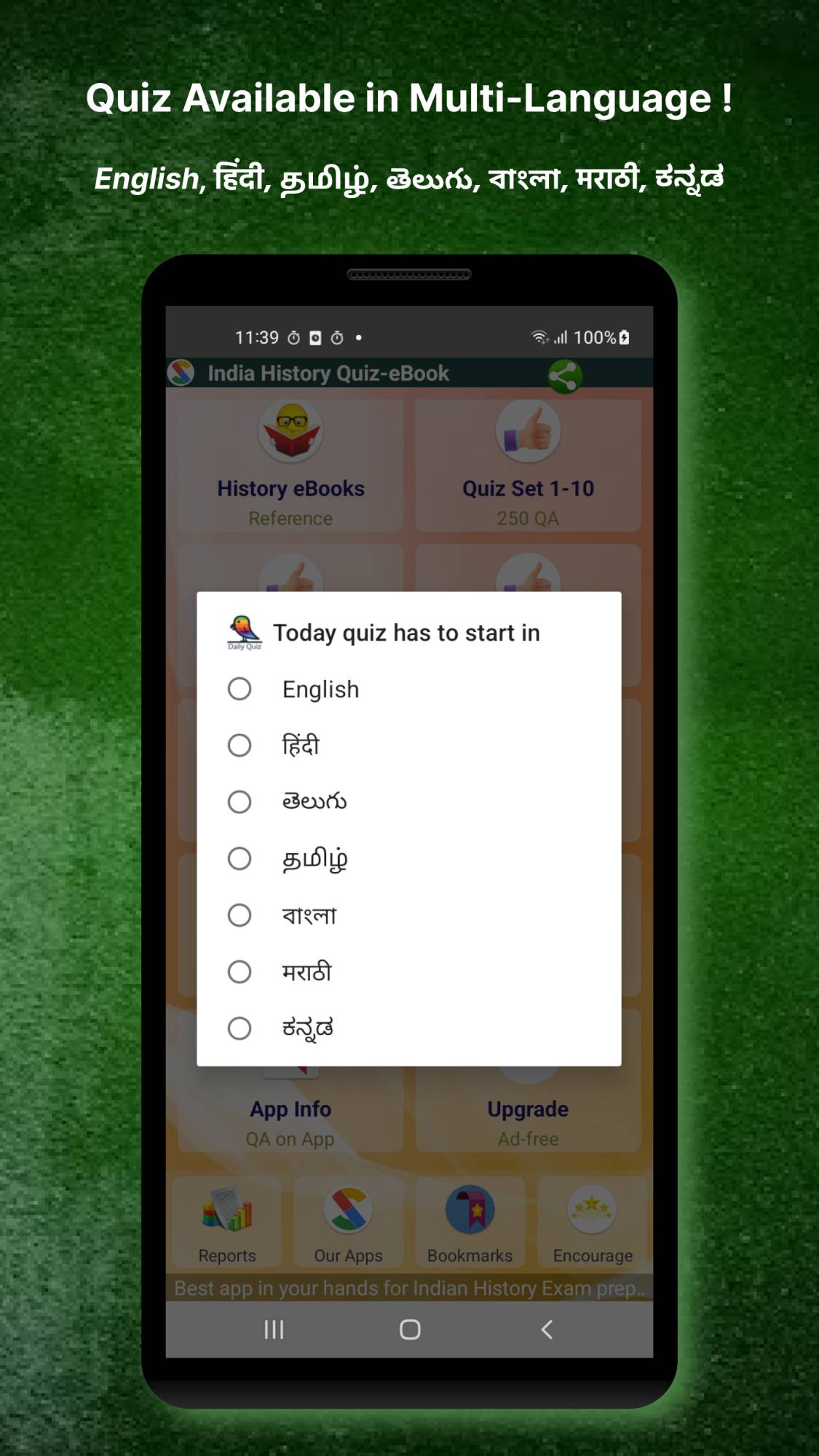 • Indian History App presented in English, Tamil, Telugu, Bangla, Kannada.