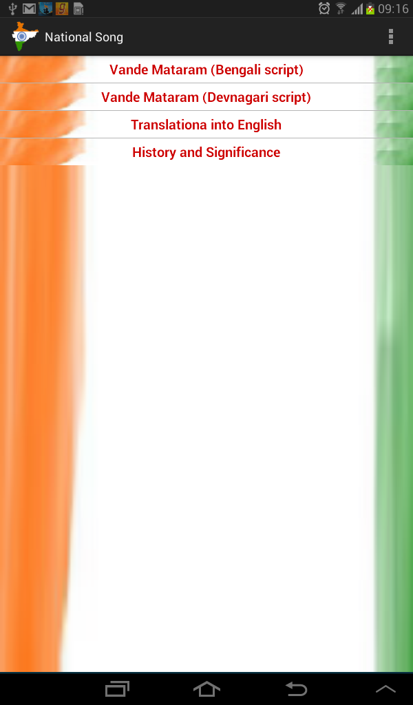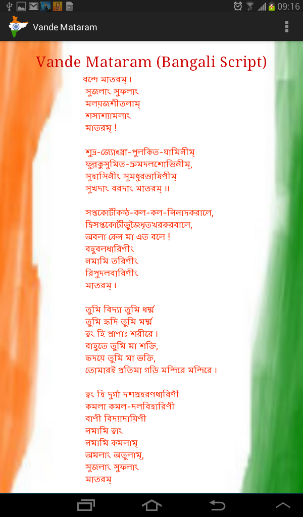 *Vande Mataram* This unique app allows you to explore our great national song in most amazing way on your android device. This app contains every single information about our national song, which is must for every indian citizen. Following are the major highlights of this application:- -Vande Mataram (Bengali script) -Vande Mataram (Devnagari script) -Translationa into English -History and Significance -Vande mataram video by A R Rahman -Vande matarm original video
