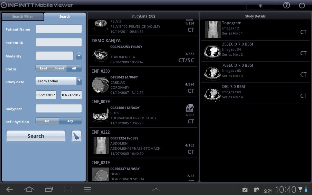 INFINITT Mobile Viewer is a medical image viewing application enabling access to a central DICOM server that runs on mobile devices. It supports such functions as Windowing, Zooming, Panning, Hounsfield unit, Measurement, Cine play, E-mail sending, and Report viewing. IMPORTANT: This app requires INFINITT PACS and INFINITT Mobile PACS Server. This app is intended for review only, and is not approved for diagnostic use.