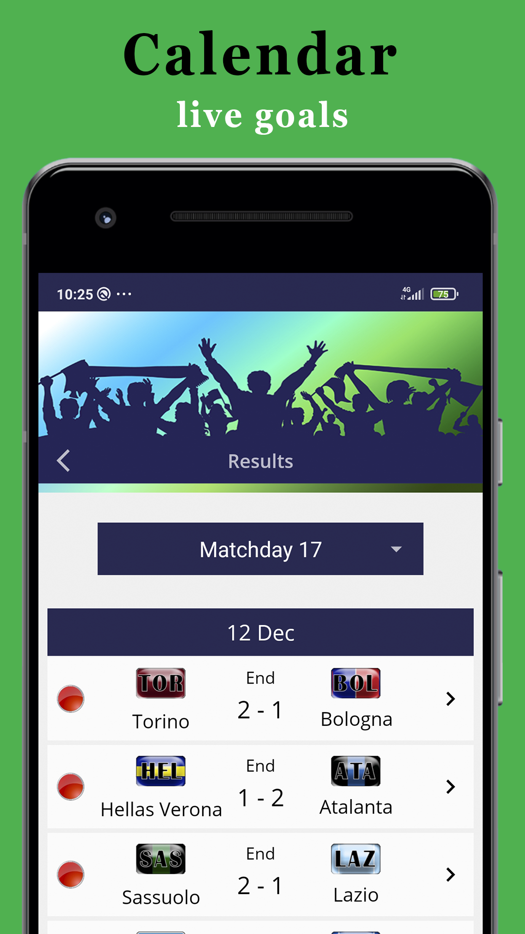 Download the app of the league, do not miss the news of the Football Italy. Check the results and live events of the matches of your favorite teams: AC Milan, Atalanta, Benevento, Bologna, Cagliari, Crotone, Fiorentina, Genoa, Hellas Verona, Internazionale, Juventus, Lazio, Napoli, Parma, Roma, Sampdoria, Sassuolo, Spezia, Torino, Udinese