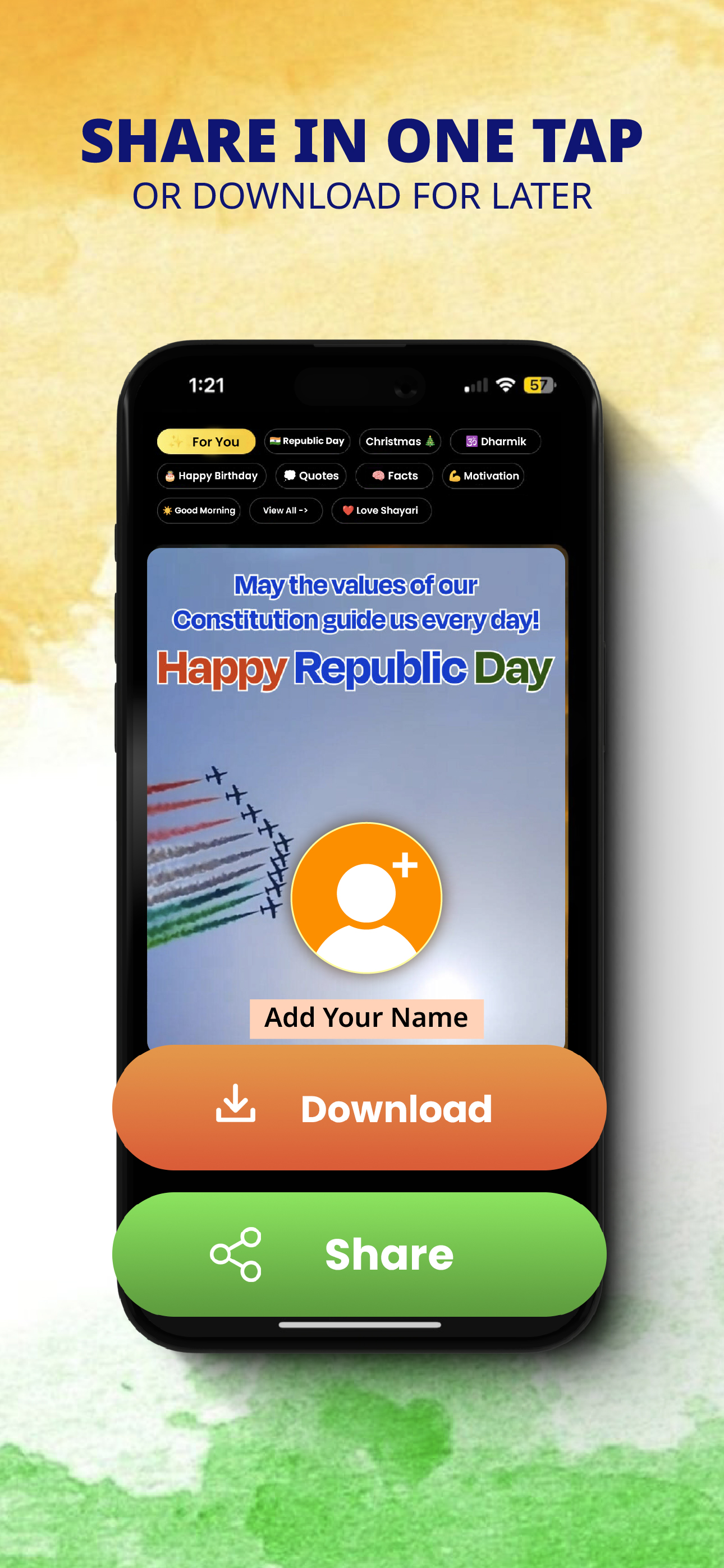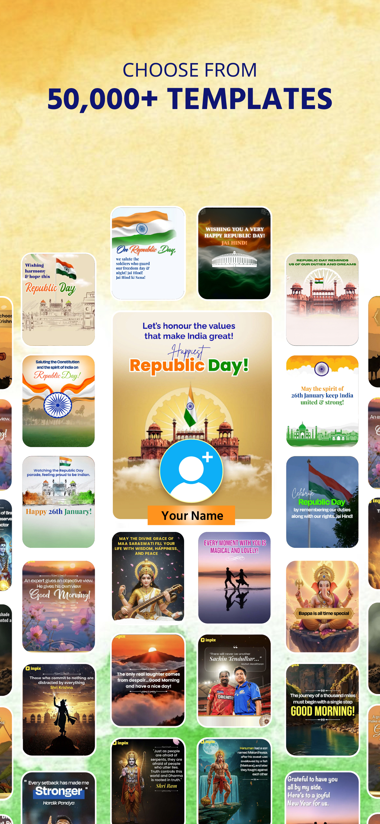 Hundreds of Templates: Explore a vast library of professionally and beautifully designed templates for Good Morning messages, Good Night messages, inspirational quotes, devotional messages, festival greetings (Diwali, Eid, Christmas, birthdays, etc.), and more. Everything available in a single click. No more need to edit photos or forward same status on social media.