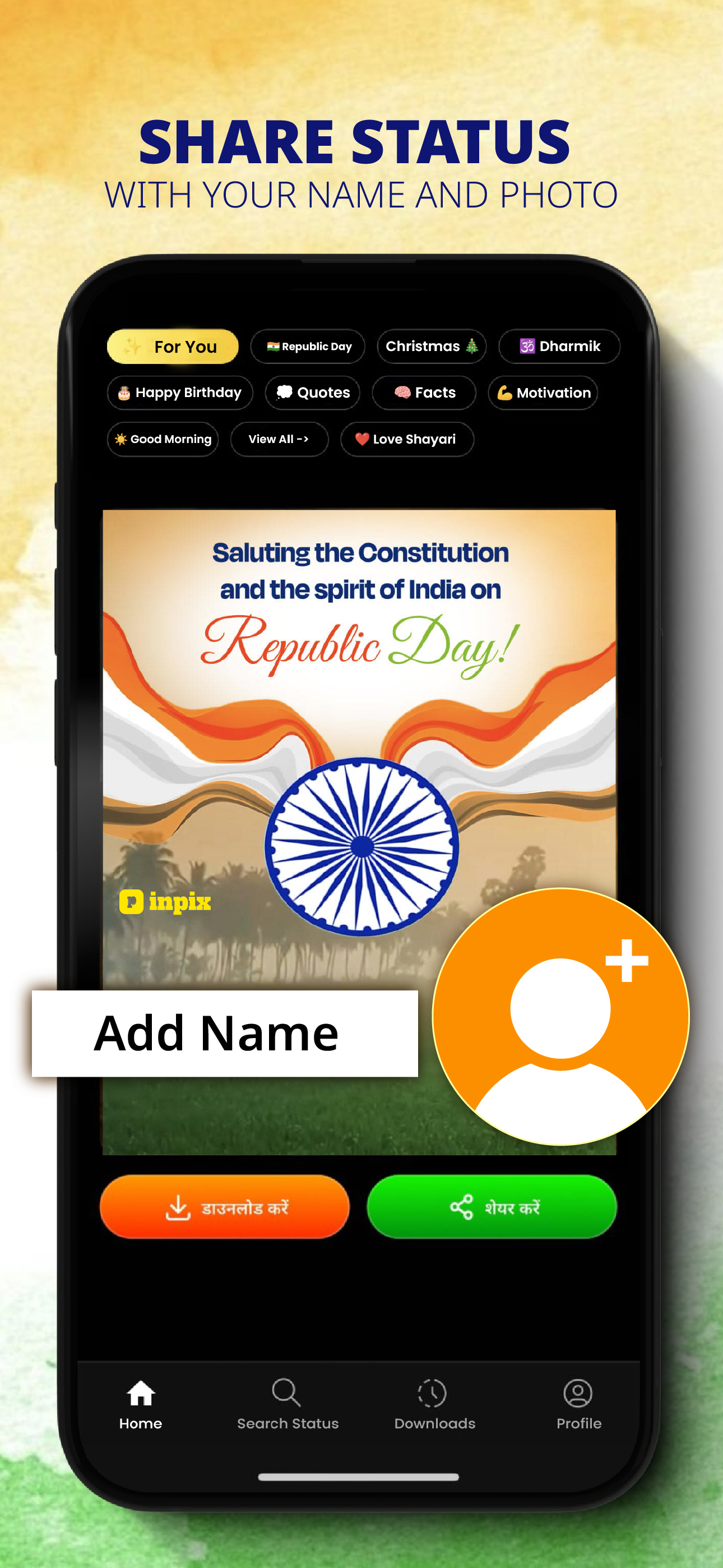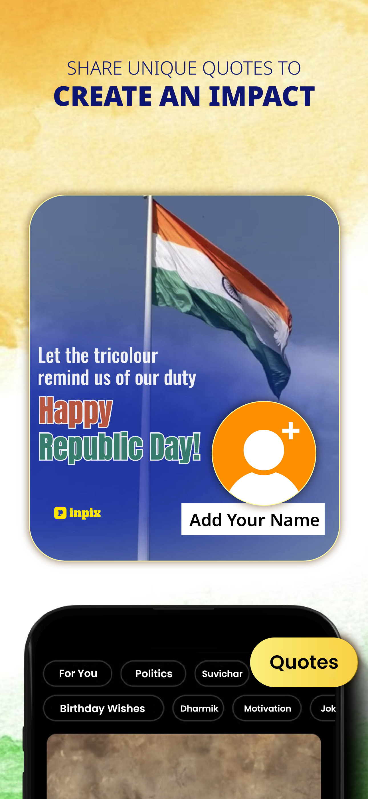 InPix is your one-stop app for creating and sharing Good Morning wishes, New Year status 2026, Christmas wishes, devotional quotes, motivational messages, inspirational quotes, festival greetings, and Good Night status all personalised with your NAME and PHOTO. Simply choose a readymade template, add your name and photo, and share instantly on WhatsApp, Facebook, Instagram, or anywhere no extra photo editor app required.