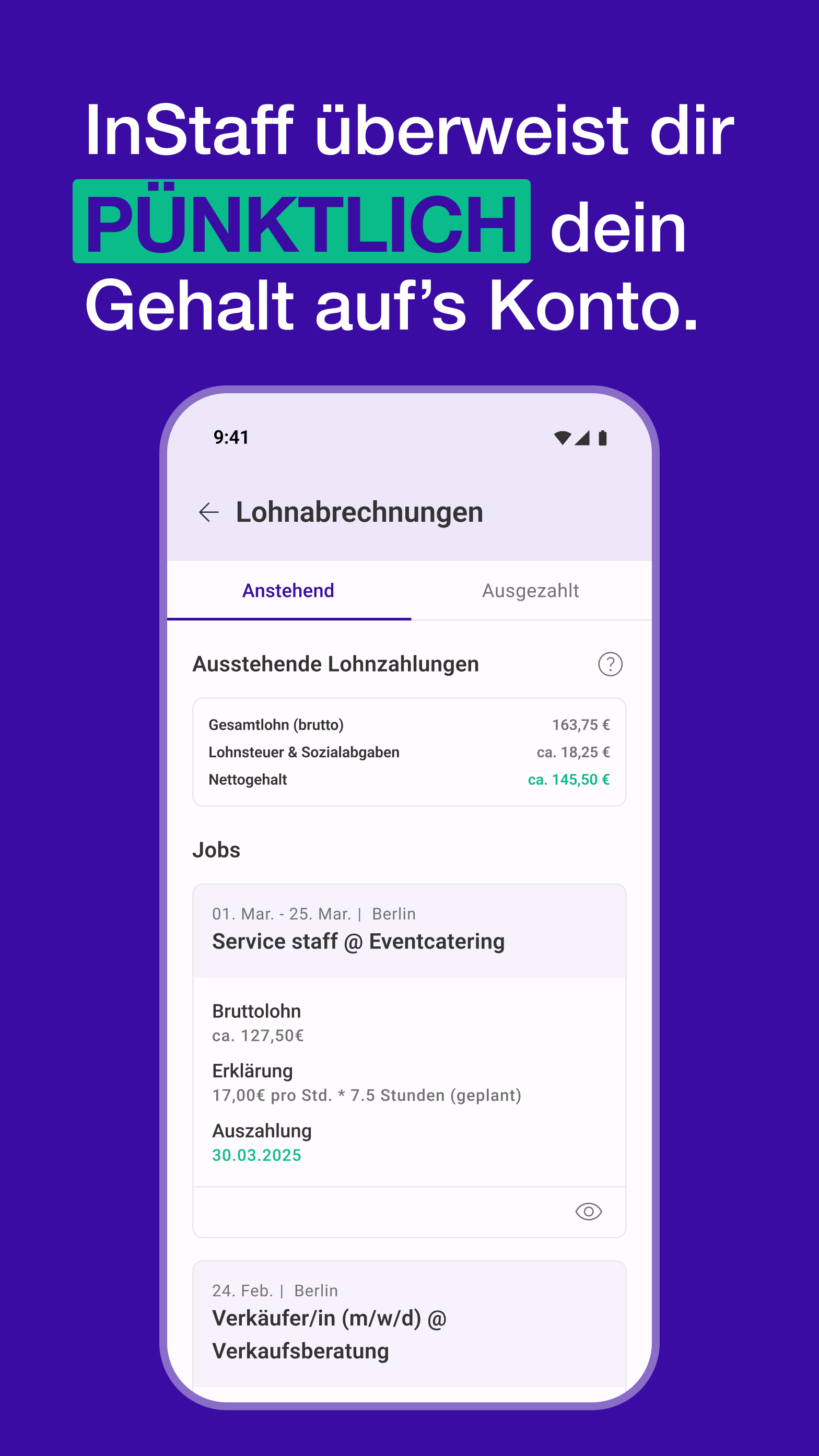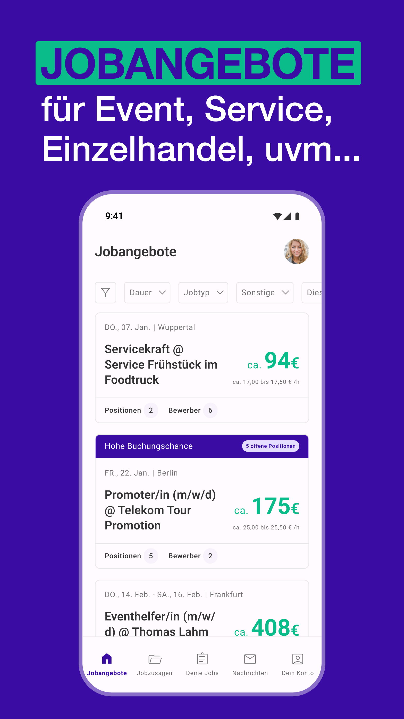 Du möchtest nebenher Geld verdienen? Über InStaff findest du temporäre jobs als Messehostess, Kellner, Promoter, ausgebildeter Koch oder Verkäuferin in ganz Deutschland. Die meisten Jobs sind ca. 1 bis 5 Tage lang und du verdienst je nach Erfahrung zwischen 70 und 200 EUR pro Tag. Einmal angemeldet erhältst du täglich neue Jobangebote auf dein Smartphone. Du kannst dich mobil auf die Jobs bewerben und bist dann in der Auswahl des Kunden. Nach kurzer Zeit erhältst du die Rückmeldung, ob du vom Kunden für den Job gebucht wurdest. Im Falle der Buchung wirst du über InStaff als Kurzfristig Beschäftigter Arbeitnehmer angestellt (so benötigst du Keinen Gewerbeschein) und InStaff zahlt dir nach dem Job das Gehalt aus. InStaff bietet dir Jobs in ganz Deutschland an, wie zum Beispiel: - Messehostess Jobs (Kundenempfang) in Messestädten wie z.B. Frankfurt, Hannover, Stuttgart, etc. - Promotion Jobs (Flyer verteilen) in Großstädten wie z.B. Berlin, Bremen, Köln, etc. - Model Jobs (Fotoshootings) in Großstädten wie z.B. Hamburg, Düsseldorf, München, etc. - Service / Kellner Jobs in zahlreichen Kleinstädten wie z.B. Esslingen, Augsburg, Potsdam, etc. - Studentenjobs an vielen Uni Städten wie z.B. Heidelberg, Göttingen, Münster, etc. - Küchen Jobs für ausgebildete Köche in Restaurants in ganz Deutschland Natürlich kannst du weiterhin eine reguläre Vollzeitstelle haben oder nebenher für andere Hostess Agenturen arbeiten oder beispielsweise Jobs über Promotionbasis annehmen. Du bist also nicht alleine an InStaff gebunden. ACHTUNG (Anmeldung notwendig) Damit du diese App nutzen kannst, musst du dich vorab auf unserer Webseite anmelden: https://www.instaff.jobs/auth/arbeitnehmer-registrierung