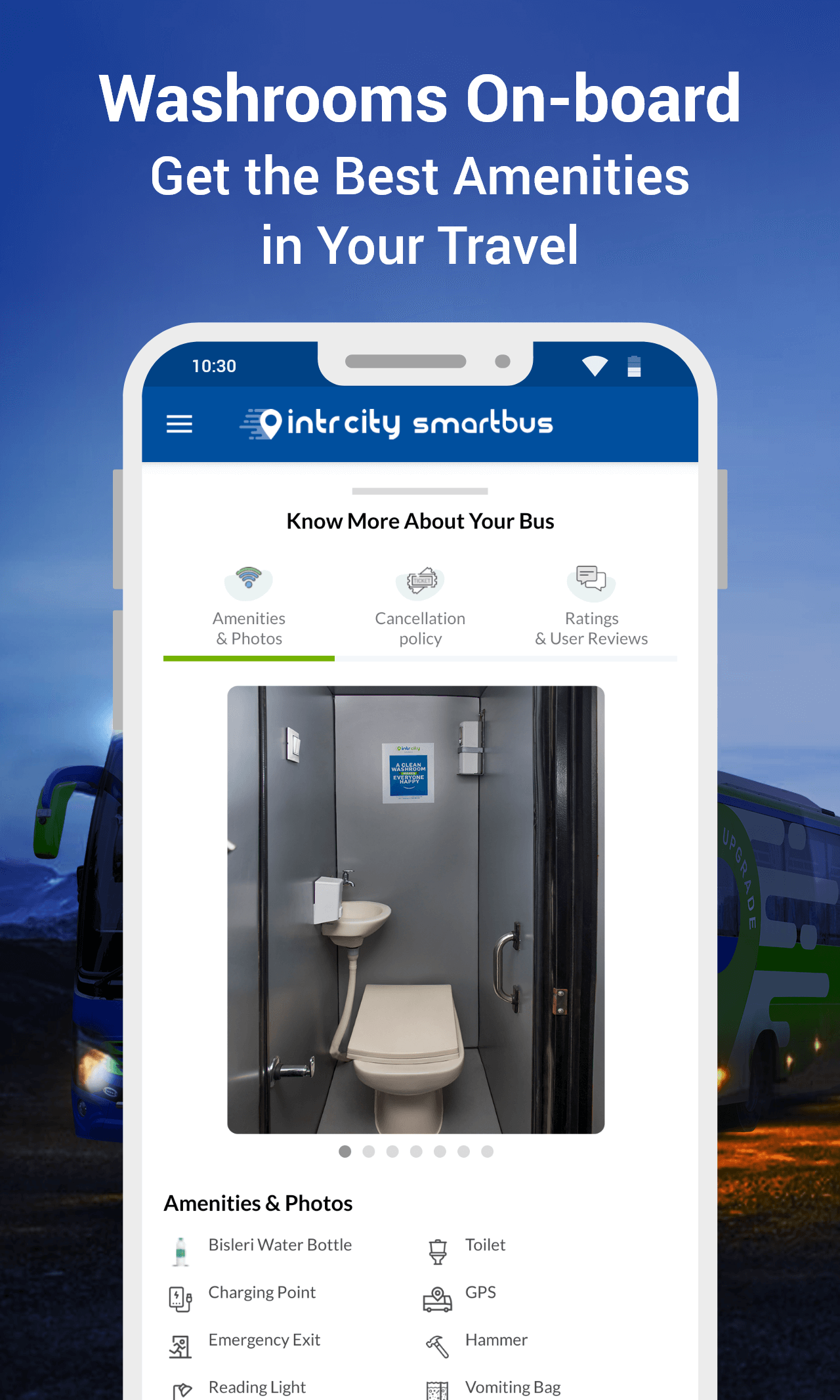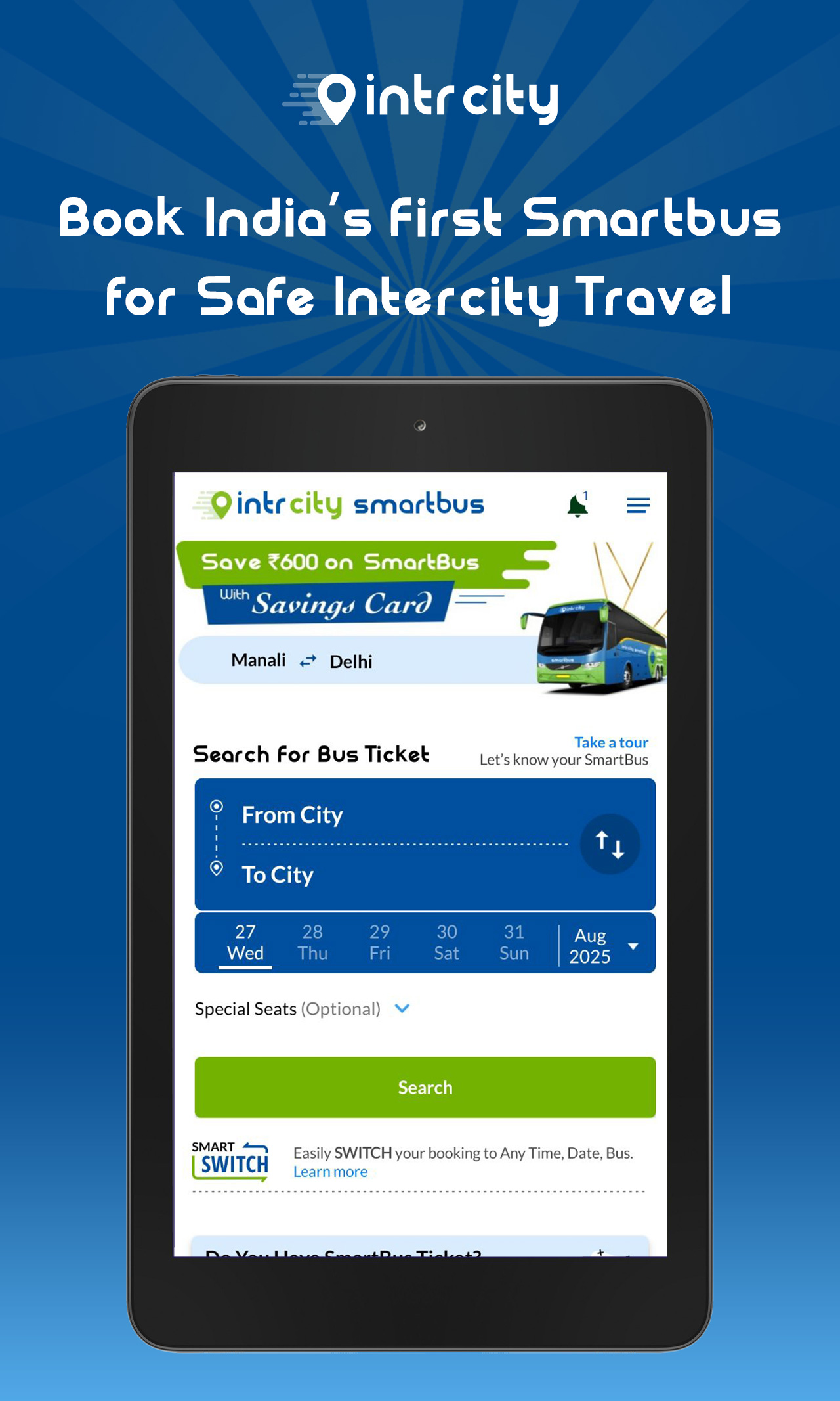 IntrCity SmartBus is India’s favorite bus travel brand for intercity bus travel. Book intercity bus tickets for Delhi, Lucknow, Amritsar, Kanpur, Gorakhpur, Bangalore, Chennai, Mumbai, Pune, Indore, Hyderabad, Goa, Coimbatore, Madurai, Vijayawada, Vizag, Guntur, Nagercoil, Manali, Bengaluru. Tickets are available on redBus, Abhibus and Makemytrip. IntrCity Bus Booking App features: 1. Book intercity Bus Ticket 2. Track bus live 3. Check PNR Details 4. Change Bus Boarding Point 5. Book a return ticket 6. Cancel booking 7. Redeem Bus Coupons, Offers 8. Reschedule Bus Ticket 9. Select preferred sleeper bus seat 10. Board from IntrCity Lounge On-board Washrooms Buses On-board Washrooms available on most buses On Time Travel 1 million rides with 89% On-Time bus punctuality Bus Booking Offers Get Rs.300 Off on bus ticket booking with code EARLY SmartBus Savings Card - Get Rs.200 off on your every bus ticket. Buses are available on 100+ routes Ahmedabad to Mumbai Bus Amritsar to Delhi Bus Ayodhya to Delhi Bus Ticket Bangalore to Chennai Bus Bangalore to Coimbatore Bus Ticket Bangalore to Hyderabad Bus Ticket Bangalore to Madurai Bus Ticket Bangalore to Nagercoil Bus Ticket Bangalore to Vijayawada Bus Ticket Chennai to Trichy Bus Ticket Chennai to Coimbatore Bus Ticket Chennai to Hyderabad Bus Ticket Chennai to Madurai Bus Ticket Chennai to Bangalore Bus Chennai to Pollachi Bus Chennai to Nagercoil Bus Ticket Chennai to Vijayawada Bus Ticket Coimbatore to Chennai Bus Ticket Delhi to Amritsar Bus Ticket Delhi to Jalandhar Bus Ticket Delhi to Azamgarh Bus Ticket Delhi to Ayodhya Bus Ticket Delhi to Dehradun Bus Ticket Delhi to Gorakhpur Bus Ticket Delhi to Jalandhar Bus Ticket Delhi to Kanpur Bus Ticket Delhi to Katra Jammu Bus Delhi to Lucknow Bus Ticket Delhi to Manali Bus Ticket Delhi to Pathankot Bus Ticket Dehradun to Delhi Bus Ticket Guntur to Vizag Bus Ticket Guntur to Hyderabad Bus Ticket Gorakhpur to Delhi Bus Ticket Gurgaon to Amritsar Bus Ticket Goa to Hyderabad Bus Ticket Goa to Mumbai Bus Ticket Goa to Pune Bus Ticket Hyderabad to Bangalore Bus Ticket Hyderabad to Chennai Bus Ticket Hyderabad to Tirupati Bus Ticket Hyderabad to Goa Bus Ticket Hyderabad to Guntur Bus Ticket Hyderabad to Vizag Bus Ticket Hyderabad to Mumbai Bus Ticket Hyderabad to Vijayawada Bus Ticket Indore to Mumbai Bus Ticket Jalandhar to Delhi Bus Ticket Kanpur to Delhi Bus Ticket Katra Jammu to Delhi Bus Lucknow to Delhi Bus Ticket Manali to Delhi Bus Ticket Madurai to Chennai Bus Madurai to Bangalore Bus Mumbai to Goa Bus Ticket Mumbai to Hyderabad Bus Ticket Nagercoil to Bangalore Pathankot to Delhi Bus Ticket Pune to Hyderabad Bus Ticket Pune to Goa Bus Ticket Pune to Nagpur Bus Ticket Vijayawada to Bangalore Bus Ticket Visakhapatnam to Hyderabad Bus You can choose from different bus types: - Volvo AC Bus - Bharat Benz AC Bus - Luxury Sleeper AC Bus - Delux AC Bus - Sleeper Bus - Semi-Sleeper Bus Our intercity bus tickets are also available on redBus, Abhibus, Paytm, Makemytrip, easemytrip, ixigo, Yatra, Cleartrip, redPro, SeatSeller, Agent Booking Portal, Flixbus, TravelYaari and RailYatri (railyatri.in). Book intercity buses via website - www.intrcity.com Instagram - https://www.instagram.com/intrcity_smartbus/ Facebook - https://www.facebook.com/intrcity/ Twitter - https://twitter.com/IntrCity Linkedin - https://www.linkedin.com/company/intrcity/ *Note - This app requires your Email ID for sending tickets, invoices, and updates.