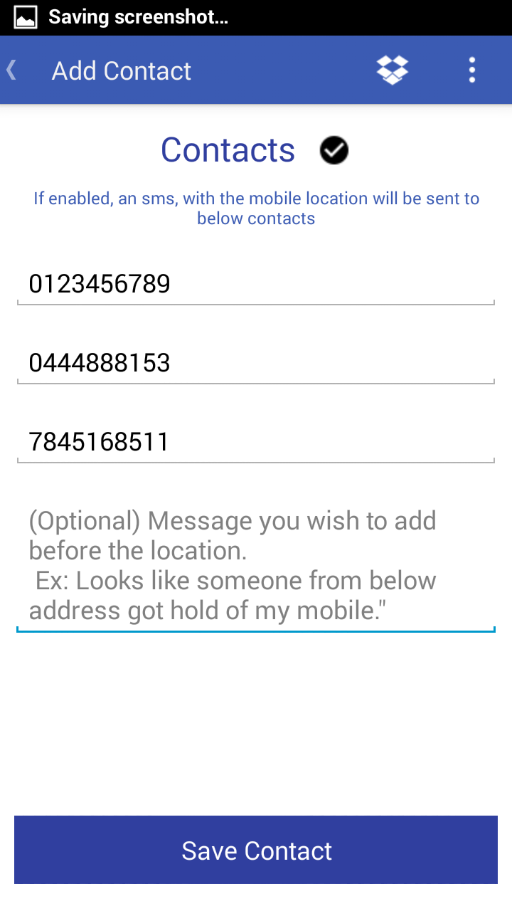 - Send the photo and location when someone messes with your device with predefined contacts also sync with your Dropbox account.