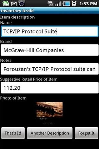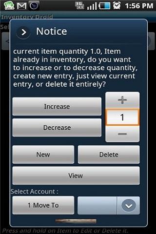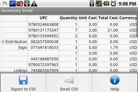 Android's only full Inventory Management App. Get a FREE PC Inventory Desk app at www.InventoryDroid.com EMAIL ME ANY UPC BUGS OR CSV IMPORT ISSUES YOU MIGHT HAVE. Visit InventoryDroid.com for a complete Inventory Droid features list, screenshots, demo video, and more. Inventory Features: -Scan Barcode for item info and photo -Add Custom fields, field units, scannable fields -CSV import/export/email -Account Backup/Restore -Save Photos, receipts on SD in special folders -Support multiple accounts & categories -Loan reminder -Inventory Asset Grid -Shopping features -move items between Inventory Accounts ***IMPORTANT*** It is essential to backup all your accounts before any update. This will insure that you have backups in case an issue arises while doing the update. RomiSys is NOT responsible to any loss of data due any issues occurring on the device or application for any reason whatsoever. To backup your accounts, enter EACH account and press Menu->Settings->Import\Export->Export to Backup (with Photos) ****************