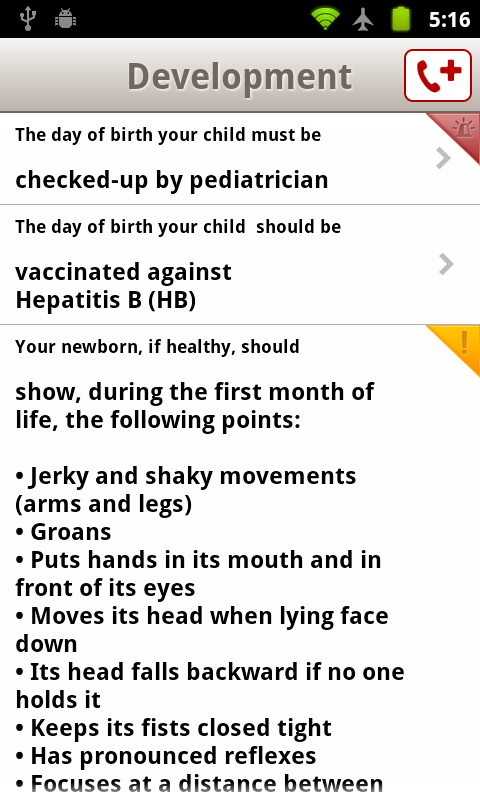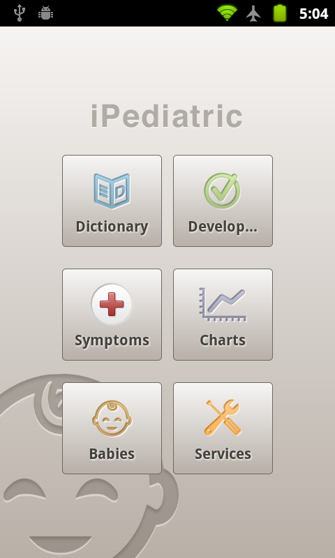 ★★★ iPediatric is an application for fathers, mothers, caretakers, or tutors for babies FROM 0 TO 12 MONTHS, who are born at term and do not suffer from any neonatal illnesses. ★★★ Visit our website for more information: www.ipediatric.es Scientifically sound application whose medical content has been developed by three prestigious specialists from the Sant Joan de Déu Hospital in Barcelona: Doctors Santiago García-Tornel Florensa, Juan José García and José María Quintillá Martínez. iPediatric is a fun and entertaining way to control the health of a baby and to enjoy seeing how it grows and develops, register its progress, and also share it in social networks. If the baby gets sick or shows worrying symptoms, although at times difficult to interpret, iPediatric offers a powerful deciding tool that can guide parents and suggest guidelines to follow, NEVER A DIAGNOSIS. It consists of 5 sections: - Dictionary: in common language and briefly describes the 125 most common illnesses in babies and suggests guidelines for home treatment. - Development: Chronological list of psychomotor development milestones that the baby should achieve in its first year, alarms for possible disease symptoms, check-ups, and vaccines. If you link to the Android Calendar, it will alert you about future progress and warn you of any possible delays. The achieved milestones can then be shared on social networks or e-mail. - Query: more than 80 symptoms. The intelligent query helps give advice using everyday language. It follows a emergency room’s typical selection protocol: before delving into the symptom in question, it suggests a series of questions in order to rule out serious symptoms that may have gone unnoticed to parents and that may require immediate attention. If there are none, the search goes through questions about possible symptoms associated with what has already been entered. The query also accounts for the baby’s age: newborn, 1 to 3 months, 3 to 12 months. The result of the query is presented in the colors of a traffic light: red for cases that require immediate medical attention, yellow for those that indicate that you should consult a pediatrician’s within 24 hours, and green for those that are not urgent and can wait until the next routine check-up. From each screen, you can call the doctors whose numbers have been previously recorded when you originally entered your baby’s information, and offers direct access to the dictionary entry related to the issue in question. - Graphics: if you regularly enter the baby’s height and weight, iPediatric automatically draws a growth graph alongside the WHO growth charts and lets you keep track of your baby’s growth. - Baby’s Profile: iPediatric requires you to register one or more babies and contribute some obligatory data in order to ensure that the application functions as best as possible. The profile allows you to include a picture that can also be used as a milestone tracker (first words, first tooth, etc.), for posting on social networks, and to communicate any medical incidents (with photo if desired) to your pediatrician by e-mail. - Services.