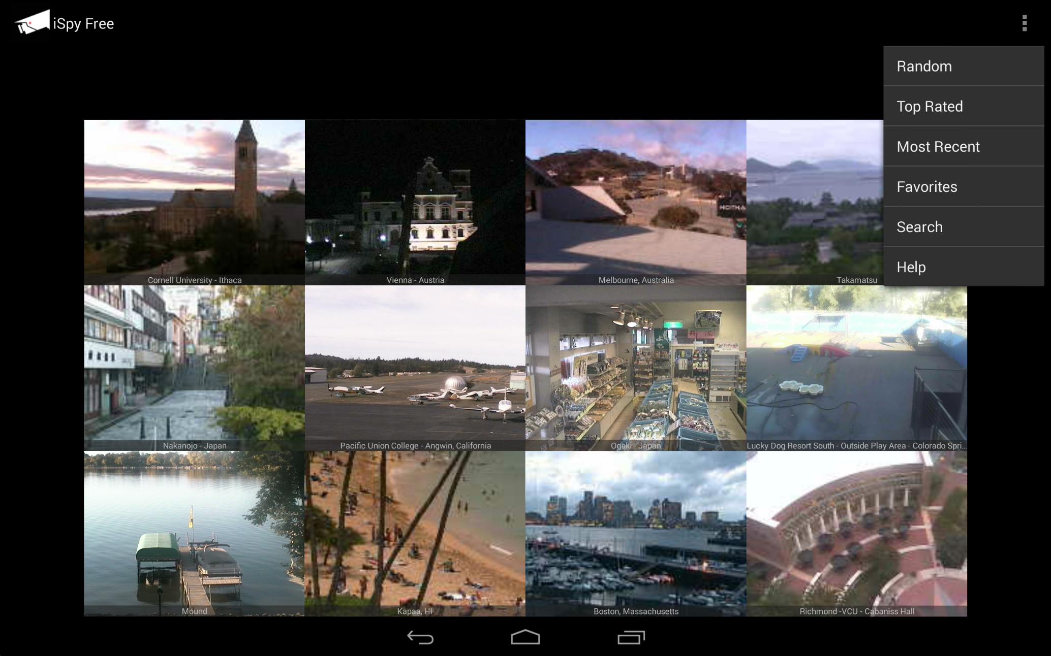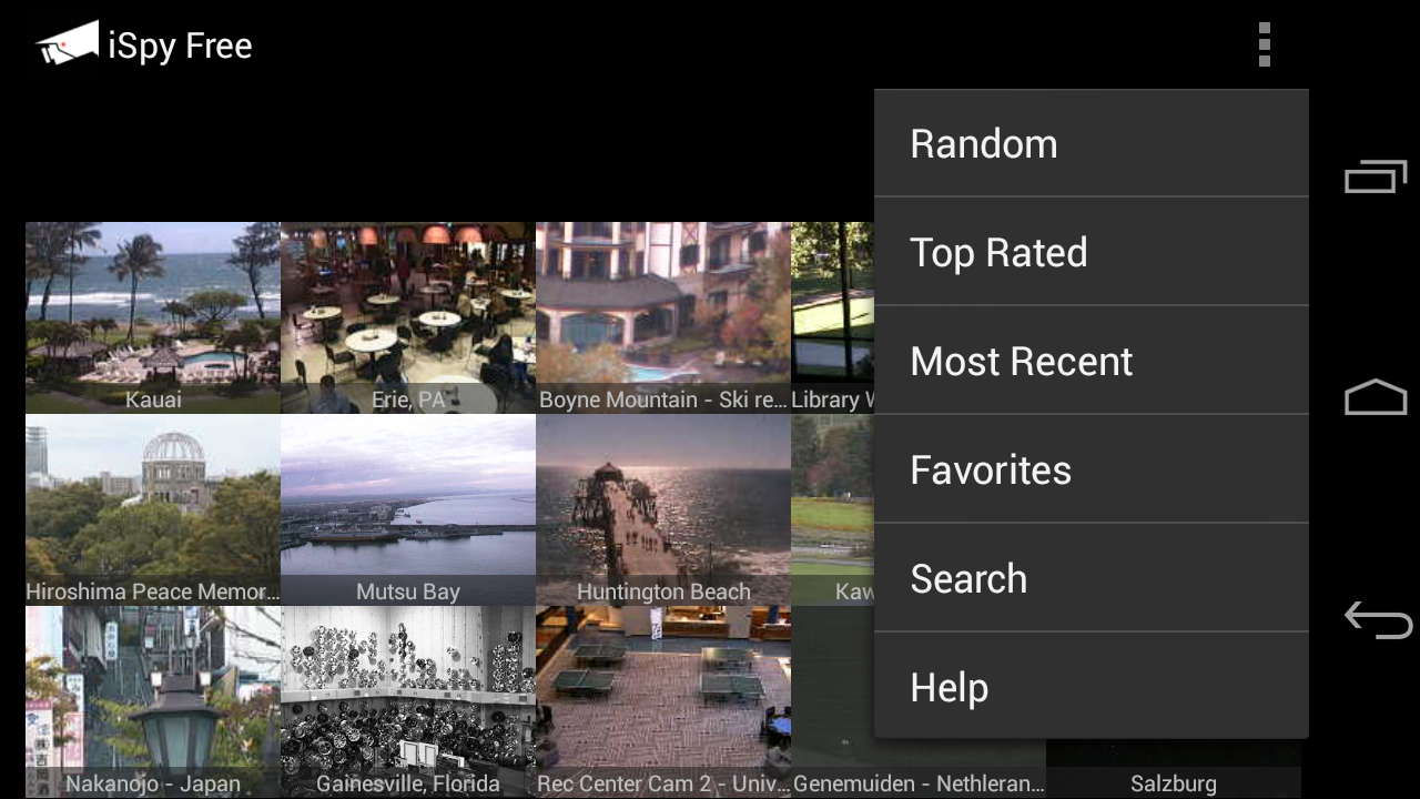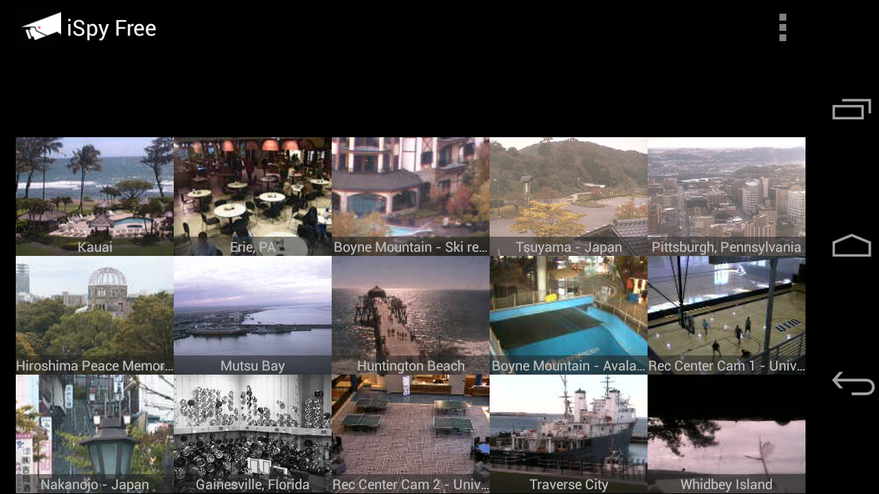iSpy Cameras Free is the free, ad-supported version of iSpy Cameras. iSpy Cameras Free allows you to view and control thousands of public video cameras from around the world in real-time from your Android device over WiFi and EDGE/3G/4G/LTE. iSpy Cameras has been the #1 Paid iPhone App in the UK, Ireland, Italy, Sweden, Korea, and Croatia as well as the #1 Paid iPhone Entertainment App in Japan, Hong Kong, and Australia. iSpy Cameras was also one of the Top 10 Bestselling Paid Entertainment iPad Apps of 2010! Yes, the cameras are all LIVE! Nothing is pre-recorded! Check out this thread in our discussion forum for our responses to some of the iPhone iSpy Cameras reviews: http://skjm.com/forum/index.php?topic=504.0 We have thousands of cameras in our database, with daily updates to remove any cameras that may have temporarily gone offline. New quality cameras are added every week! Choose "Most Recent" from the menu to see the latest live cams! To view cameras from a certain area, choose "Search" from the menu. To request cameras from a specific area, please send us an e-mail or let us know in the discussion forum as opposed to requesting it in a 1-star review. Thanks! :) Visit http://skjm.com/ispy/vid.php to view the iSpy Demo & Features video! - Swipe back and forth between pages of camera thumbnails that are updating in real-time. - Tap a thumbnail to zoom in. Double-tap or press Back to zoom out. - If the camera supports it, tap the Control button to control it. (You may have to wait in line for your turn.) - Swipe to move the camera, pinch to zoom in and out. (Zoom may not be supported by some cameras.) - Choose from a number of camera presets, if available. - Save cameras as your favorites. - Save snapshots to your Gallery. - Rate cameras. Press Menu to choose from the following camera lists: - Random - Displays a random selection of cameras. - Top Rated - Displays the cameras sorted by average rating. - Most Recent - Displays the cameras sorted by the date and time they were added. - Favorites - Displays your favorite cameras. You can also search through the database of cameras by Category, Country, State, City, or Keywords. If you are looking to connect to your own private webcams and network cameras (and receive Notifications on your device when motion is detected) then check out our other application, iCam - http://skjm.com/icam/