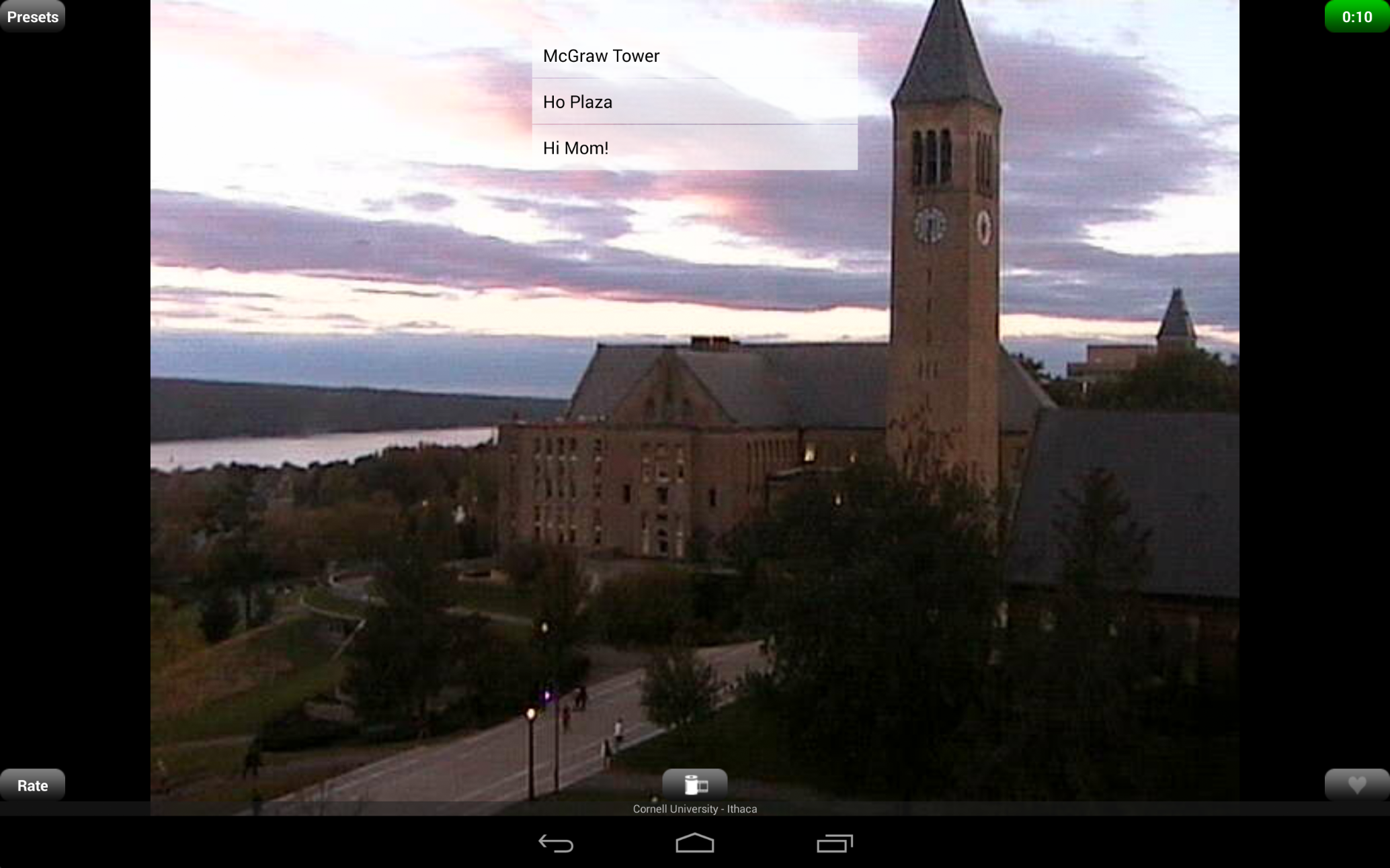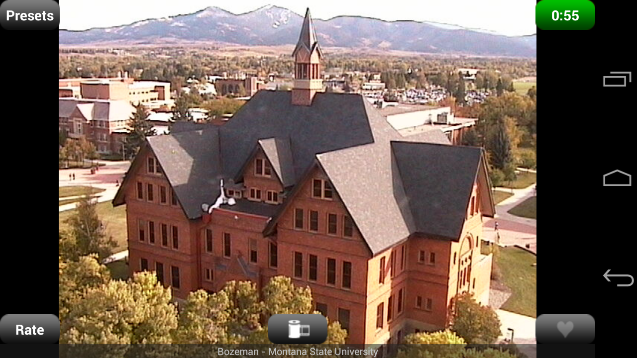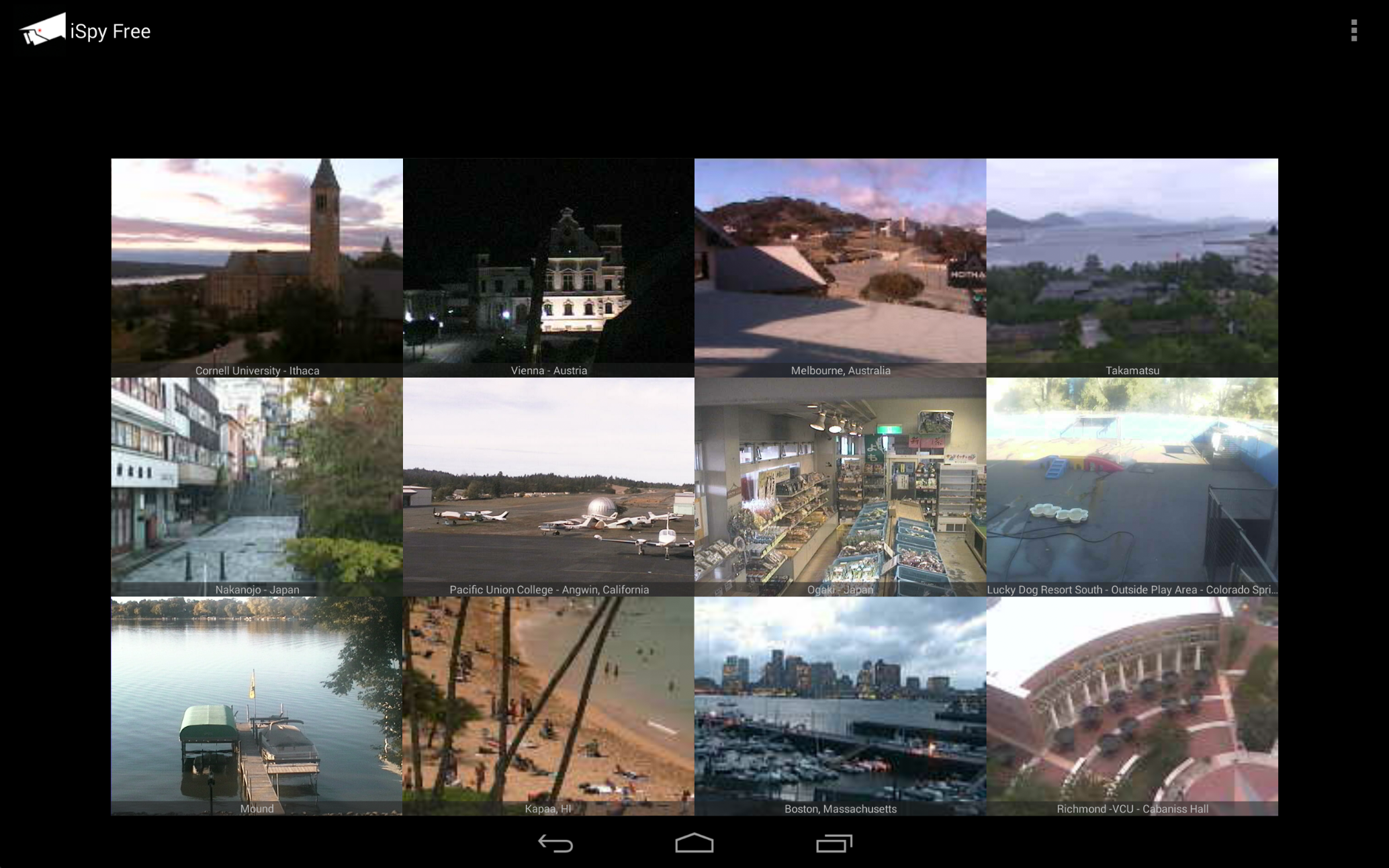 iSpy Cameras Free is the free, ad-supported version of iSpy Cameras. iSpy Cameras Free allows you to view and control thousands of public video cameras from around the world in real-time from your Android device over WiFi and EDGE/3G/4G/LTE. iSpy Cameras has been the #1 Paid iPhone App in the UK, Ireland, Italy, Sweden, Korea, and Croatia as well as the #1 Paid iPhone Entertainment App in Japan, Hong Kong, and Australia. iSpy Cameras was also one of the Top 10 Bestselling Paid Entertainment iPad Apps of 2010! Yes, the cameras are all LIVE! Nothing is pre-recorded! Check out this thread in our discussion forum for our responses to some of the iPhone iSpy Cameras reviews: http://skjm.com/forum/index.php?topic=504.0 We have thousands of cameras in our database, with daily updates to remove any cameras that may have temporarily gone offline. New quality cameras are added every week! Choose "Most Recent" from the menu to see the latest live cams! To view cameras from a certain area, choose "Search" from the menu. To request cameras from a specific area, please send us an e-mail or let us know in the discussion forum as opposed to requesting it in a 1-star review. Thanks! :) Visit http://skjm.com/ispy/vid.php to view the iSpy Demo & Features video! - Swipe back and forth between pages of camera thumbnails that are updating in real-time. - Tap a thumbnail to zoom in. Double-tap or press Back to zoom out. - If the camera supports it, tap the Control button to control it. (You may have to wait in line for your turn.) - Swipe to move the camera, pinch to zoom in and out. (Zoom may not be supported by some cameras.) - Choose from a number of camera presets, if available. - Save cameras as your favorites. - Save snapshots to your Gallery. - Rate cameras. Press Menu to choose from the following camera lists: - Random - Displays a random selection of cameras. - Top Rated - Displays the cameras sorted by average rating. - Most Recent - Displays the cameras sorted by the date and time they were added. - Favorites - Displays your favorite cameras. You can also search through the database of cameras by Category, Country, State, City, or Keywords. If you are looking to connect to your own private webcams and network cameras (and receive Notifications on your device when motion is detected) then check out our other application, iCam - http://skjm.com/icam/