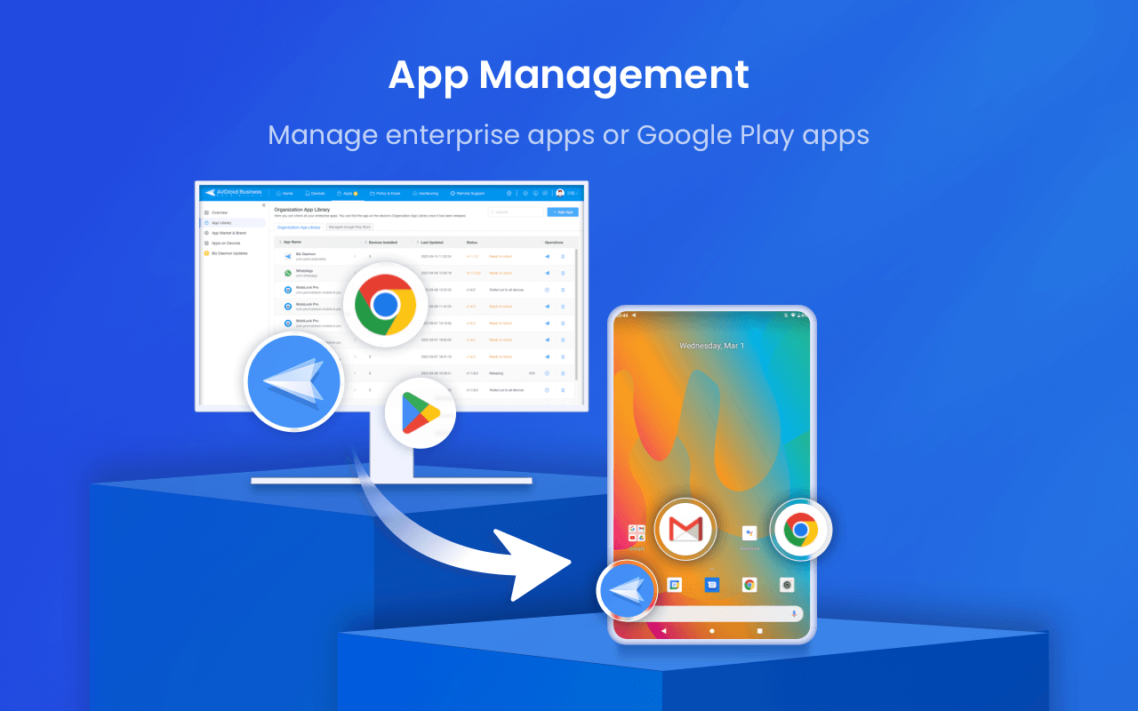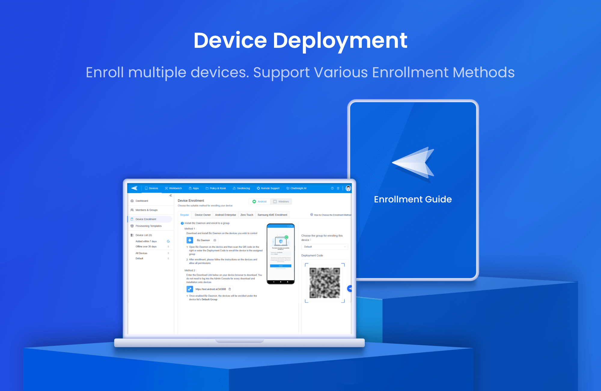 AirDroid Business è una soluzione per la gestione dei dispositivi mobili Android. Offre potenti funzionalità di accesso e controllo remoto, gestione centralizzata di dispositivi e app, protezione dei dati, blocco e monitoraggio dei dispositivi, tracciamento della posizione, gestione dei file, gestione degli utenti, ecc.