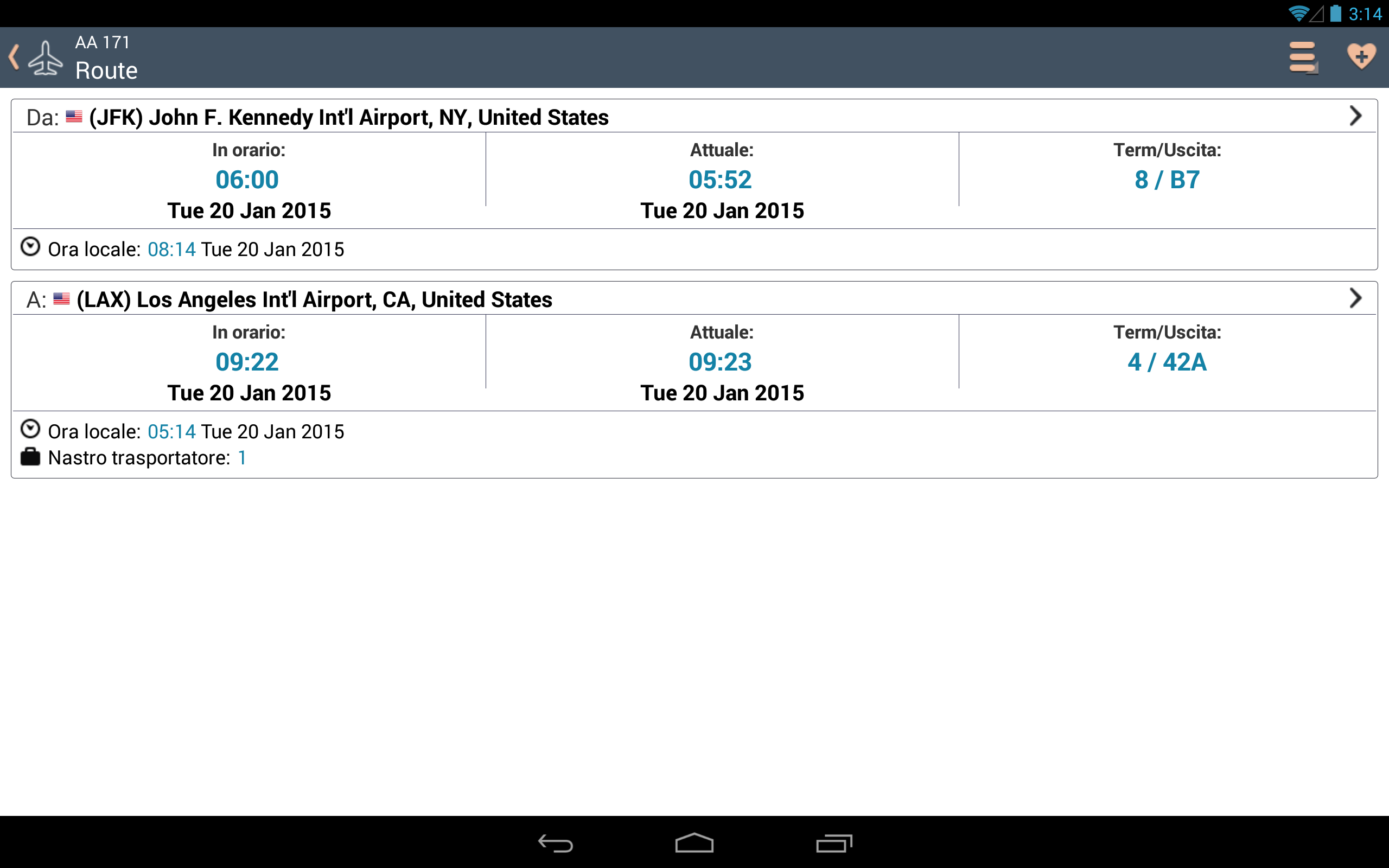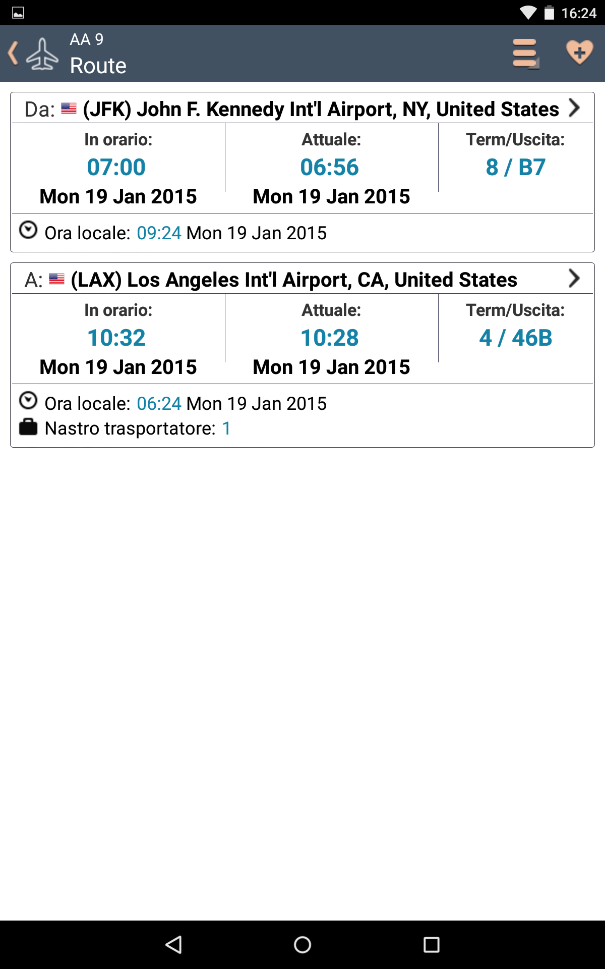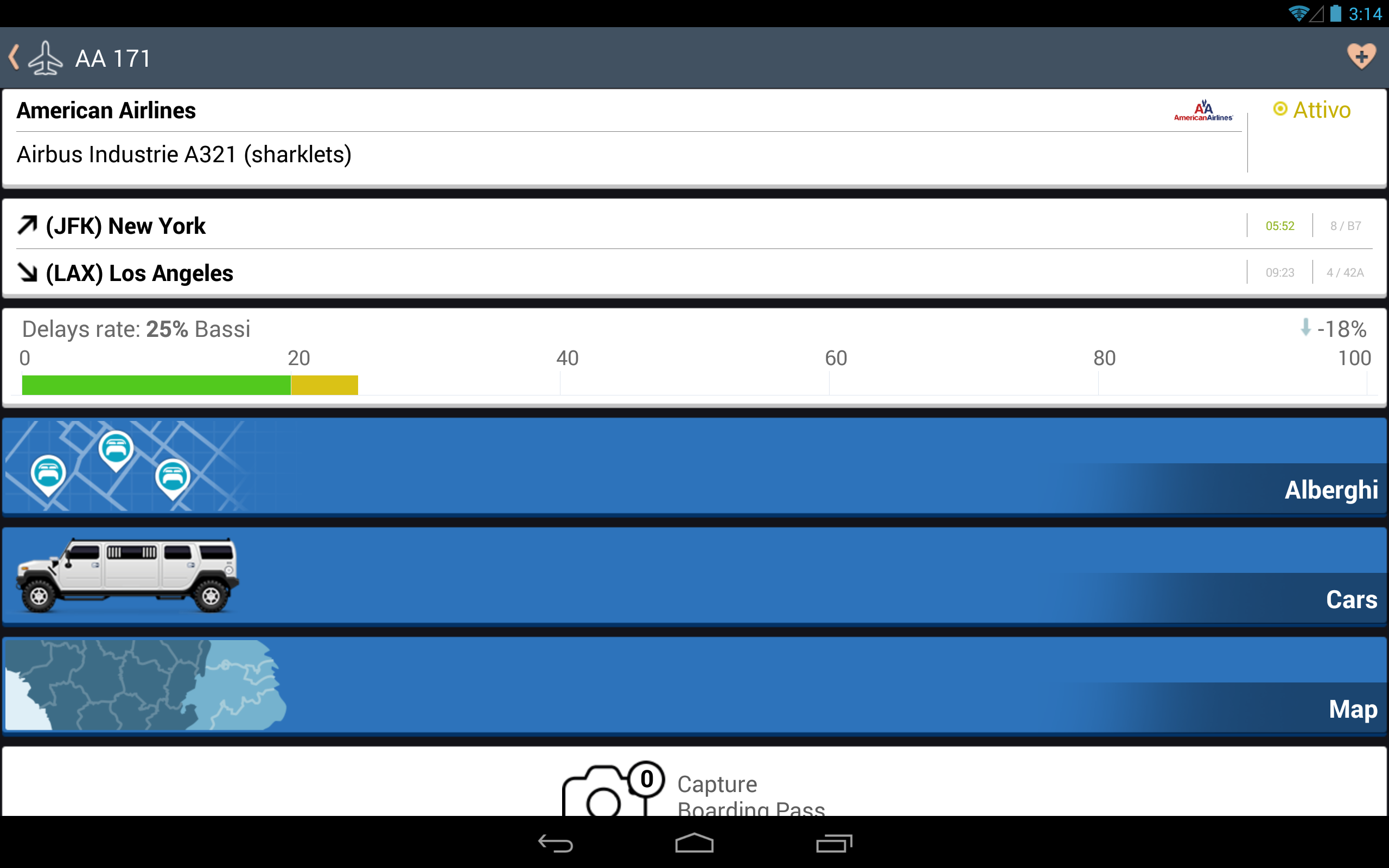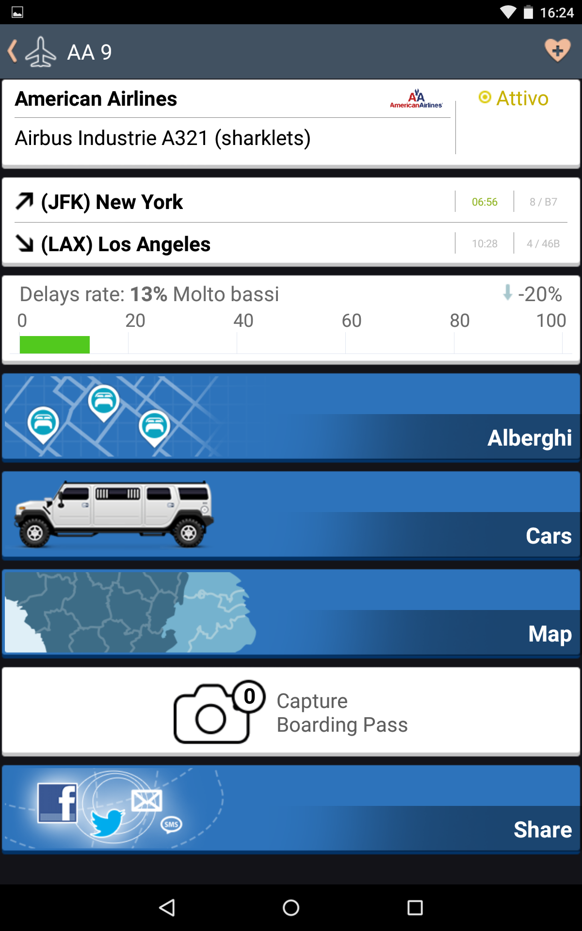 ✈ STATO DI VOLO - La posizione attuale del velivolo con la velocità effettiva per la maggior parte dei voli. Usarlo come vostro radar volo virtuale personale per conoscere la velocità del velivolo, latitudine, longitudine e altitudine ✈ LA MAGGIOR COPERTURA DI VOLI, AEROPORTI E COMPAGNIE AEREE - 16500 aeroporti. Per aeroporti sono disponibili informazioni sullo stato dei voli e del meteo, l’esatta posizione e la velocità per i voli. - 1500 compagnie aeree. La stragrande maggioranza delle compagnie aeree sono le compagnie aeree commerciali, tuttavia ci sono alcuni charter e cargo: Alitalia, Air Dolomiti, Air One… - L’applicazione permette di individuare gli aeroporti più prossimi alla vostra posizione corrente nel raggio di 200 km ✈ TEMPO REALE INFORMAZIONI SU ARRIVI E PARTENZE - E possibile filtrare i dati di Arrivi e Partenze in aeroporto per compagnie aeree, stato del volo e intervalli di tempo - Advanced ordinamento - Intervallo di 3 giorni (72 ore) tempo per arrivi e partenze ✈ SYNC - Calendar app - TripIt ✈ PUSH-NOTIFICHE - Le segnalazioni di variazioni di stato volo ✈ INFORMAZIONI SUI RITARDI NEGLI AEROPORTI E SUL METEO IN AEROPORTO - Ritardo su una scala a 5 punti con la fase 0.2 - Temperatura reale - Velocità e direzione del vento - Previsioni meteo dettagliate 15 giorni ✈ PIANI TERMINALE E MAPPA DEI POSTI - Disponibile per le maggiori compagnie aeree e aeroporti. Scarica tutto in una volta dalla scheda "Contenuto aggiuntivo" - Specifiche per tipi di aeromobili 400 + ✈ RICERCA DEL VOLO - Per numero del volo (per un anno) - Per rotta - Lista dei 10 voli e aeroporti visti di recente - Voli indiretti ✈ SERVIZI - Cerca hotel tramite booking.com - Noleggio auto via rentalcars.com - Luoghi in aeroporto tramite Foursquare - Il radar mostra aeroporti e voli più vicini ✈ PREFERITI - Aggiungi voli e aeroporti scorrendo da destra verso sinistra ✈ POSSIBILITÀ DI CONDIVISIONE DELLE INFORMAZIONI RELATIVE ALLO STATO DEL VOLO TRAMITE: - SMS - Email - Twitter - Facebook ✈ MULTILINGUE - 29 lingue supportate ✈ UNIVERSAL APP - Versione unica per telefoni Android e compresse