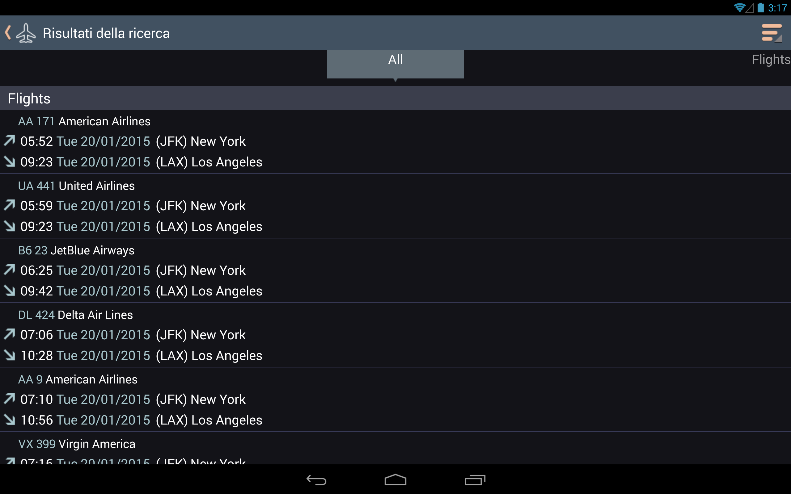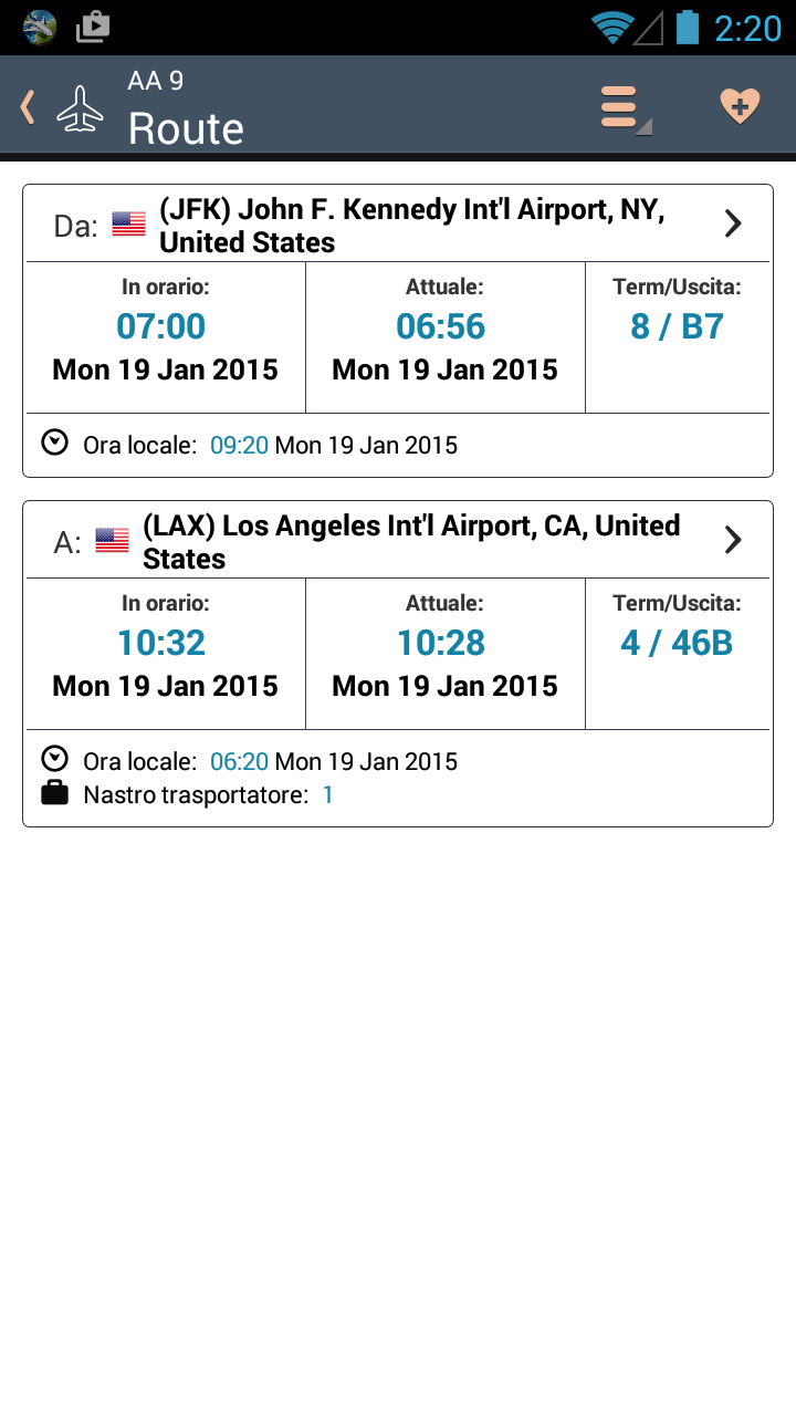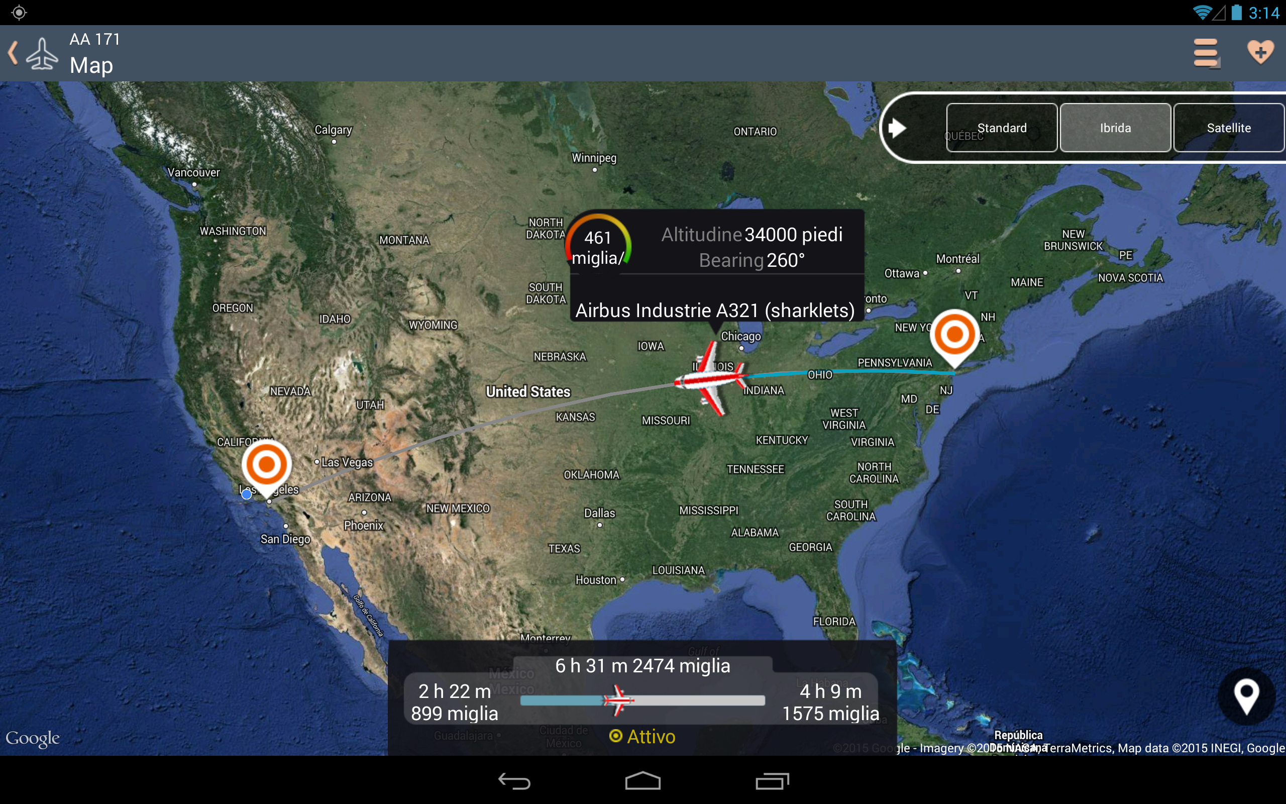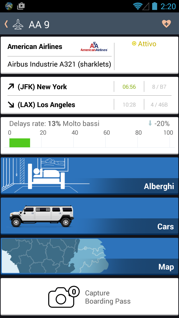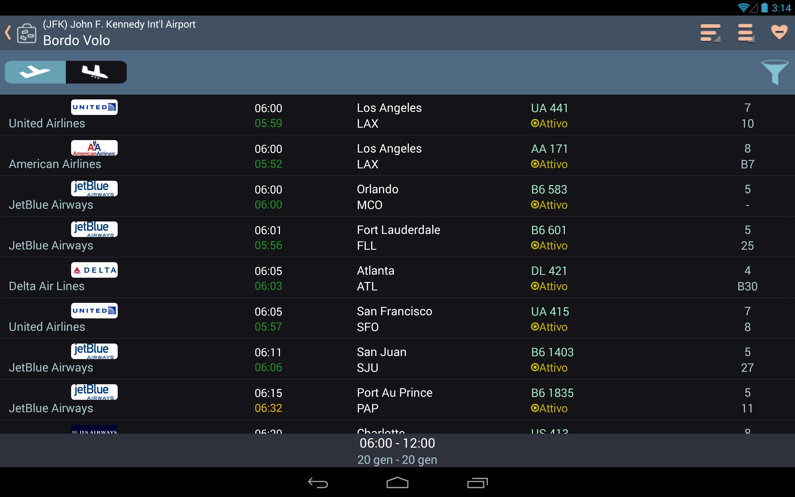 ✈ STATO DI VOLO - La posizione attuale del velivolo con la velocità effettiva per la maggior parte dei voli. Usarlo come vostro radar volo virtuale personale per conoscere la velocità del velivolo, latitudine, longitudine e altitudine ✈ LA MAGGIOR COPERTURA DI VOLI, AEROPORTI E COMPAGNIE AEREE - 16500 aeroporti. Per aeroporti sono disponibili informazioni sullo stato dei voli e del meteo, l’esatta posizione e la velocità per i voli. - 1500 compagnie aeree. La stragrande maggioranza delle compagnie aeree sono le compagnie aeree commerciali, tuttavia ci sono alcuni charter e cargo: Alitalia, Air Dolomiti, Air One… - L’applicazione permette di individuare gli aeroporti più prossimi alla vostra posizione corrente nel raggio di 200 km ✈ TEMPO REALE INFORMAZIONI SU ARRIVI E PARTENZE - E possibile filtrare i dati di Arrivi e Partenze in aeroporto per compagnie aeree, stato del volo e intervalli di tempo - Advanced ordinamento - Intervallo di 3 giorni (72 ore) tempo per arrivi e partenze ✈ SYNC - Calendar app - TripIt ✈ PUSH-NOTIFICHE - Le segnalazioni di variazioni di stato volo ✈ INFORMAZIONI SUI RITARDI NEGLI AEROPORTI E SUL METEO IN AEROPORTO - Ritardo su una scala a 5 punti con la fase 0.2 - Temperatura reale - Velocità e direzione del vento - Previsioni meteo dettagliate 15 giorni ✈ PIANI TERMINALE E MAPPA DEI POSTI - Disponibile per le maggiori compagnie aeree e aeroporti. Scarica tutto in una volta dalla scheda "Contenuto aggiuntivo" - Specifiche per tipi di aeromobili 400 + ✈ RICERCA DEL VOLO - Per numero del volo (per un anno) - Per rotta - Lista dei 10 voli e aeroporti visti di recente - Voli indiretti ✈ SERVIZI - Cerca hotel tramite booking.com - Noleggio auto via rentalcars.com - Luoghi in aeroporto tramite Foursquare - Il radar mostra aeroporti e voli più vicini ✈ PREFERITI - Aggiungi voli e aeroporti scorrendo da destra verso sinistra ✈ POSSIBILITÀ DI CONDIVISIONE DELLE INFORMAZIONI RELATIVE ALLO STATO DEL VOLO TRAMITE: - SMS - Email - Twitter - Facebook ✈ MULTILINGUE - 29 lingue supportate ✈ UNIVERSAL APP - Versione unica per telefoni Android e compresse