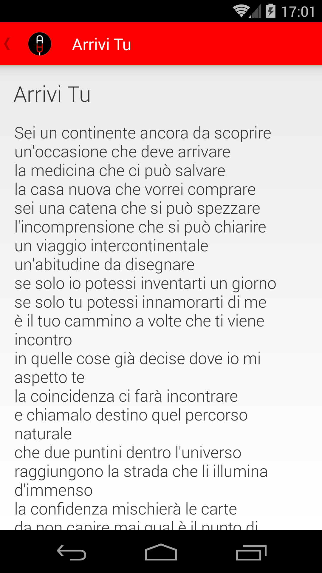 Questa app è tutto quello che i fan di Alessandra Amoroso possono desiderare! È gratis e ti offre moltissime informazioni su Sandrina e la sua musica. All’interno dell’app troverai: • Video ufficiali • Discografia e tracklist degli album • Le ultime notizie • Tutti i testi delle sue canzoni più famose, come Amore puro e Bellezza, incanto e nostalgia Se ami Alessandra Amoroso e non vuoi perderti niente della sua musica scarica subito l’app. È gratis! Alessandra Amoroso è un'app sviluppata e offerta gratuitamente come veicolo di promozione e divulgazione dell'attività artistica di Alessandra Amoroso. Per qualsiasi dubbio o richiesta é possibile contattare AllSongs al seguente indirizzo email: [email protected]