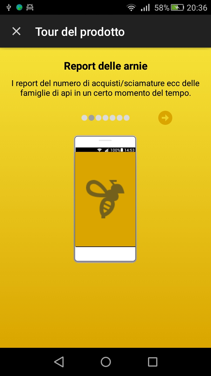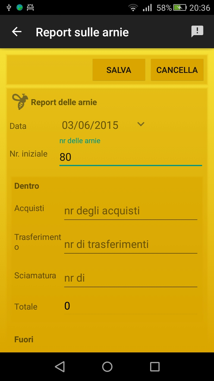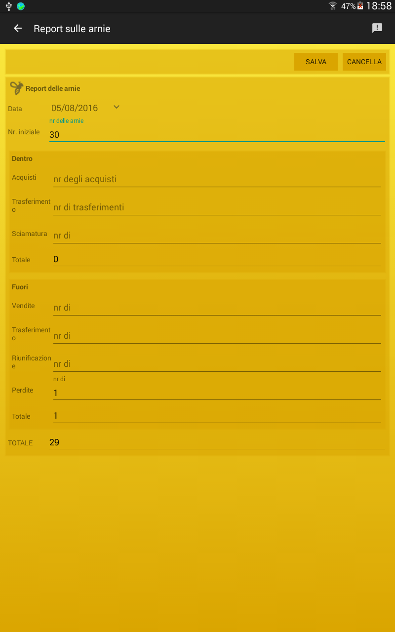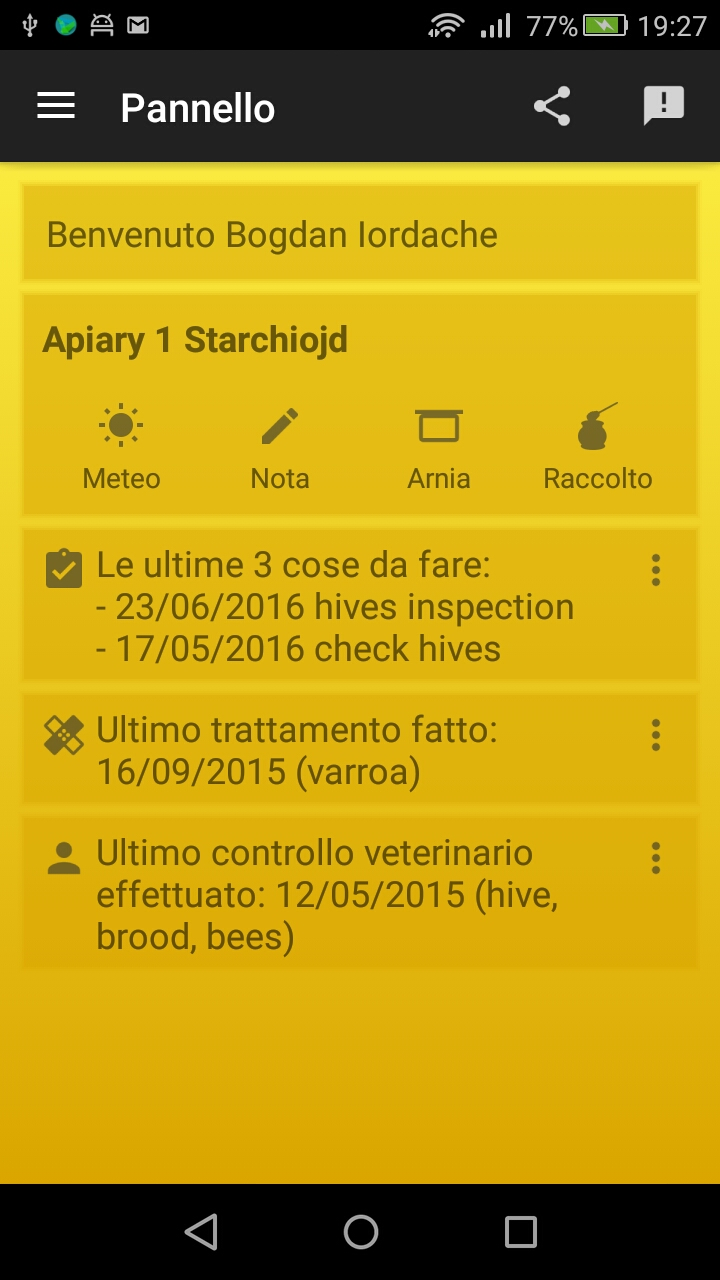 • Dettagli arnia: tipo, fondo, numero di telai, stato (attiva, immagazzinata, venduta), risorse e stato delle api, forza della famiglia(debole, normale)