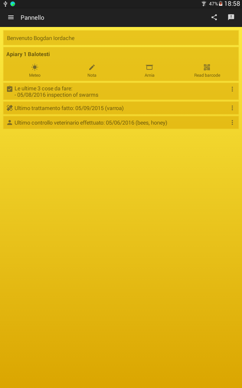 L’Agenda dell’Apicoltore consente di registrare sul tuo dispositivo mobile le informazioni sul numero, la salute e il mantenimento di ogni famiglia di api, i trattamenti effettuati ed altre operazioni nel campo apistico.