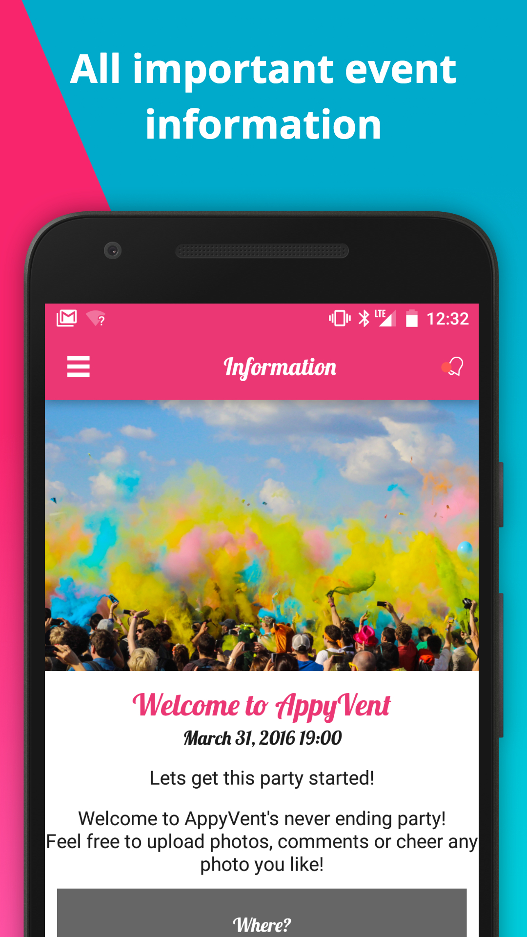 AppyVent is an exclusive events social network for guests and their hosts to party closely together, privately. -AppyVent- is FREE-. As a guest you'll be invited to AppyVent by your hosts or by events you joined. The guest experience: - Watch photos & videos captured by other guests. - Capture and share your own photos and videos. - Broadcast videos & photos live during the event. - A personalized, VIP experience - Get updated with your seating arrangements. - Get important announcements and special updates from event hosts. - Manage all your events in one place. - Go back in time to view past events or check for your upcoming events. - See who else from your friends will be there with you. - Map & Driving directions to event A Host? Planning an event soon? *We've got you covered!* We have everything you need to create an amazing, unforgettable event! Visit http://appyvent.com to rock your guests. It's FREE