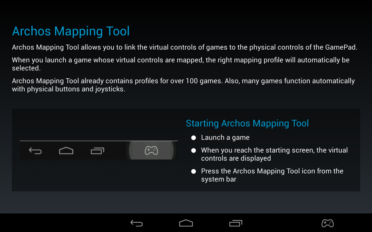 Questa applicazione è solo per Archos GamePad. Scatena la potenza di gioco Android con lo strumento brevettato Mapping gioco, in esclusiva per i dispositivi ARCHOS. - Mappa qualsiasi gioco virtuale controllato - Facile da usare, drag-and-drop - mappa un gioco in pochi secondi - Mappatura dei profili di caricare automaticamente quando si avvia il gioco - Centinaia di profili inclusi per i giochi più popolari Già Catalogo giochi, non erano stati originariamente scritti per i controlli fisici, in grado di lavorare grazie allo strumento di mappatura gioco ARCHOS.