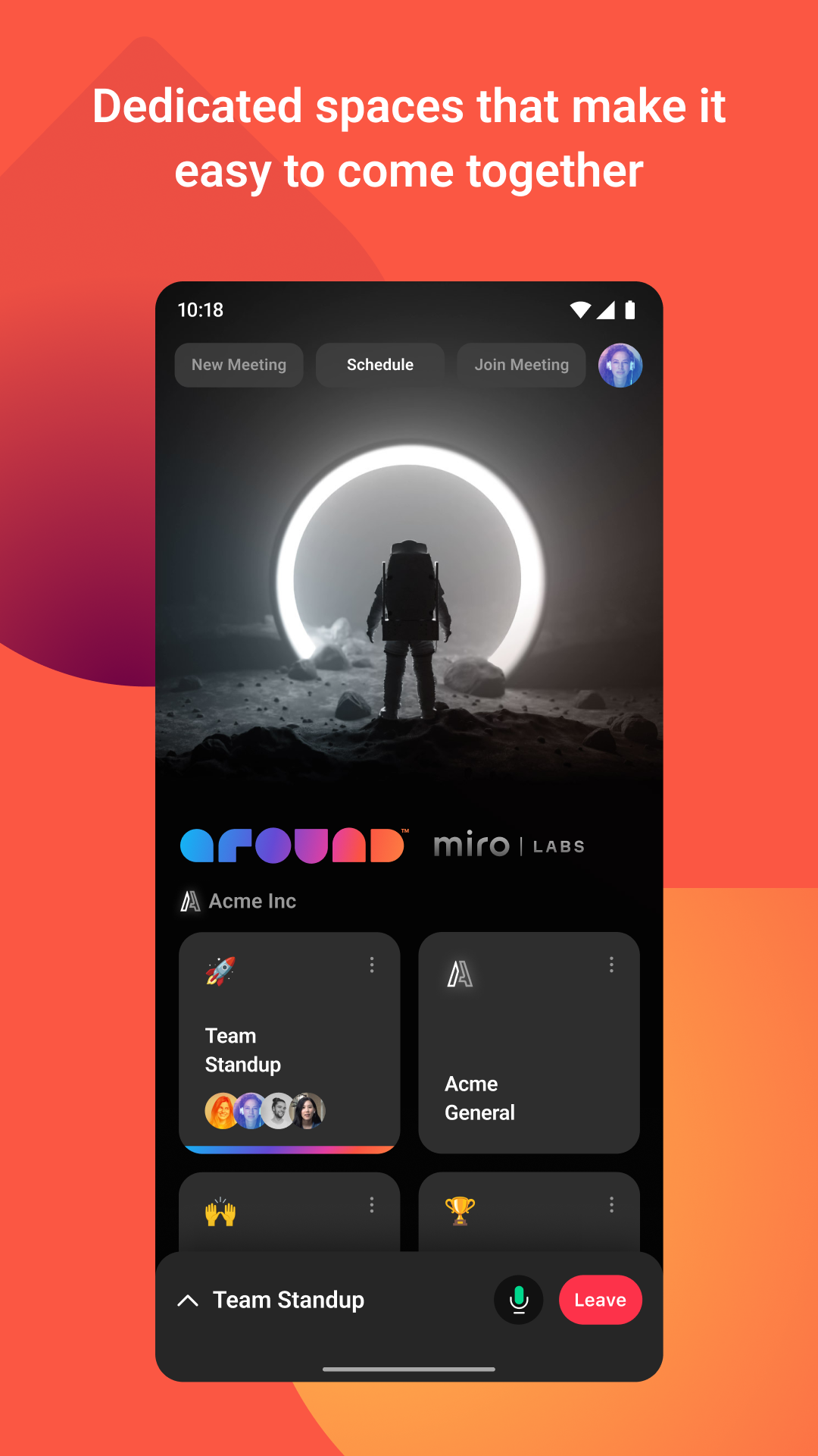 Con Around di Miro Labs (Around), i tuoi team possono co-creare, ascoltarsi e vedersi senza problemi da un unico spazio, indipendentemente da dove si trovino. Le stanze coinvolgenti e coinvolgenti di Around sono progettate per stabilire connessioni profonde tra i team e favorire un coinvolgimento ad alta energia. Con Around, il tuo team sentirà l'ispirazione e si concentrerà sulla creazione della prossima grande novità.