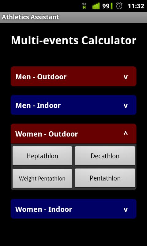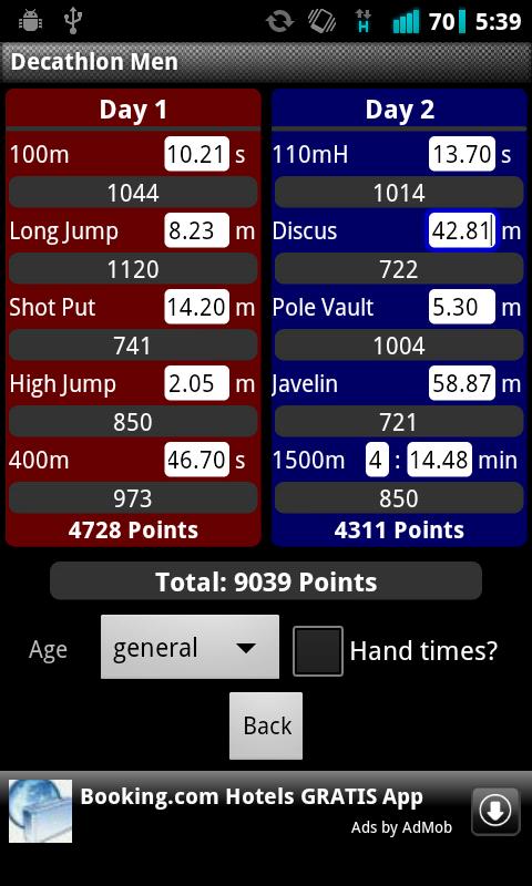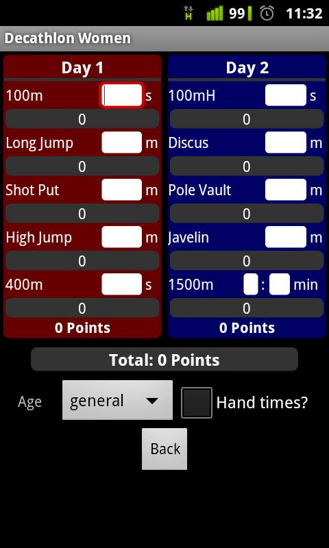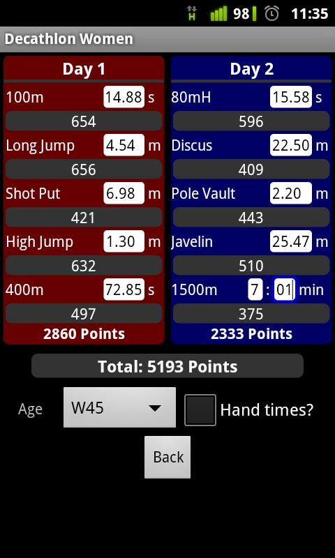 Is an Athletics Multi-Event Calculator. Please support me! There are a donate version on the market that have further functions like stopwatch, save-function and more in the future. You can calculate your scores for Men: * Throwing-Pentathlon * Pentathlon * Heptathlon * Decathlon Women: * Throwing-Pentathlon * Pentathlon * Heptathlon * Decathlon Please give me a feedback by rating and comment(suggestions for improvement, etc.) my programm. Key Words: Track, Calculator, Math, Decathlon, Heptathlon, Pentathlon, Track and Field, Track & Field, Field, Unit, Converter, Score Tracker, Leichtathletik, Zehnkampf, Siebenkampf, Fünfkampf, 10-kampf, 7-kampf, 5-kampf, Mehrkampf, Rechner, Athletics Assistant, athlétisme assistant, Leichtathletik Assistent