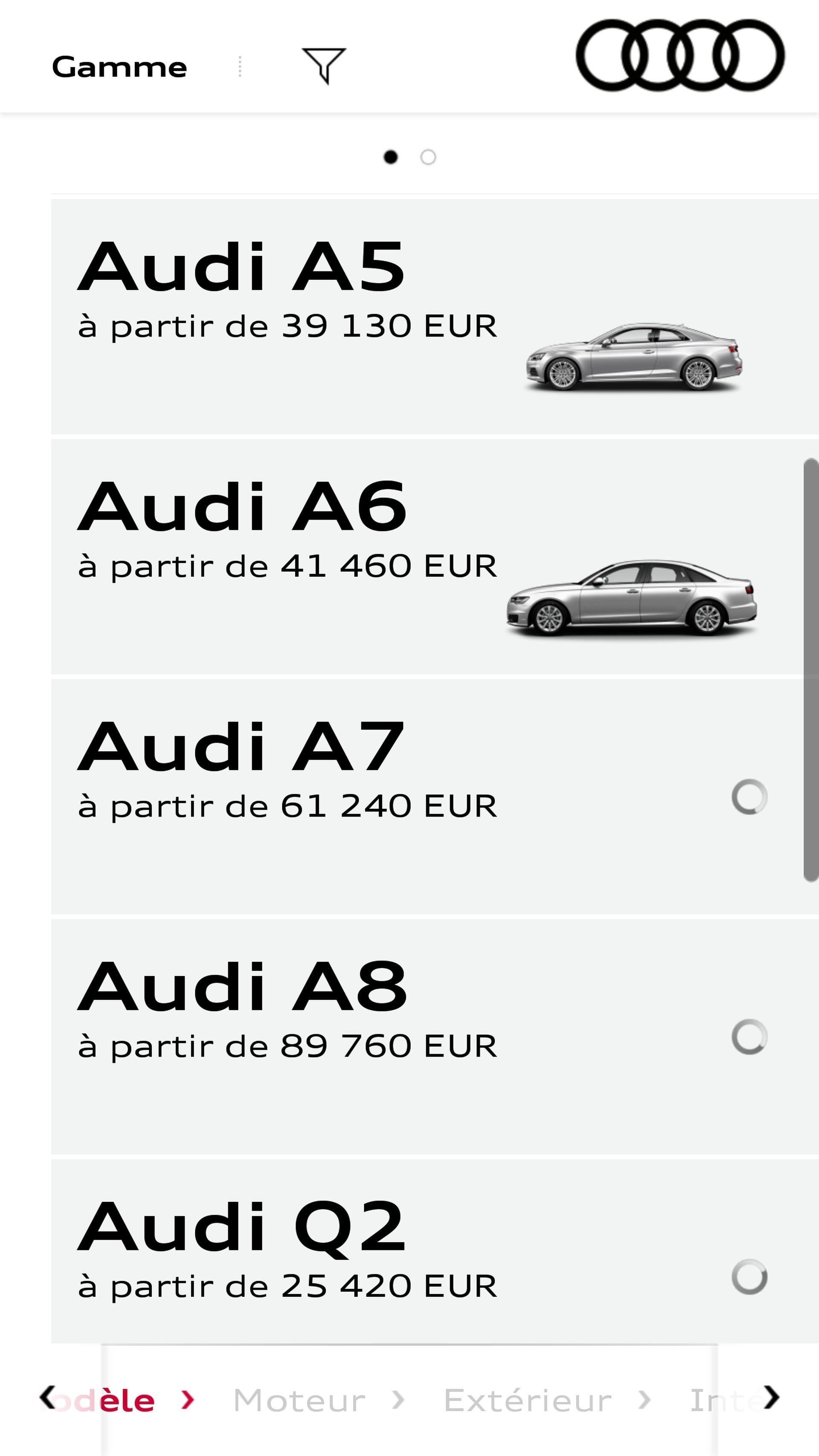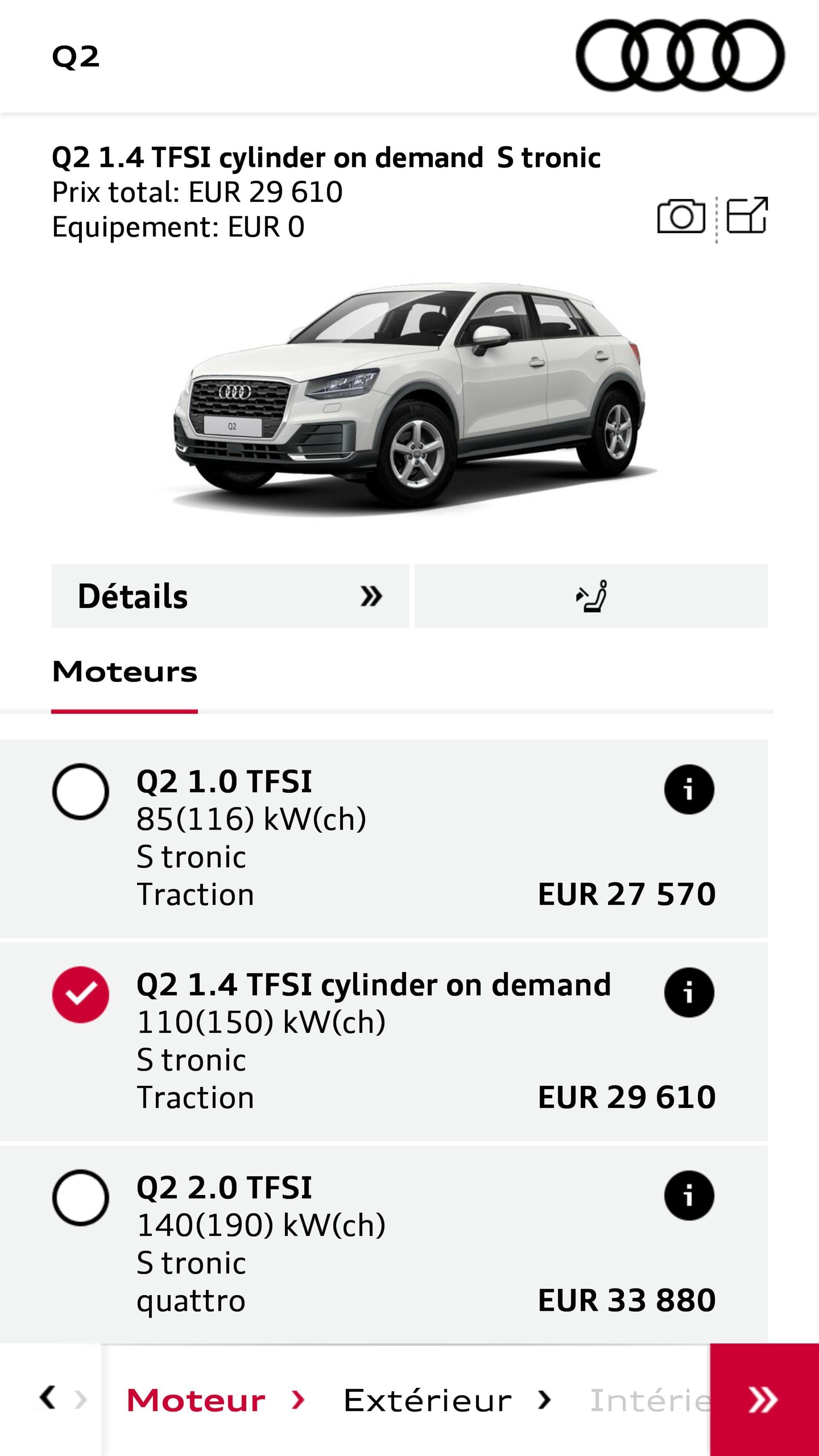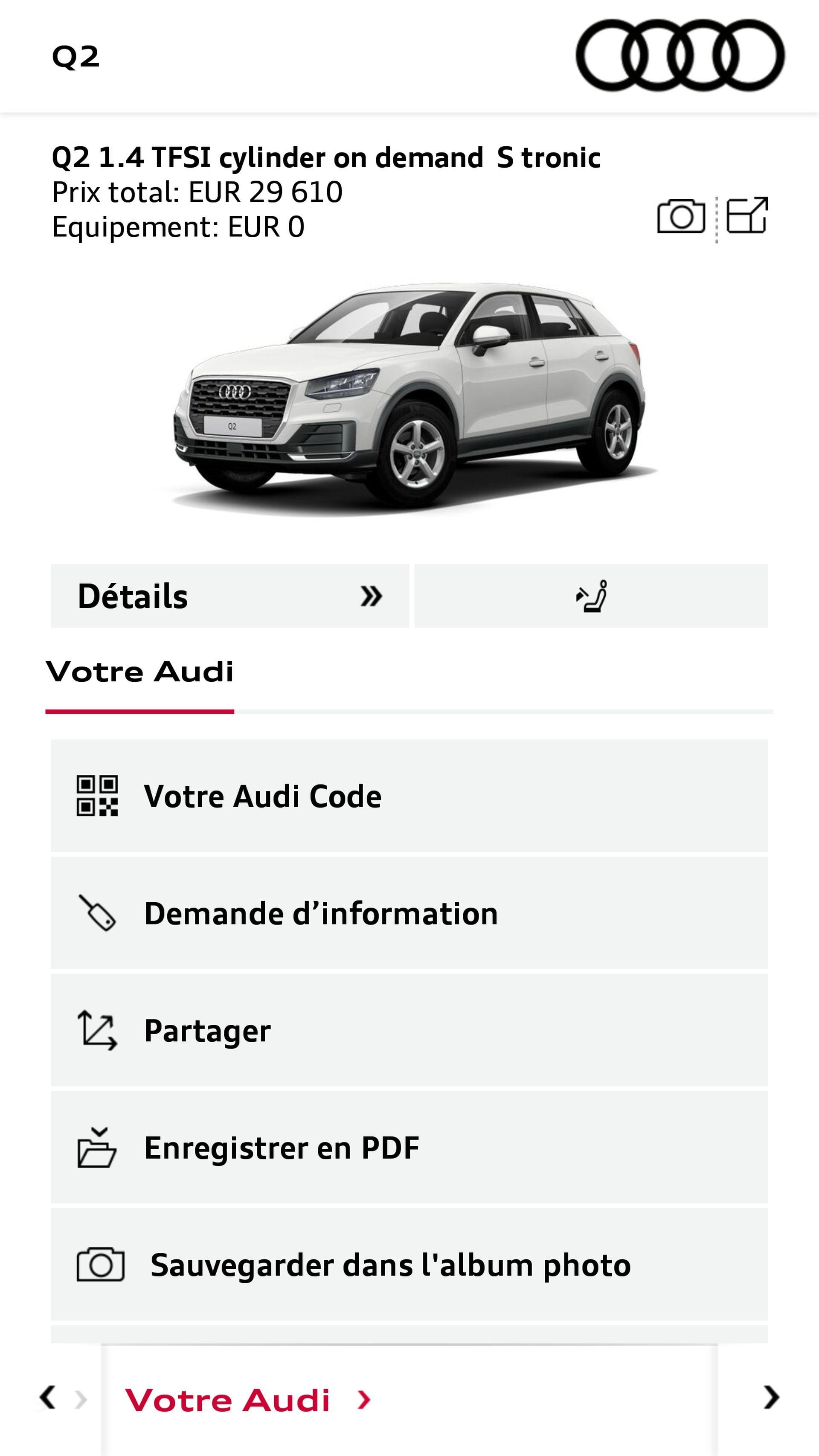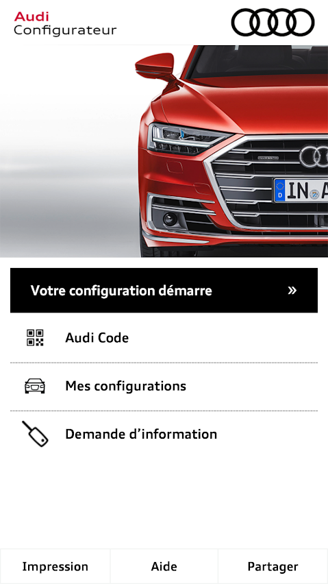 Configurez l’Audi de votre choix grâce à l’application “Audi Configurateur”. Les Audi A1, A3, A4, A5, A6, A7, A8, TT, Q3, Q5, Q7 et R8, ainsi que les modèles S ou RS vous attendent. Choisissez le modèle qui vous correspond, ainsi que les équipements associés. Le configurateur Audi vous présente l’intégralité de la gamme et intègre aussi bien les équipements de série que ceux en options pour vous permettre de créer votre Audi. Découvrez votre Audi sous différents angles de vue et partagez là avec vos amis via Facebook, Twitter, envoyez là par email ou sauvegardez là au format PDF. Grâce à l’application “Audi Configurateur”, vous pouvez créer votre Audi Code qui vous permettra de retrouver votre configuration ultérieurement sur d’autres supports ou de la modifier si besoin. Nous vous souhaitons de profiter pleinement de cette application “Audi Configurateur”. Votre équipe Audi Il s'agit ici d'une offre proposée par l'importateur dans chaque marché. Les données de l'importateur sont disponibles dans les mentions légales contenues dans l'application. L'application utilise les permissions système suivantes: - Internet - pour charger les informations des serveurs Audi - Emplacement - pour chercher les fournisseurs à proximité - Caméra - pour scaner les codes QR afin de faciliter l'accès à la configuration des véhicules - Accès au statut du réseau - pour savoir si l'appareil est en ligne / hors ligne - Écrire vers le périphérique de stockage externe - pour enregistrer les configurations de véhicule au format PDF et les fonds d'écran