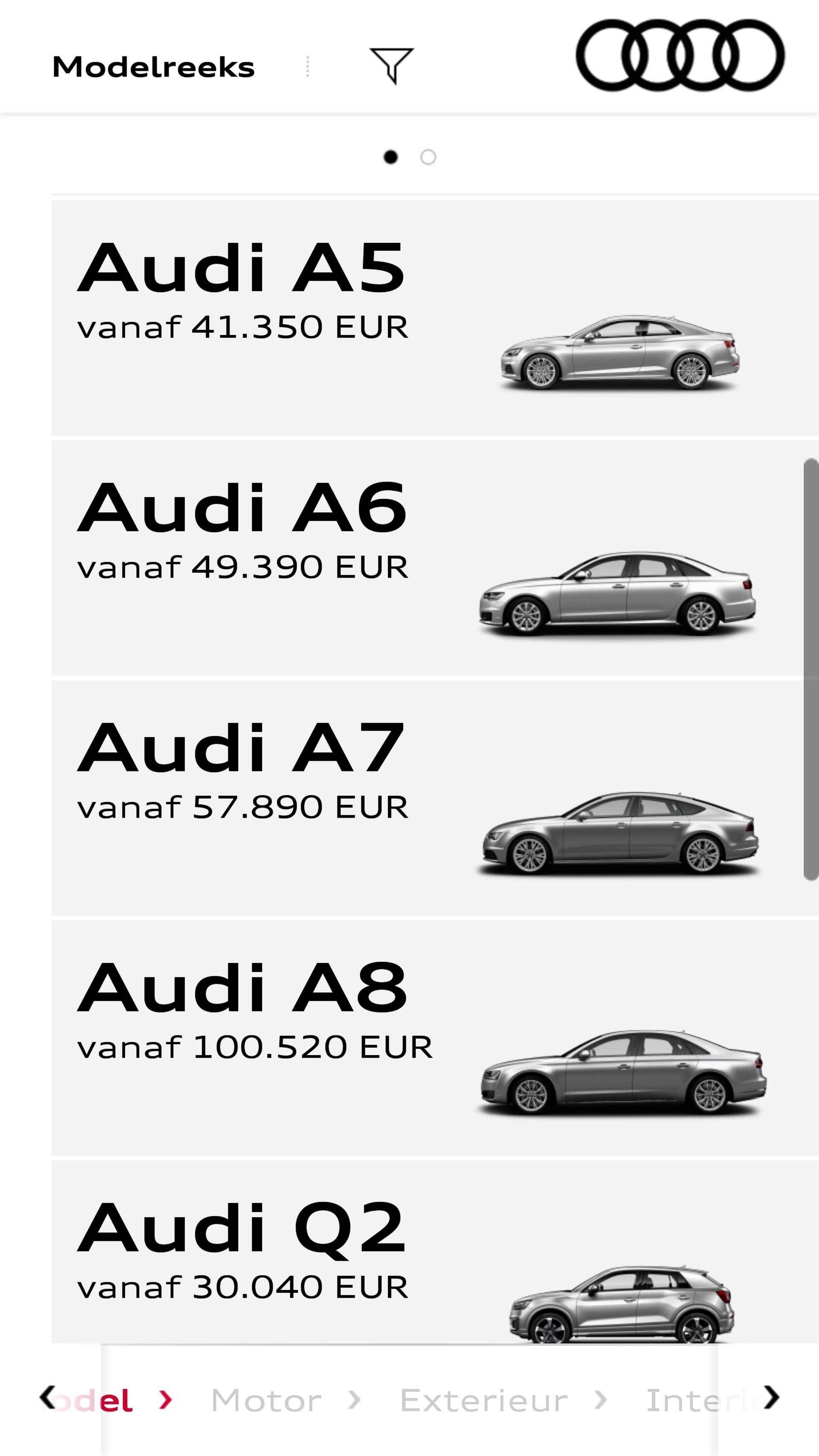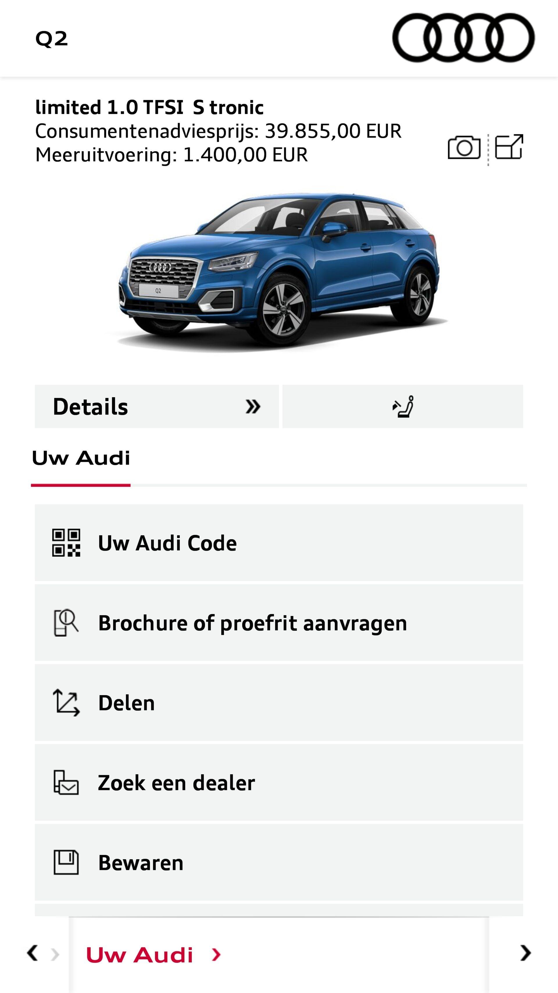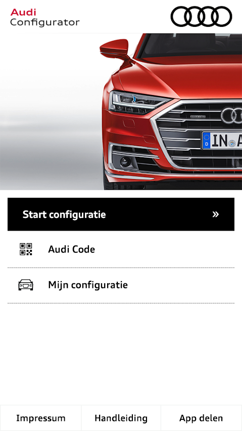 Configureer uw eigen Audi met de Audi configurator app voor de Audi modellijnen A1, A3, A4, A5, A6, A7, A8, TT, Q3, Q5, Q7 en R8 en voor alle S- en RS-modellen. Kies het model en de uitrusting die het beste bij u passen. De configurator app geeft toegang tot het volledige Audi gamma, inclusief alle standaarduitrustingen, opties en Audi Originele Accessoires®. Bekijk uw Audi van alle kanten en deel deze auto met uw vrienden op Facebook en Twitter of via e-mail. De configuratie is als PDF te bewaren. Met de app is ook uw eigen Audi Code aan te maken. Een Audi Code is gekoppeld aan een opgeslagen configuratie. Met de code is de configuratie opnieuw op te roepen. Ook uw Audi dealer kan de configuratie met de Audi Code openen en u aansluitend verder helpen met het keuzeproces. Veel plezier met het samenstellen van uw Audi! Het Audi online-team Het gaat hierbij om een aanbod van de importeur in de betreffende markt. In het impressum van de app vindt u verdere informatie over de importeur. De app maakt gebruik van de volgende systeemmachtigingen: - Internet: om informatie van Audi servers te laden - Locatie: om dealers in de buurt te zoeken - Camera: om QR-codes te scannen, voor gemakkelijk toegankelijke autoconfiguraties - Toegang tot netwerkstatus: om te detecteren of het apparaat online/offline is - Naar externe opslag wegschrijven: om autoconfiguraties als PDF- en achtergrondbestanden op te slaan