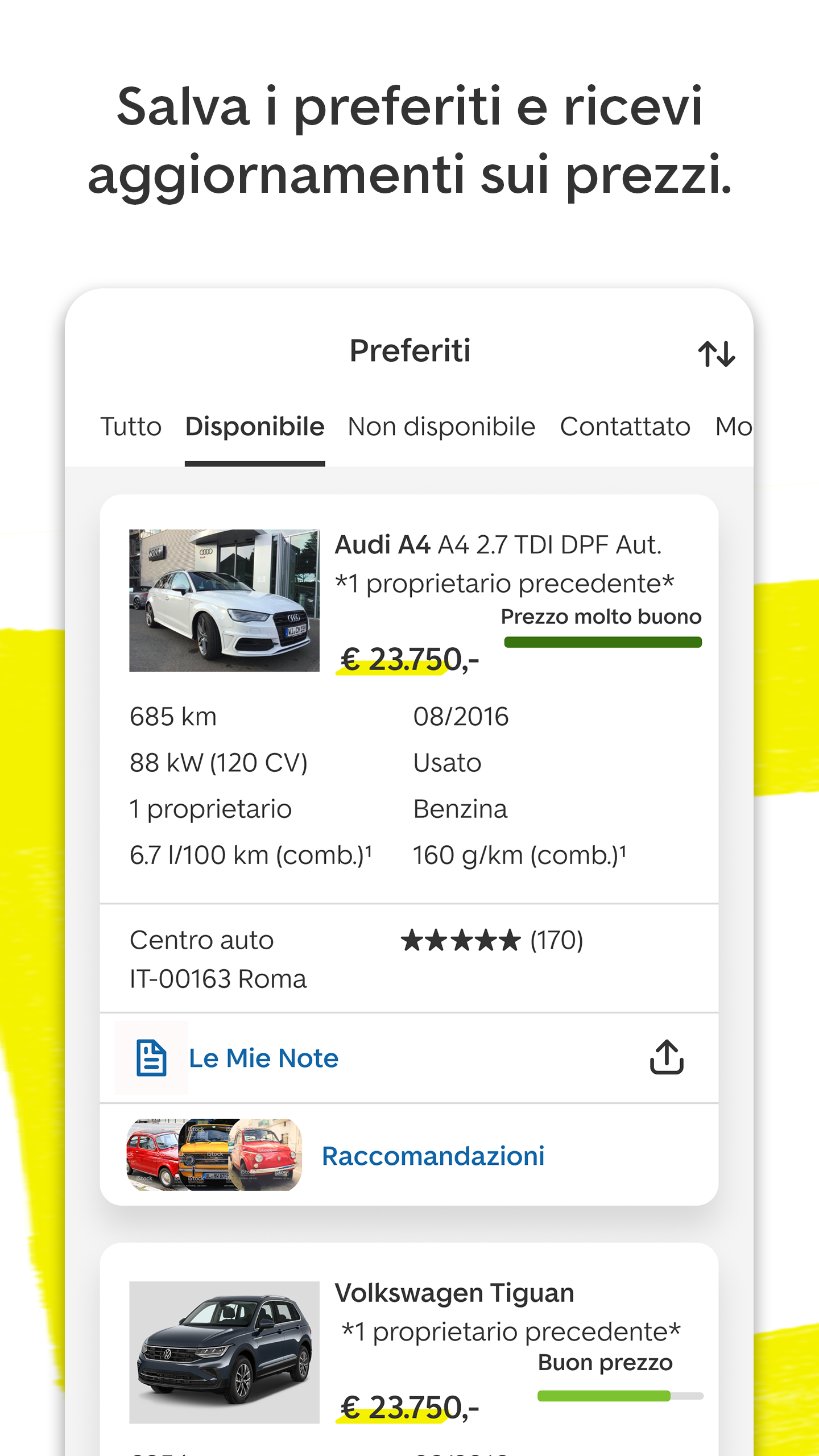 Salva le tue macchine dei sogni e condividile! Salva le tue auto preferite nella sezione appunti, ricevi informazioni sul prezzo, confronta le offerte salvate o condividile con gli amici.