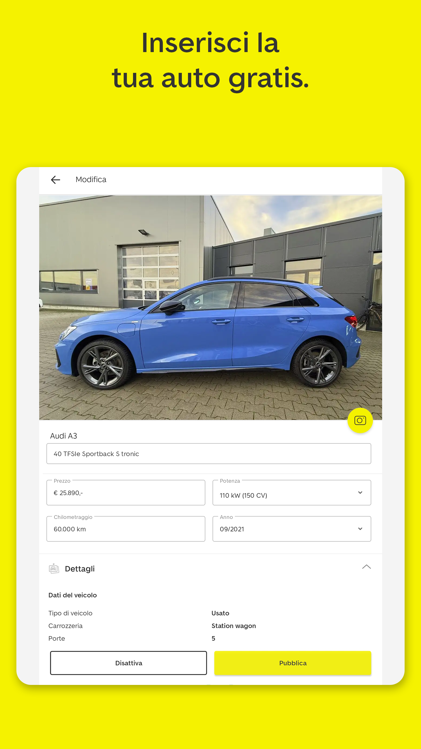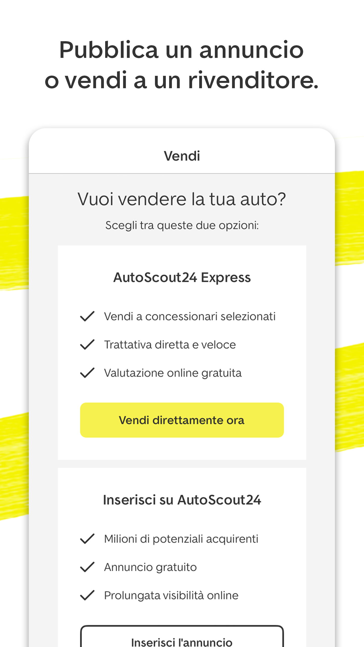 AutoScout24: Vendi la tua macchina in modo facile e professionale tramite il tuo smartphone Vuoi vendere la tua auto tramite app? Crea facilmente il tuo annuncio. Carica le foto della tua auto, ricevi una valutazione gratuita e raggiungi milioni di acquirenti!
