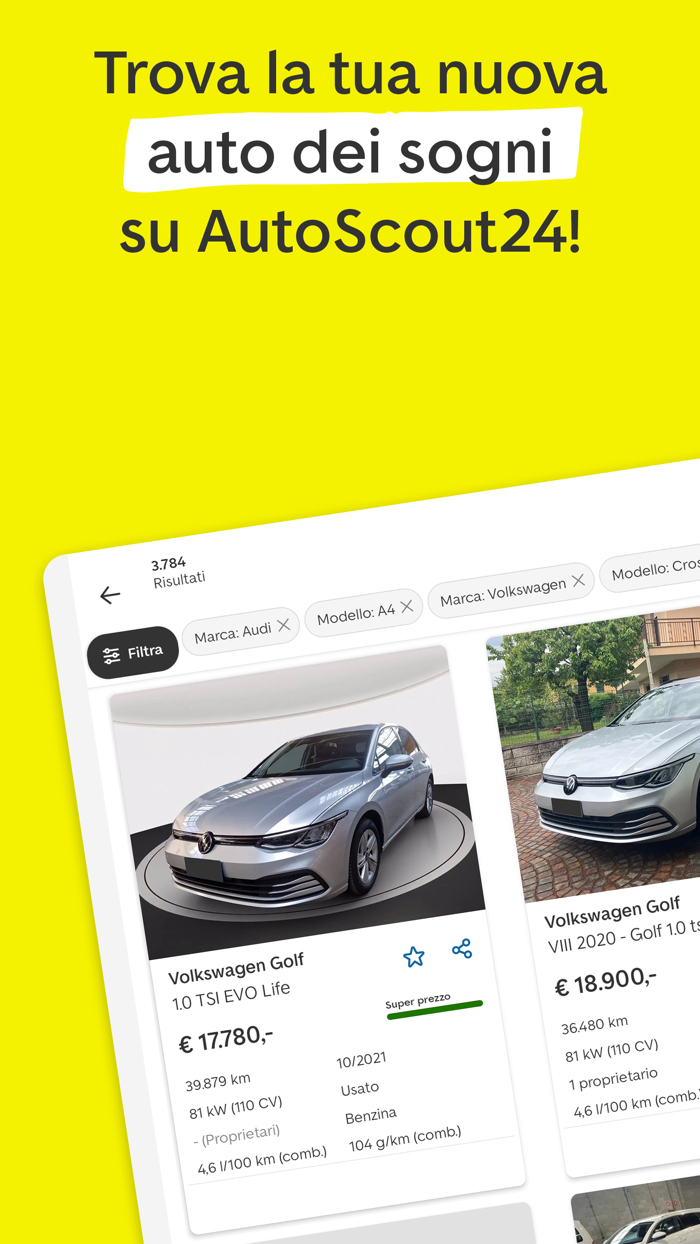 Facile e veloce Con l'app AutoScout24 è facilissimo comprare auto usate o nuove! Puoi persino vendere la tua auto usata dal tuo smartphone e ottenere una valutazione gratuita per determinarne il valore di mercato. Sei interessato a comprare un'auto? Individua la tua vettura ideale, nuova o usata e confrontati con i tuoi amici su Whatsapp.