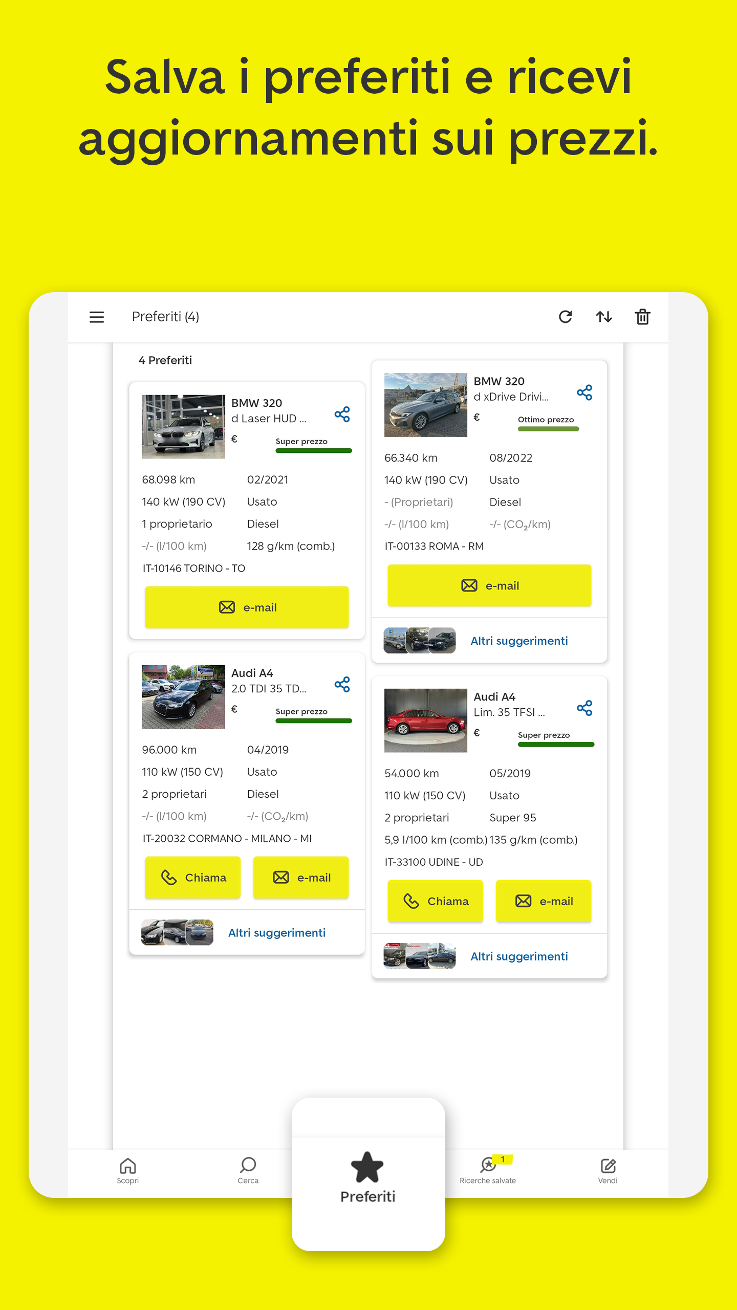Sempre aggiornati con la app AutoScout24 Calo dei prezzi, ultime offerte e modifiche agli annunci salvati: ricevi subito una notifica dalla nostra app direttamente sul tuo smartphone.