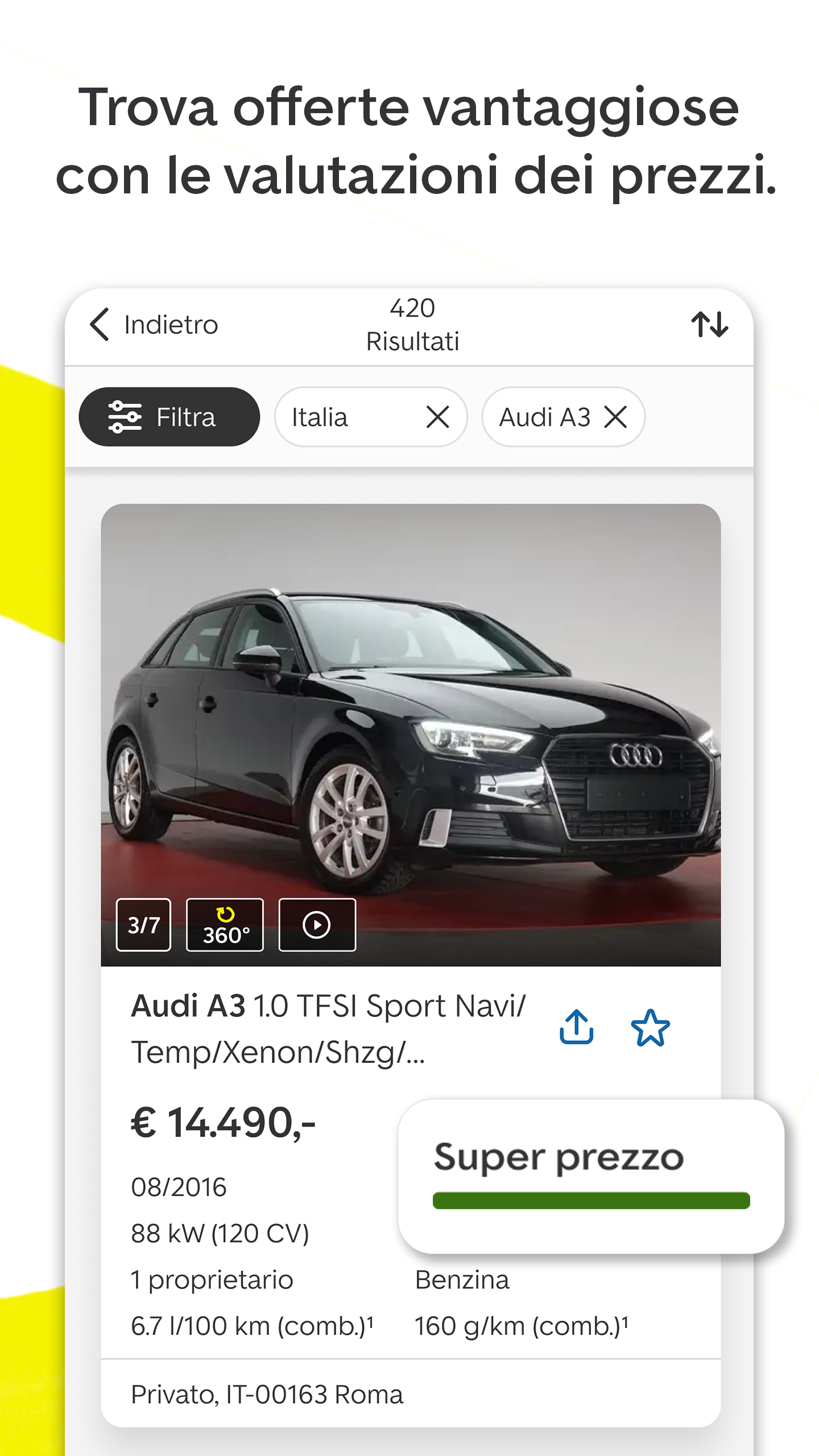 Non perderti nessuna occasione: AutoScout24 è una delle migliori app per la ricerca e vendita auto, perfetta per trovare auto nuove o usate, auto elettriche, moto, furgoni e camper. Sulla nostra app puoi pubblicare un annuncio per vendere la tua auto e rimanere subito aggiornato su sconti e nuove offerte o modificare le tue preferenze. Riceverai tutte le info necessarie direttamente sul tuo smartphone grazie alle notifiche della nostra app. Scopri i nuovi SuperDEALS con sconti imperdibili su tutti i modelli. La funzione di AutoScout24 appunti e i filtri di ricerca ti aiuteranno a trovare ancora più facilmente il tuo nuovo veicolo. L'app AutoScout24 è un must-have per gli appassionati di automobili in cerca della loro nuova macchina.