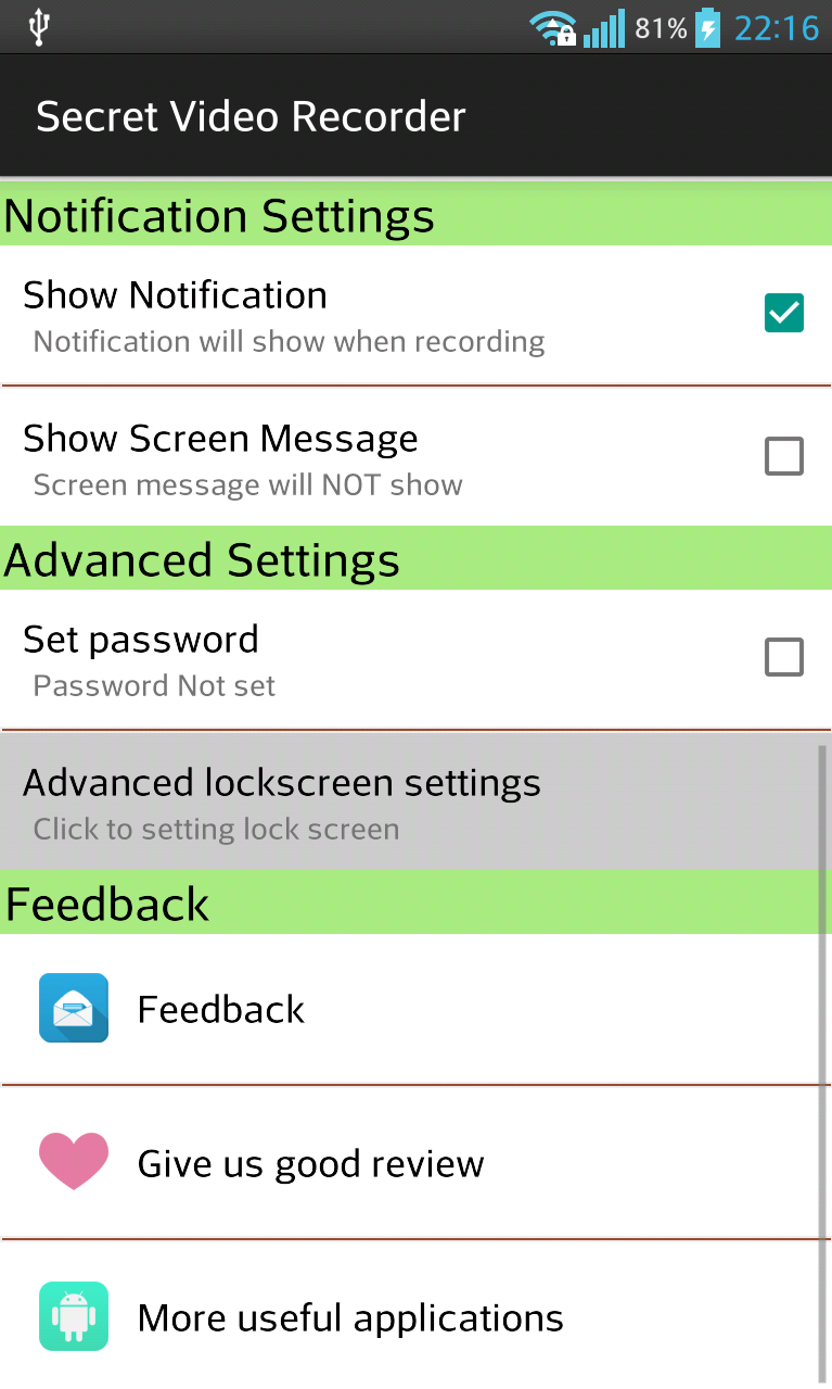 Videoregistratore sfondo. Nessun suono dell'otturatore. Anteprima. Sulla registrazione di tocco, registrazione programmata, o la registrazione automatica. Video HD. Continuare la registrazione quando lo schermo spento. Supporto passcode LockScreen di registrazione automatica quando qualcuno tenta di accedere al telefono. Molte caratteristiche utili.