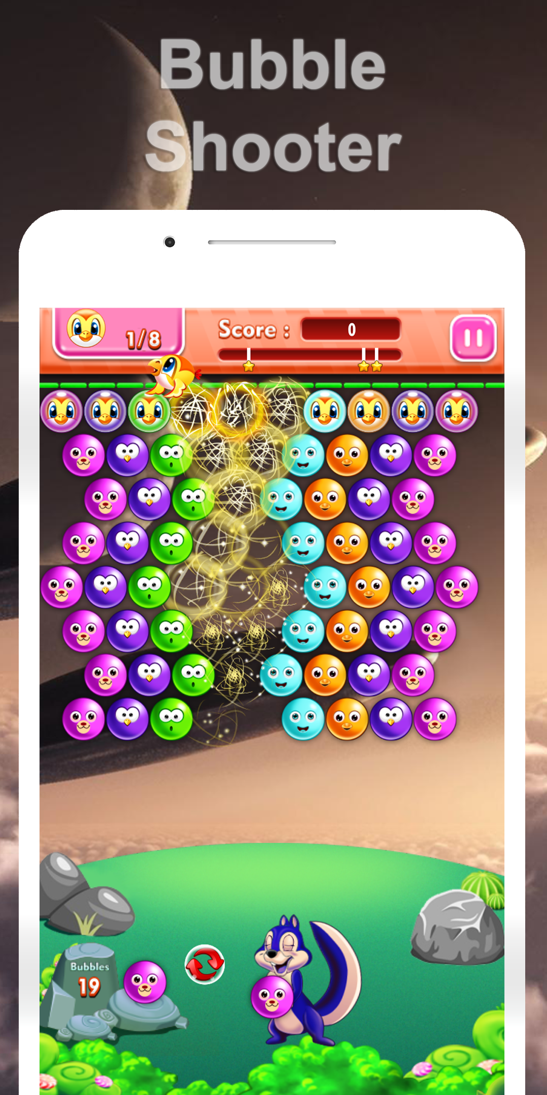 Funzioni sparatutto a bolle: - Completa tutti i puzzle con le palle - 120 emozionanti puzzle a bolle creati da designer professionisti - Modalità di gioco multiple: modalità di tiro infinita e passaggio di livelli individuali - Controlli semplici: basta toccare lo schermo per sparare ATTENZIONE: Il nostro bubble shooter 2019 è gratuito e molto avvincente, quindi assicurati di fare pause ogni 15 minuti per non affaticare la vista.