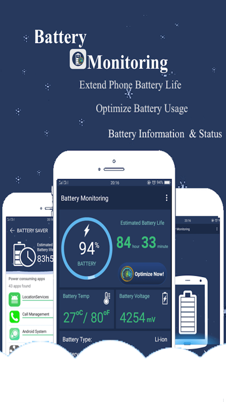 Battery Monitor e Battery Saver ti aiuteranno a rilevare le app con un elevato consumo di batteria e potrai chiuderle facilmente selezionando qualsiasi processo che vuoi uccidere per estendere la durata della batteria all'uso del telefono. Battery Monitoring è un'app di batteria leggera, veloce e intelligente che consente di risparmiare la durata della batteria e migliorare la salute della batteria, Battery Saver è un'applicazione essenziale e dovrebbe essere installata per tutti i dispositivi Android. Scarica e goditi il Battery Monitor per ottimizzare il dispositivo Android della batteria e proteggere la batteria del telefono dal drenaggio.