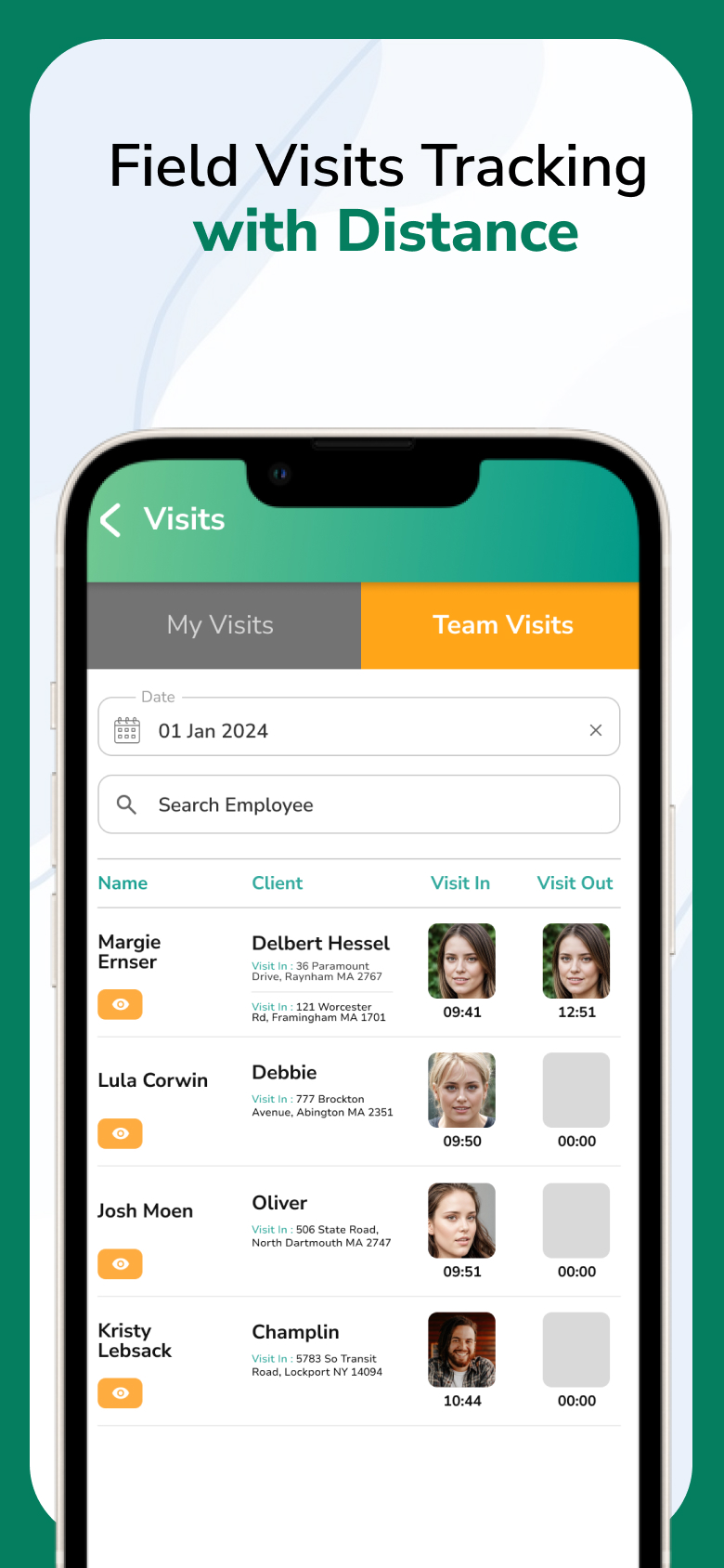 7. Monitoraggio delle visite: Monitora le visite del personale sul campo con foto, luogo e orario da remoto. Strumento di monitoraggio delle presenze per consentire ai manager di controllare le presenze da qualsiasi luogo.