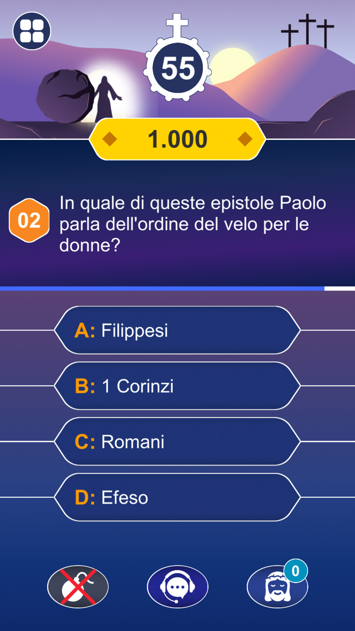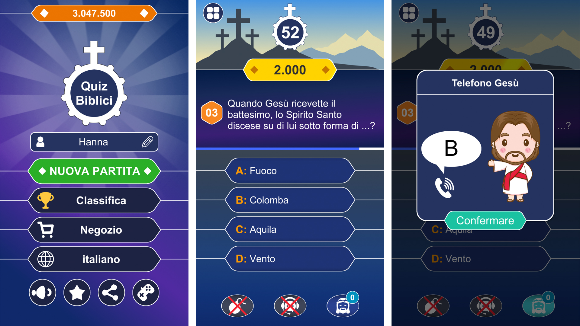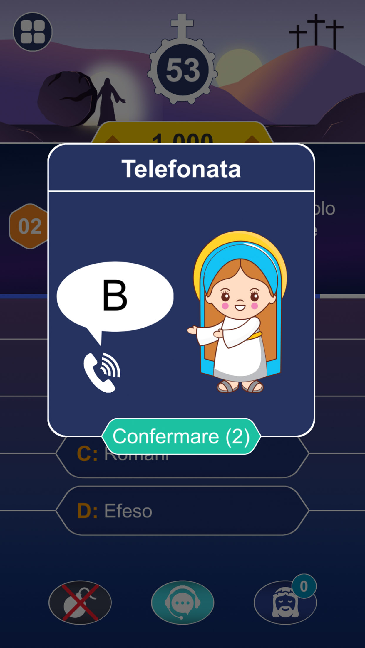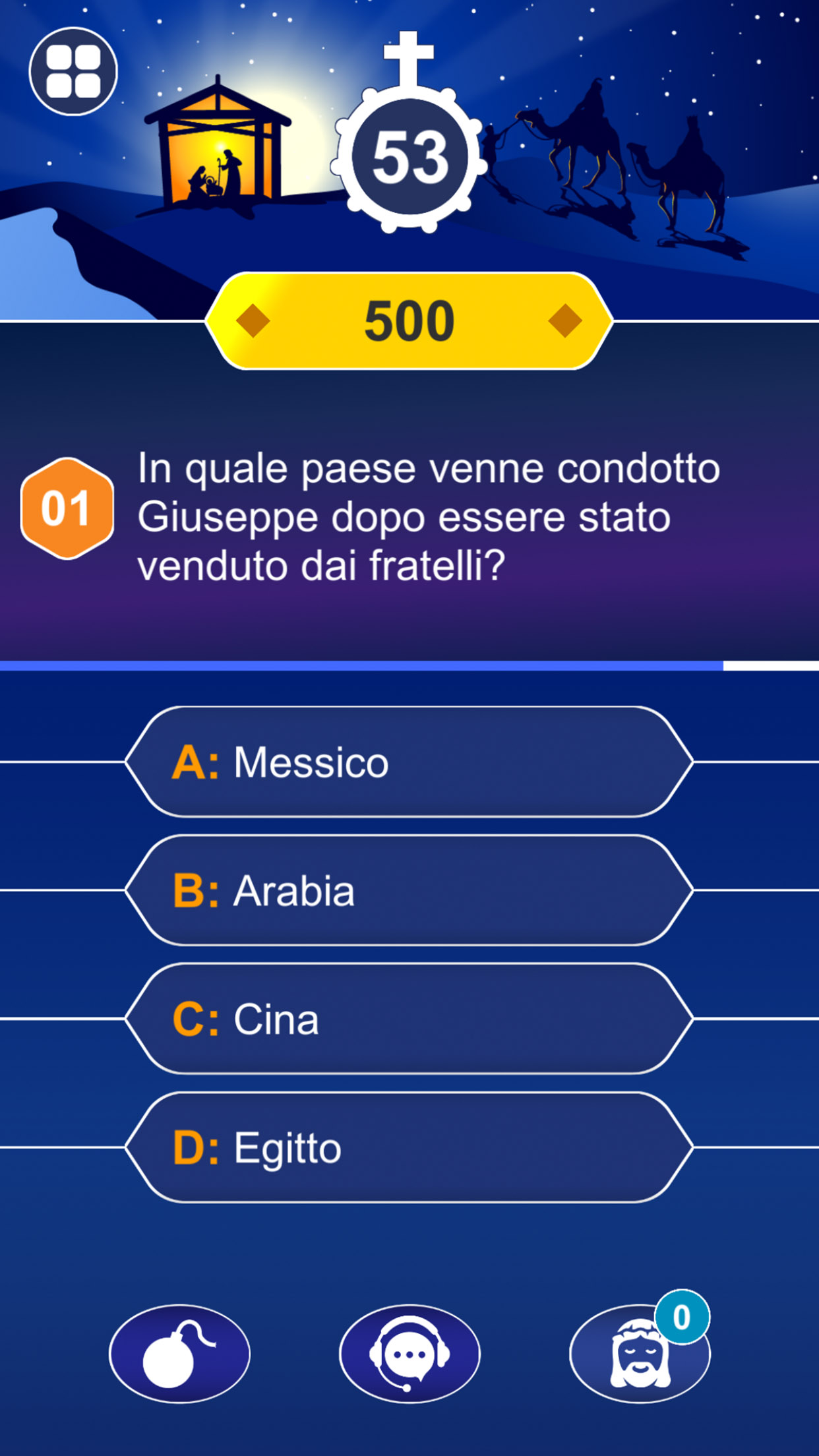 Se ti imbatti in una domanda Indovinelli Bibbia difficile, puoi utilizzare l'aiuto 50:50, consultare il pubblico o chiamare una persona cara. Specialmente gli esperti della Bibbia: Geoguessr, Discepolato, Maria, God, Dio, san Giuseppe e Gesù sono sempre qui per assistervi nella vostra vittoria.
