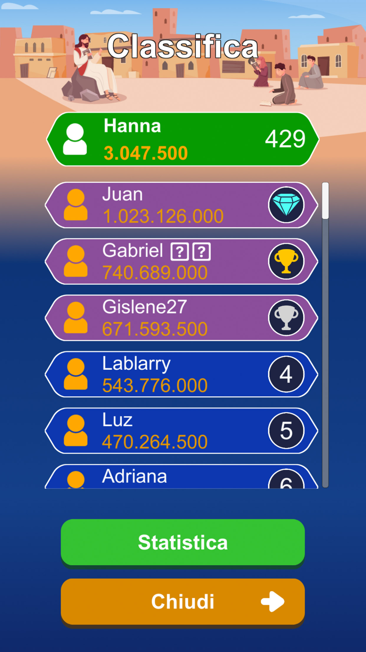 Gioco a Quiz Cultura Generale Biblici ha anche una classifica costantemente aggiornata per farti battere te stesso e competere con gli altri.