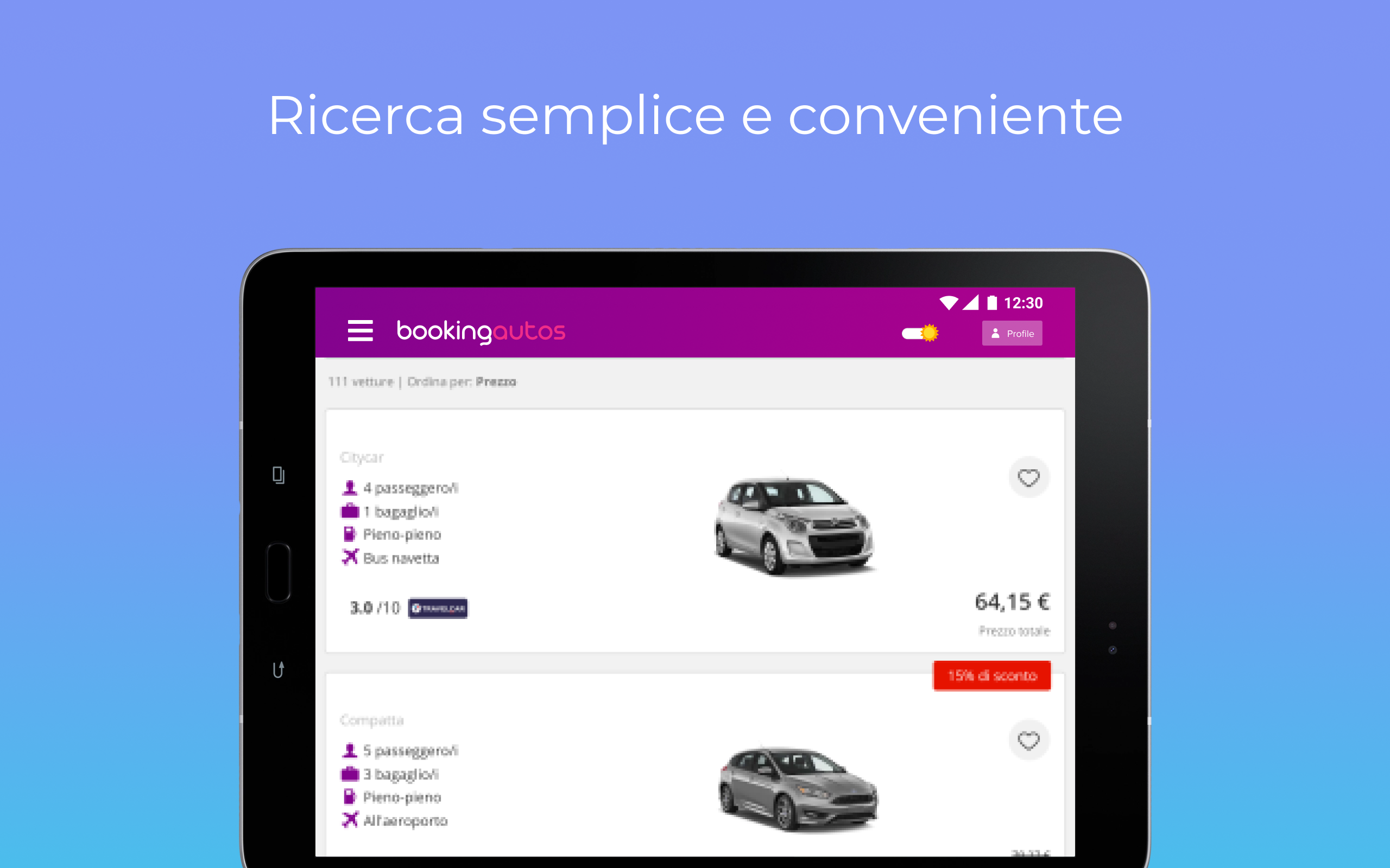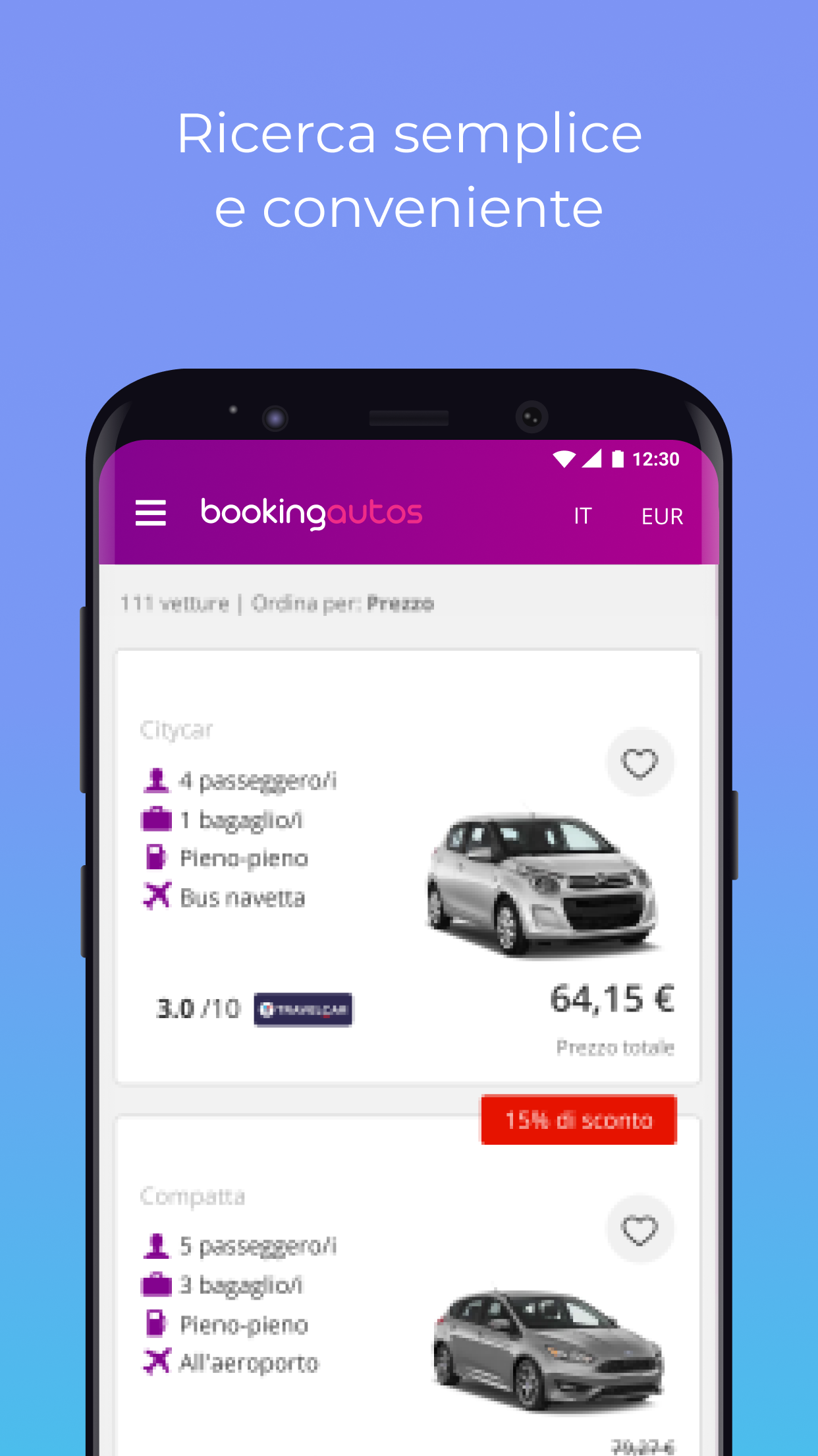Booking auto è un modo semplice per noleggiare un’auto!Le offerte migliori da tutte le compagnie di noleggio auto, in un’unica applicazione - confronta i prezzi e risparmia fino al 70%.