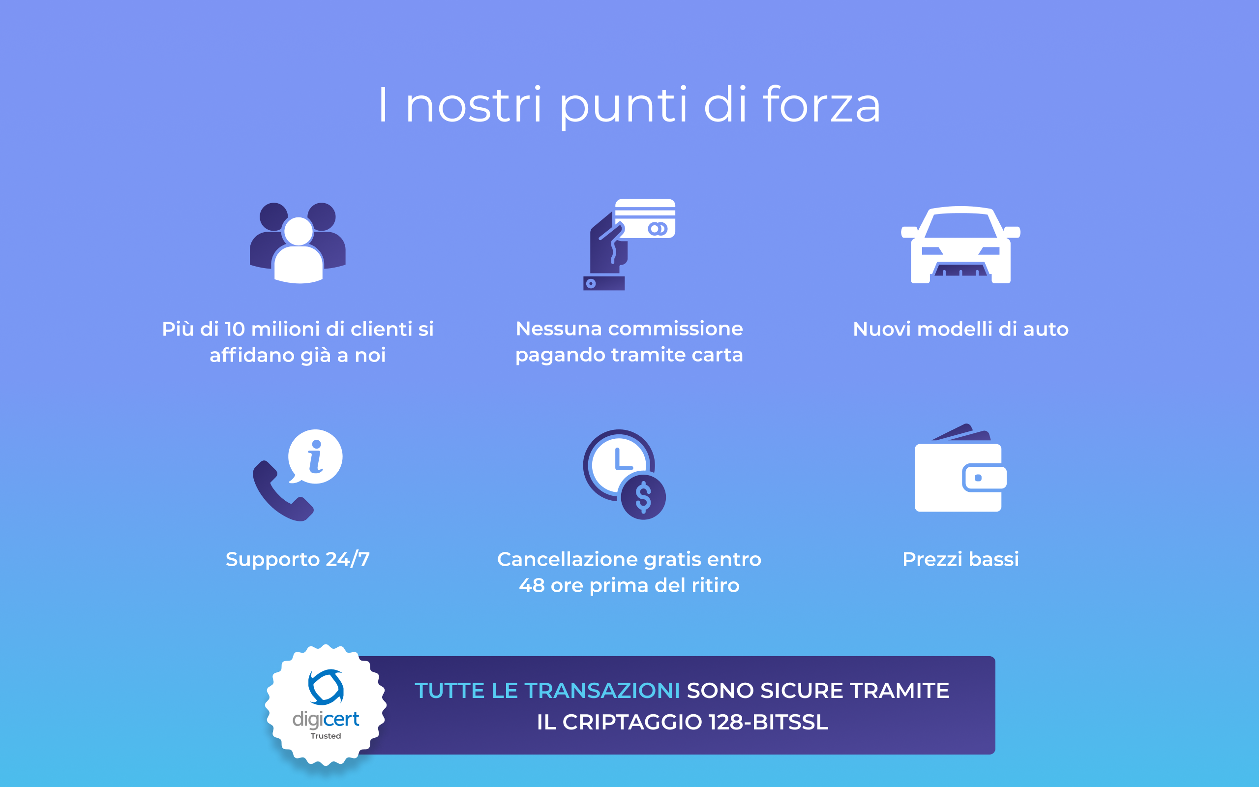 Collaboriamo con tutte le compagnie di noleggio auto più conosciute ed affidabili operanti in 180 paesi in tutto il mondo.